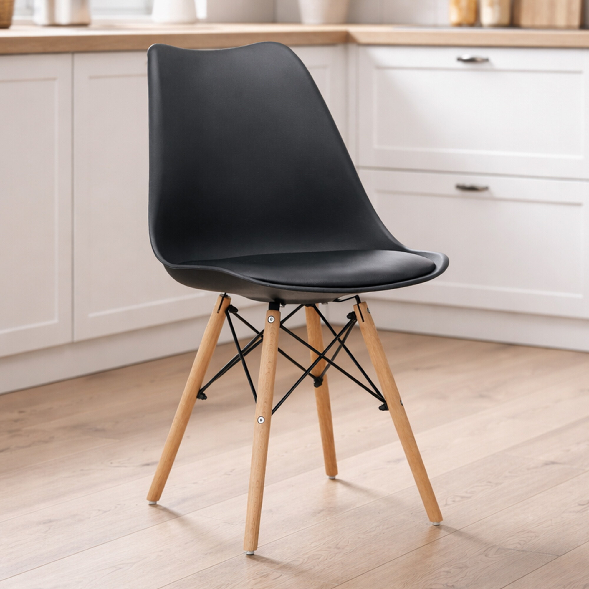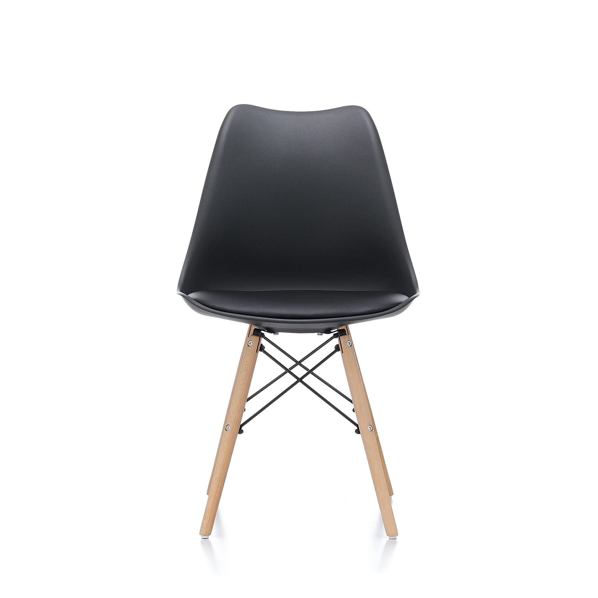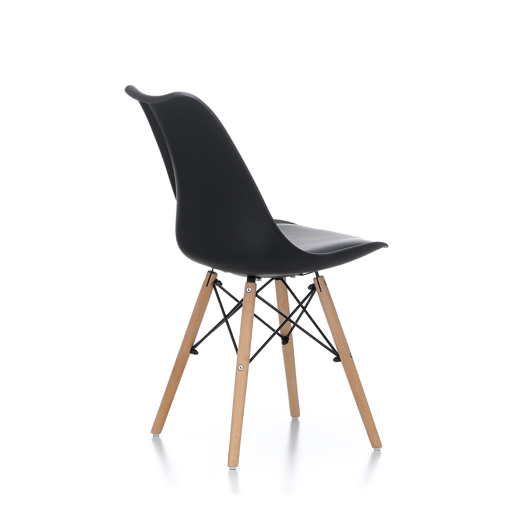 Stolica je izrađena od kvalitetnog i izdržljivog polipropilena s jastukom presvučenim umjetnom kožom u kombinaciji s nogama od bukovog drveta.