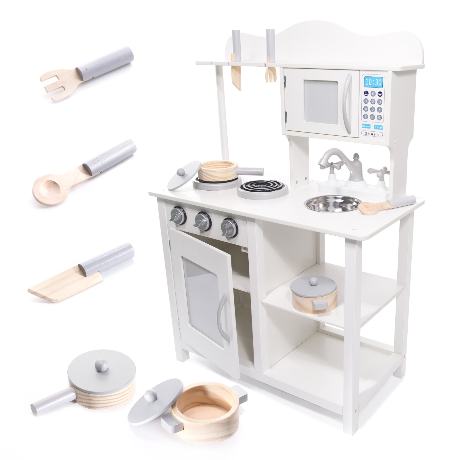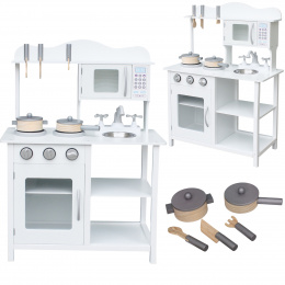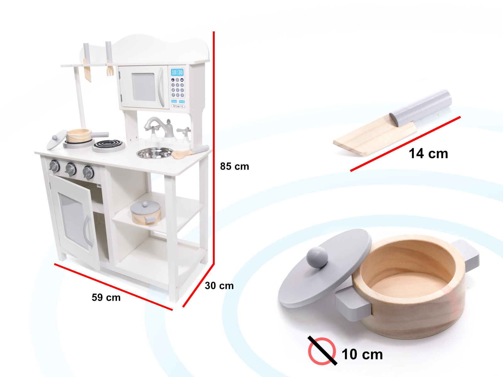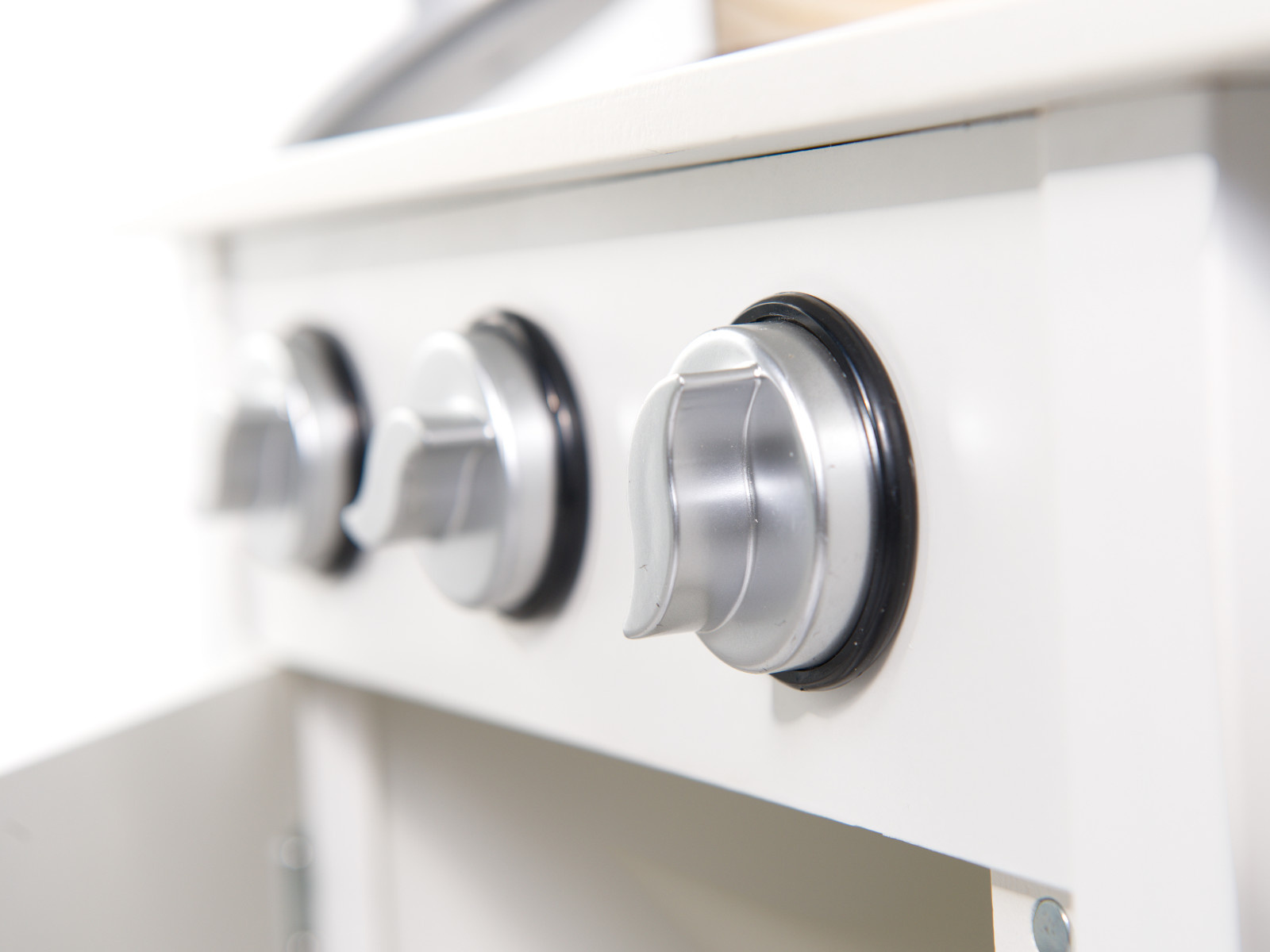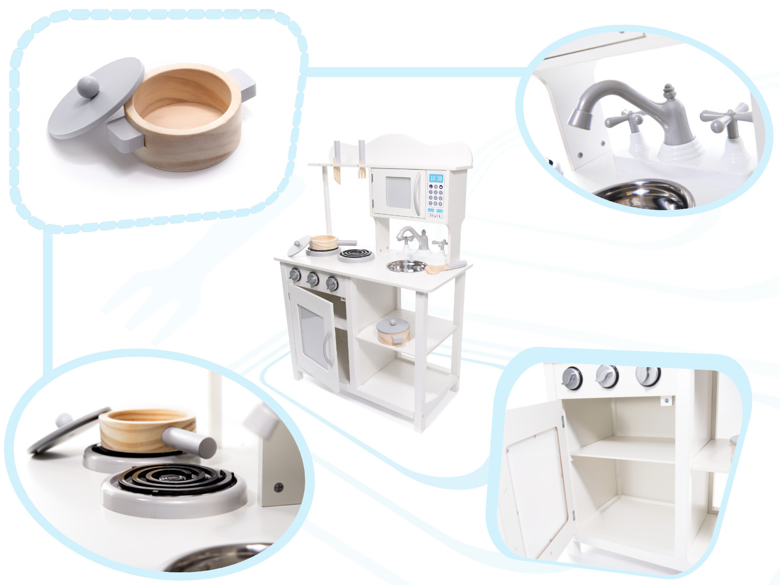 Naše velike i elegantne drvene kuhinje odgovaraju svakoj dječjoj sobi. Bijela univerzalna boja podsjeća na tradicionalne kuhinje, što će omogućiti vašem djetetu da se još više uključi u igru.