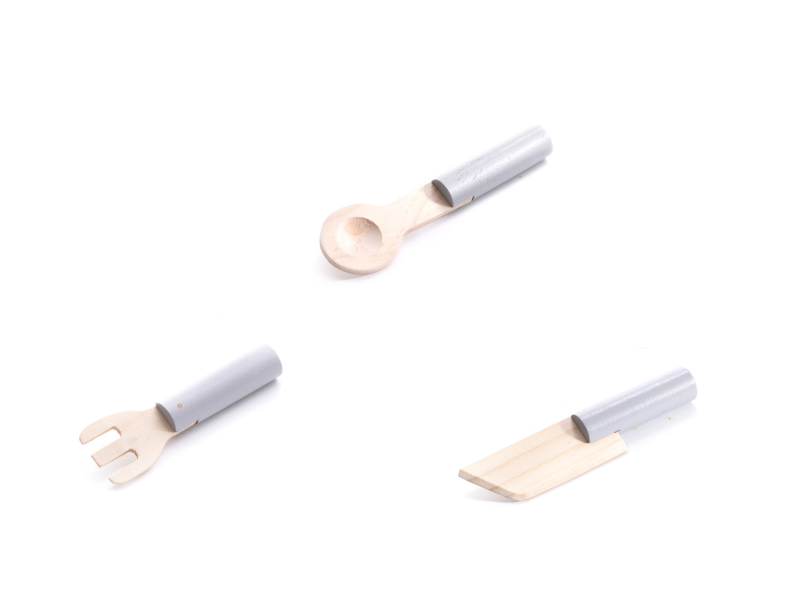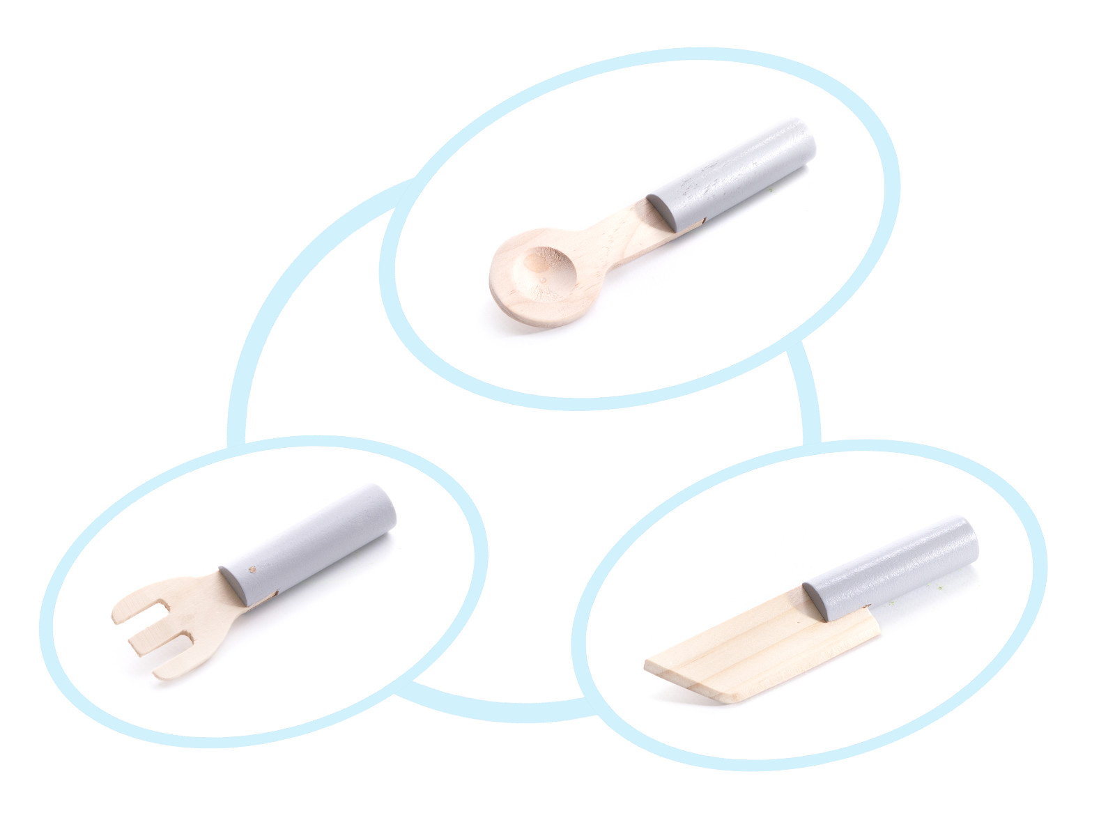 Štednjaci su opremljeni s dva plamenika s osjetljivim gumbima, na koje možete postaviti priložene lonce i tave (s poklopcima). Igračke su izrađene od drveta.