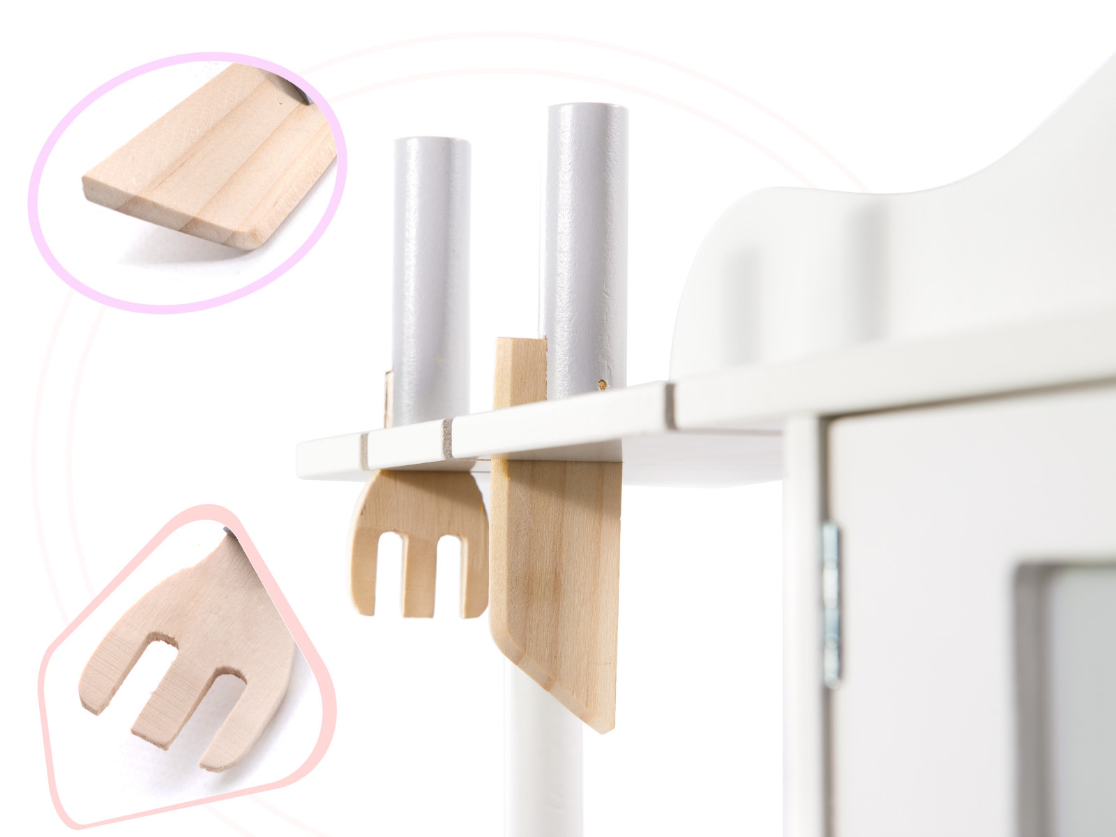 Naše drvene kuhinjice za djecu također imaju dodatne police za lonce i namirnice. Ormarić s policom opremljen je vratima koja se zatvaraju pomoću magneta.