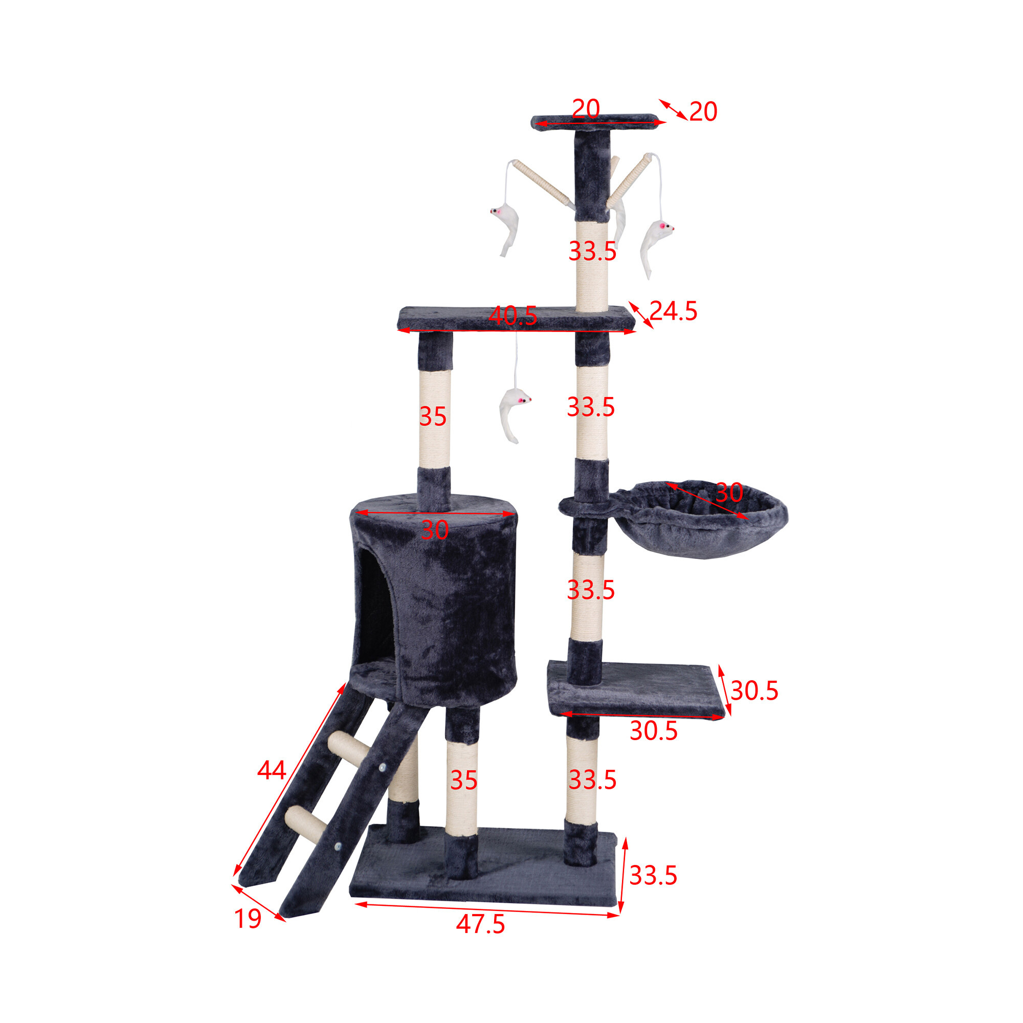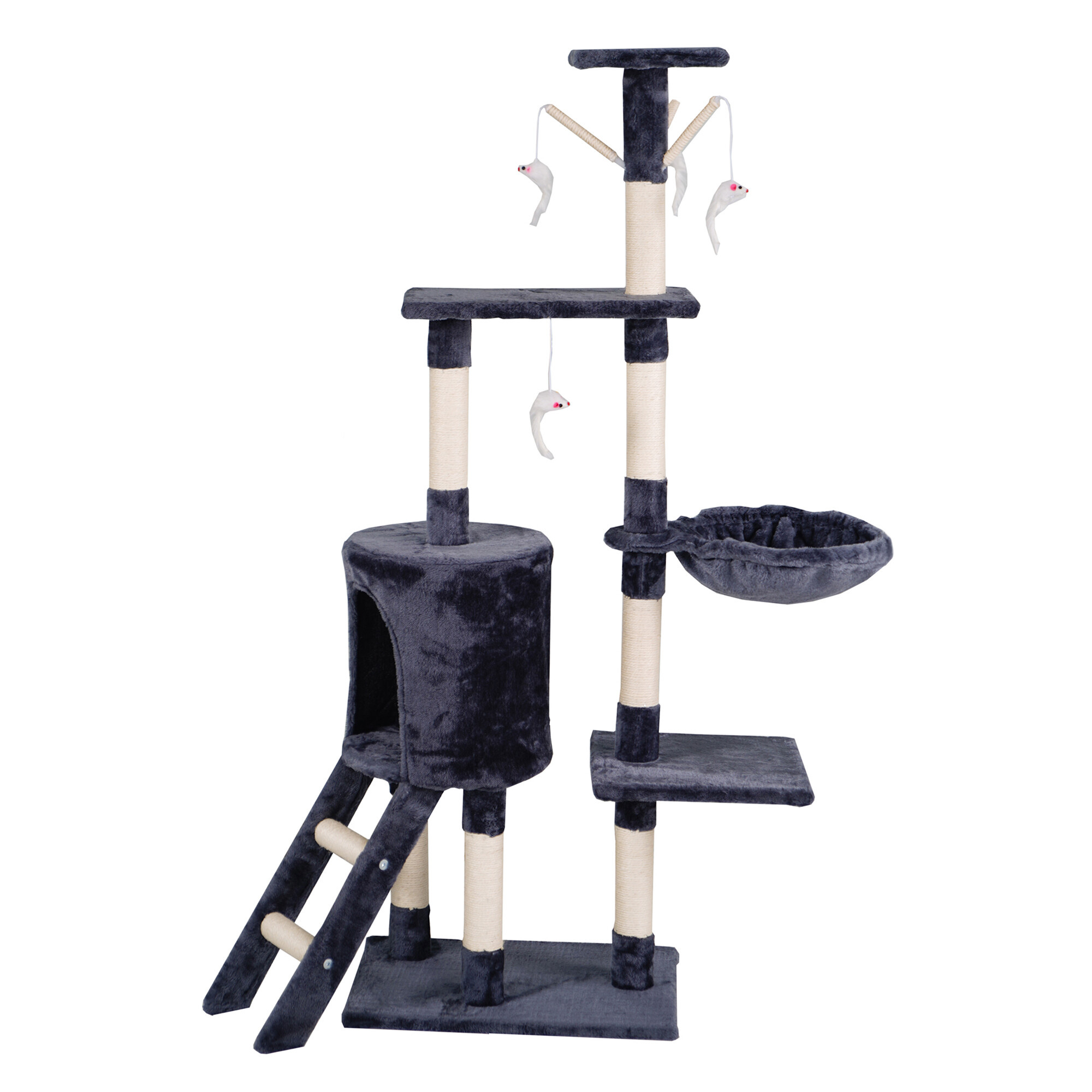 - Grebalica sadrži: 1 kućicu za skrivanje, 4 odmorišta, ljestve, 4 igračke miševe pričvršćene na elastičnim užadima i stupove djelomično prekrivene sisalom