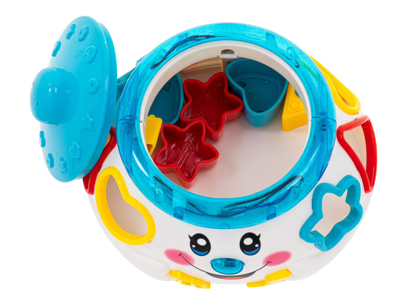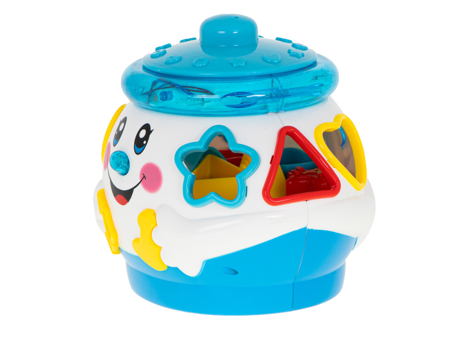 - Set dodatno sadrži 6 kockica različitih oblika koje dijete mora umetnuti u odgovarajuće otvore.