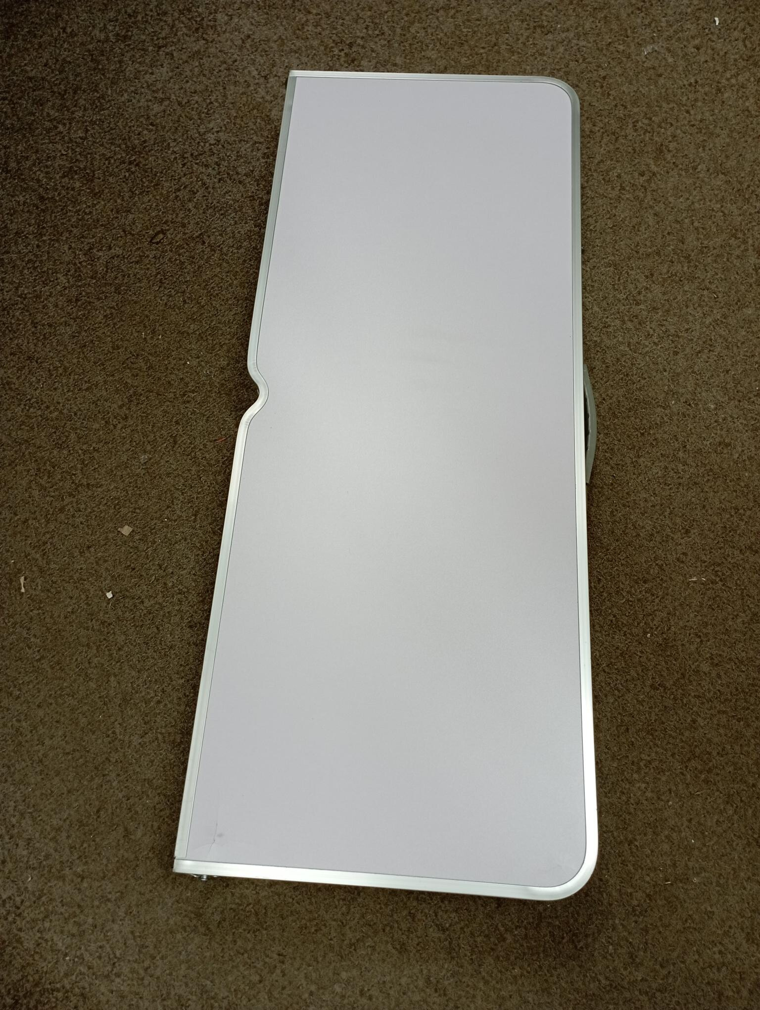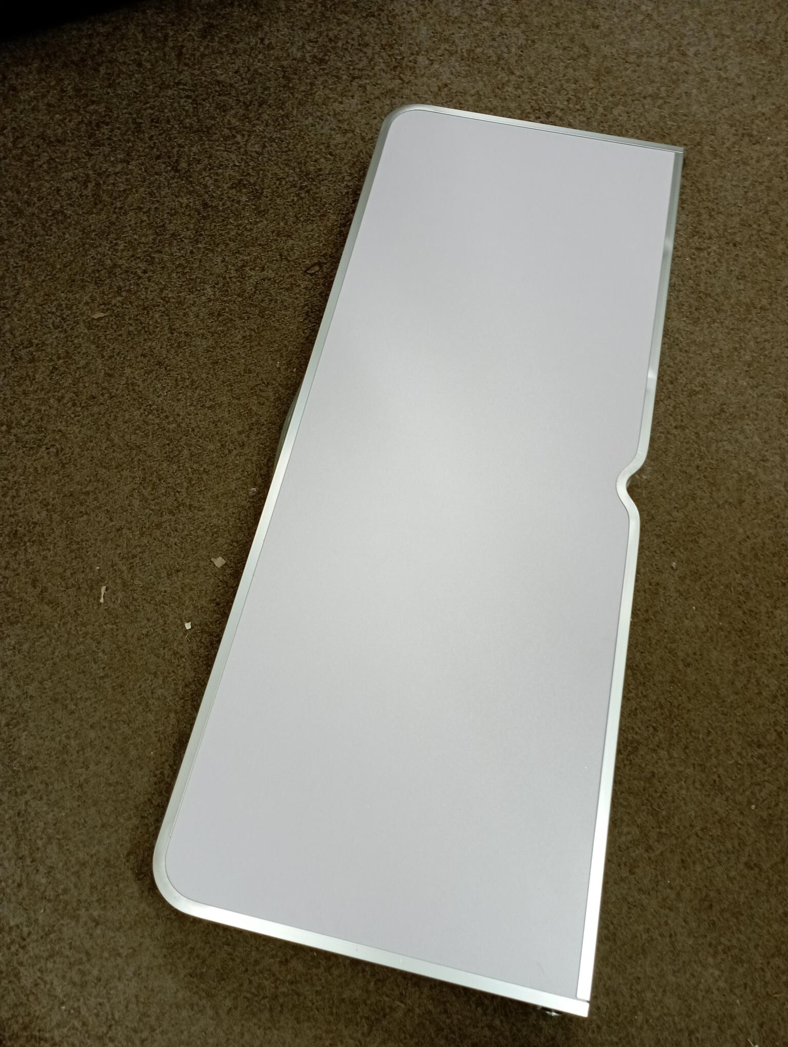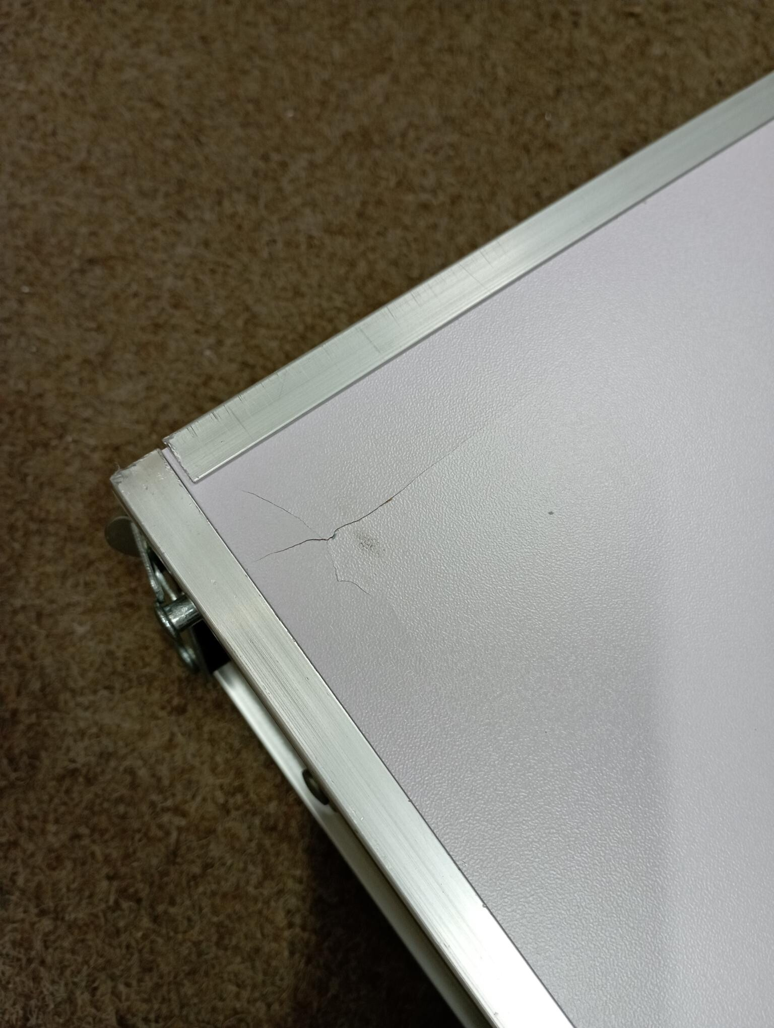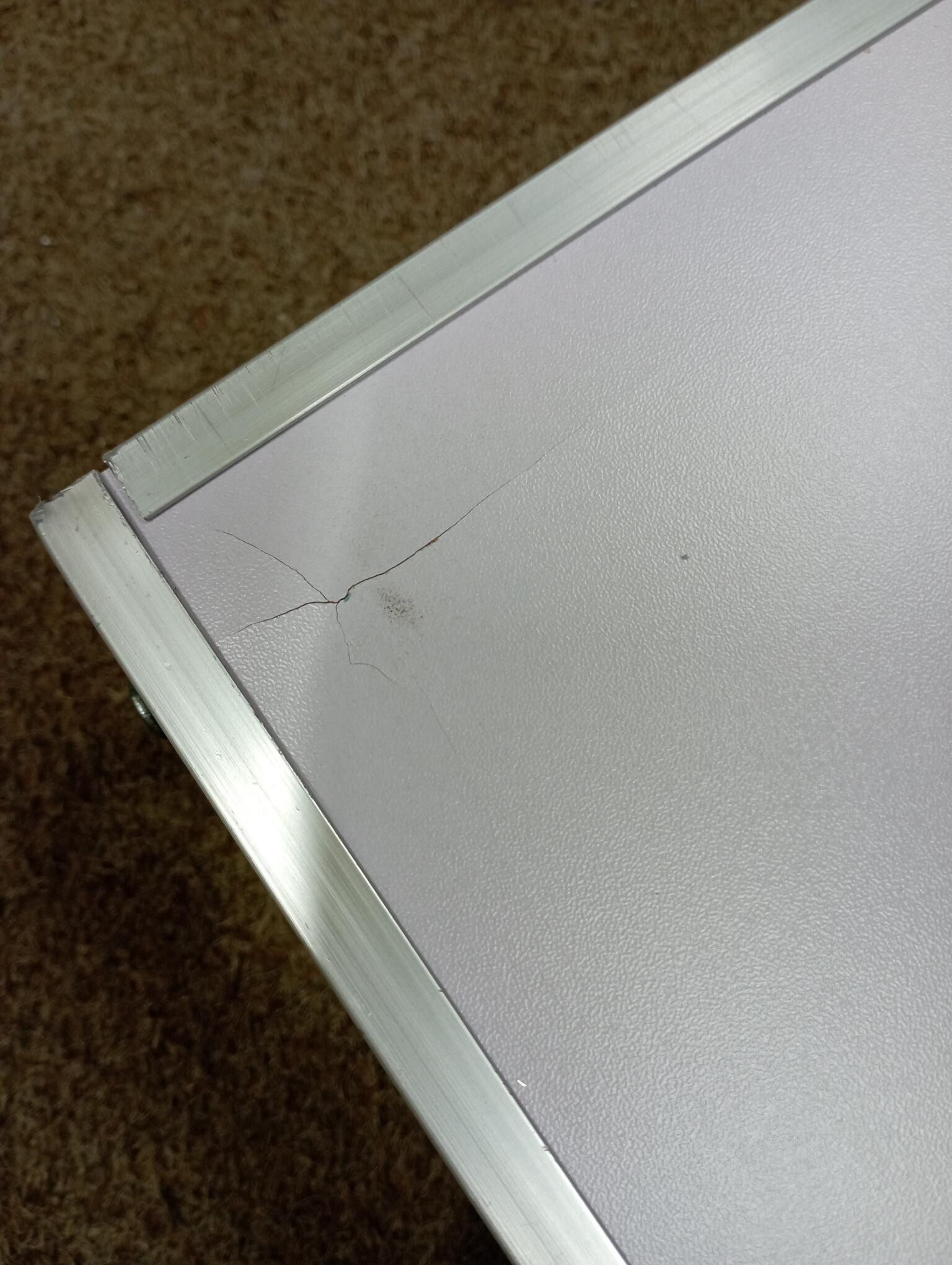Stol je kompletan i potpuno funkcionalan. Površina stola je u jednom kutu napuknuta, površina je blago izgrebana i prašnjava.