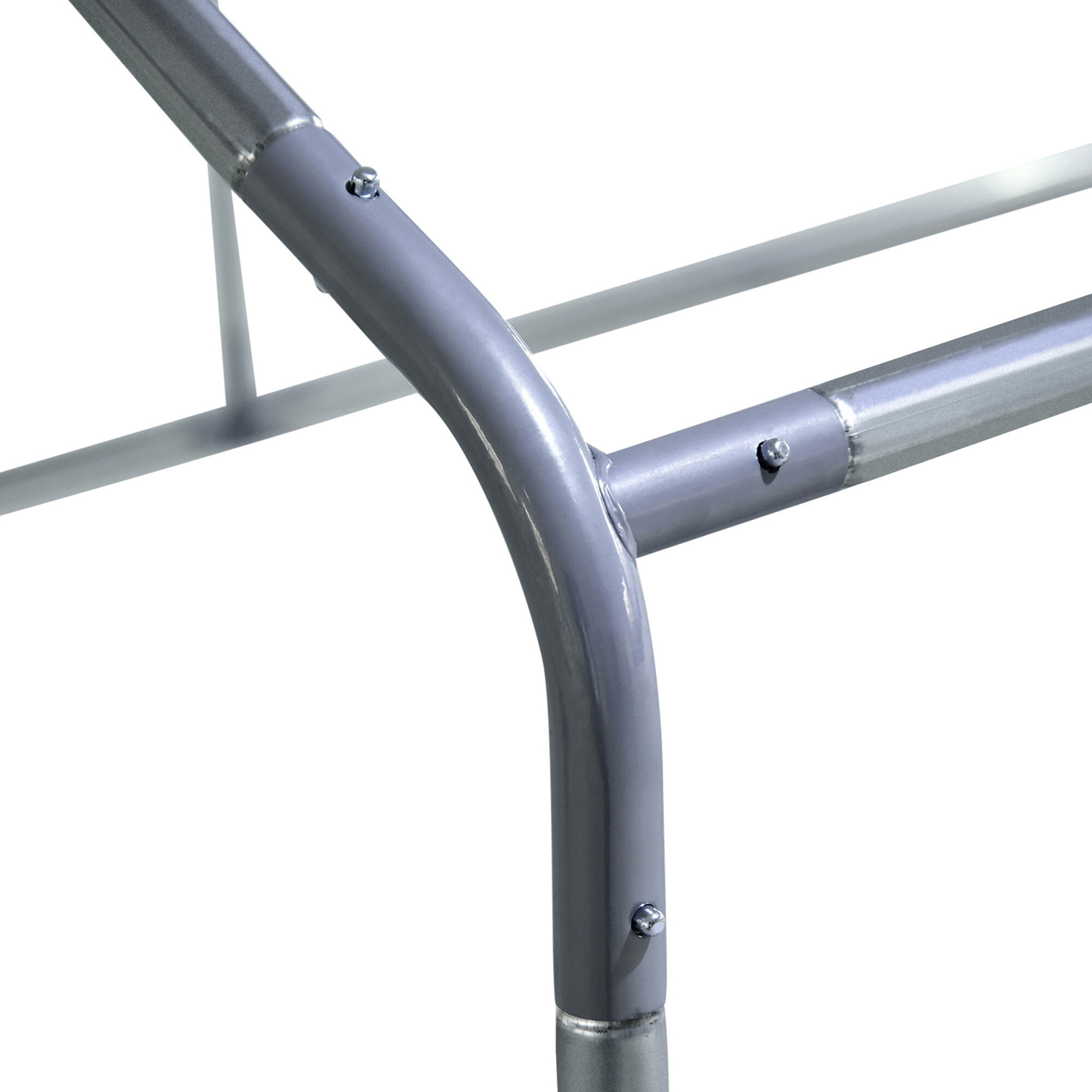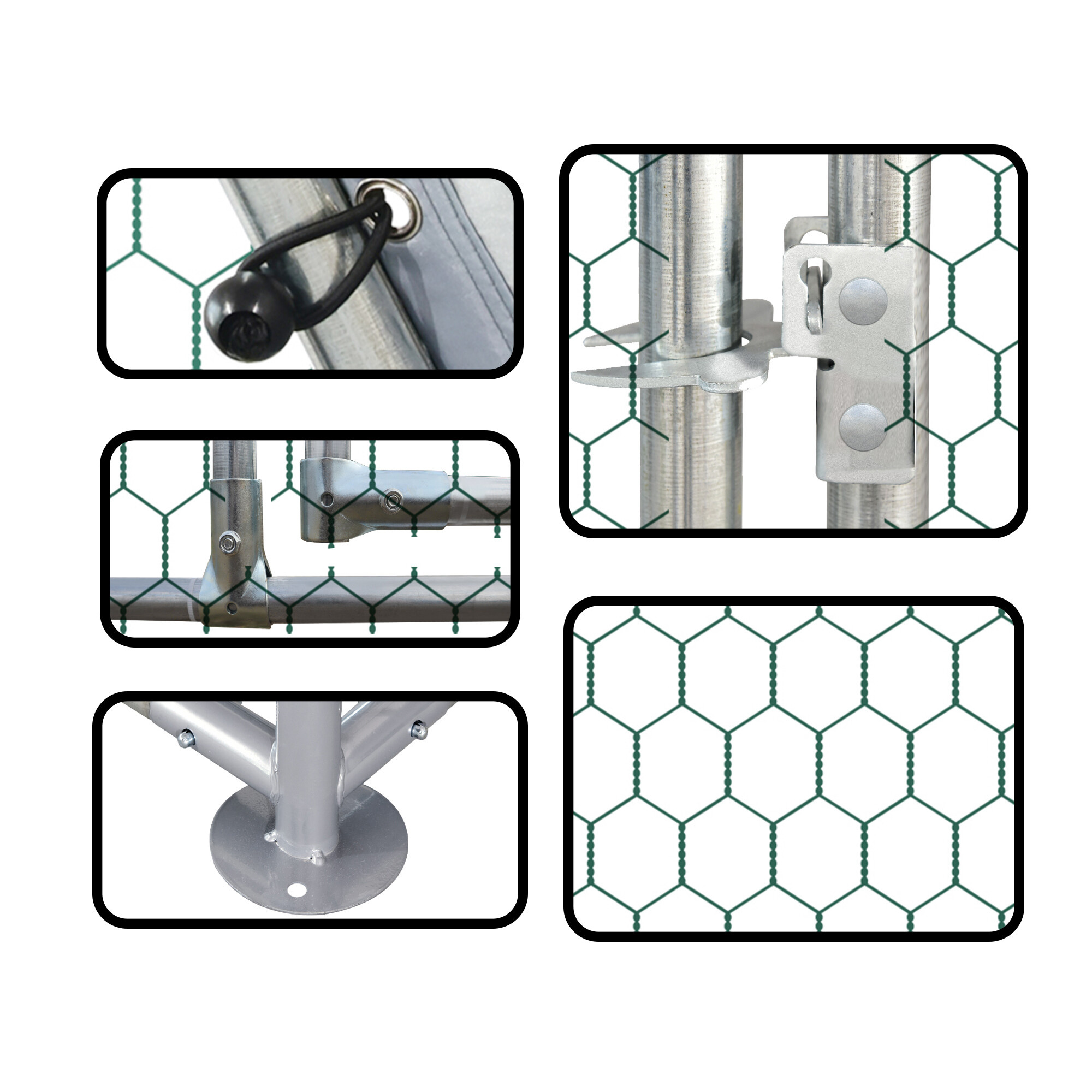 Kavez izrađen od čvrstog srebrnog pocinčanog čelika, koji osigurava stabilnost ograđenog prostora i sprječava neželjene ozljede, poput bijega vaše peradi. Konstrukcija je dopunjena s pocinčanom mrežom zelene boje i krovom koji čini sivi PVC cerada.