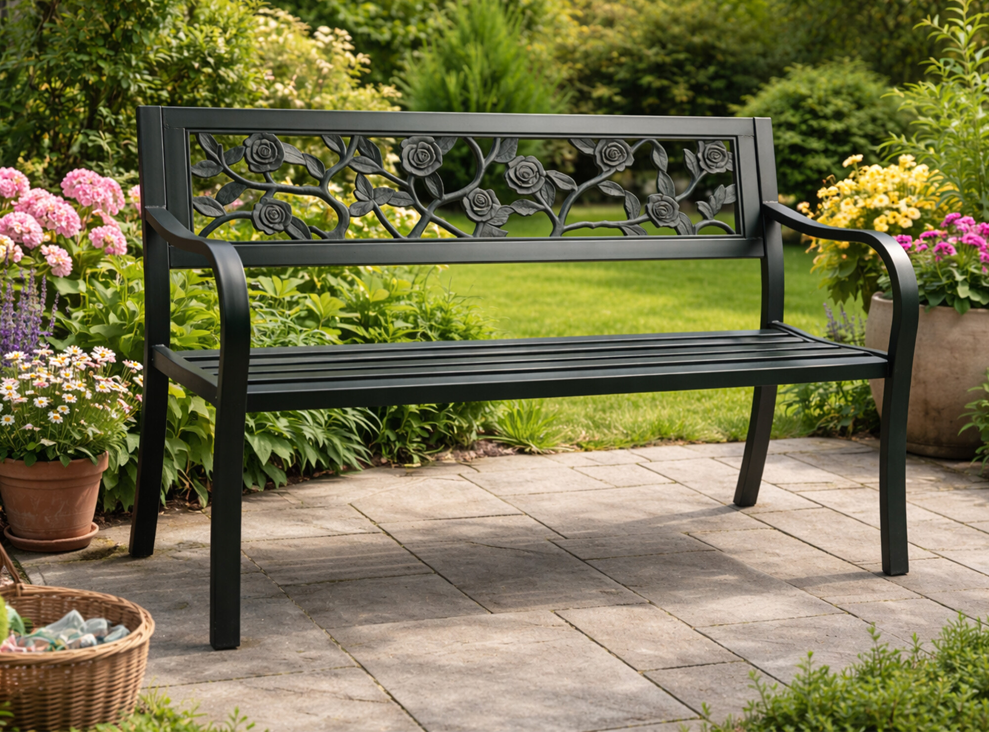 Konstrukcija vrtne klupe izrađena je od čelika i lijevanog željeza, ovi materijali su izdržljivi i istovremeno osiguravaju stabilnost. Konstrukcija klupe je opremljena površinskom obradom praškastim premazom, stoga klupa izvrsno odolijeva vremenskim uvjetima i ima dug vijek trajanja.