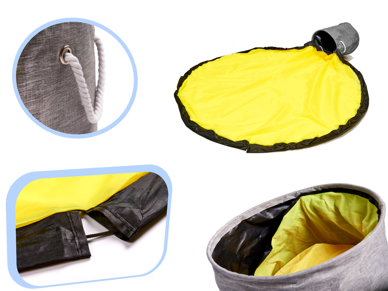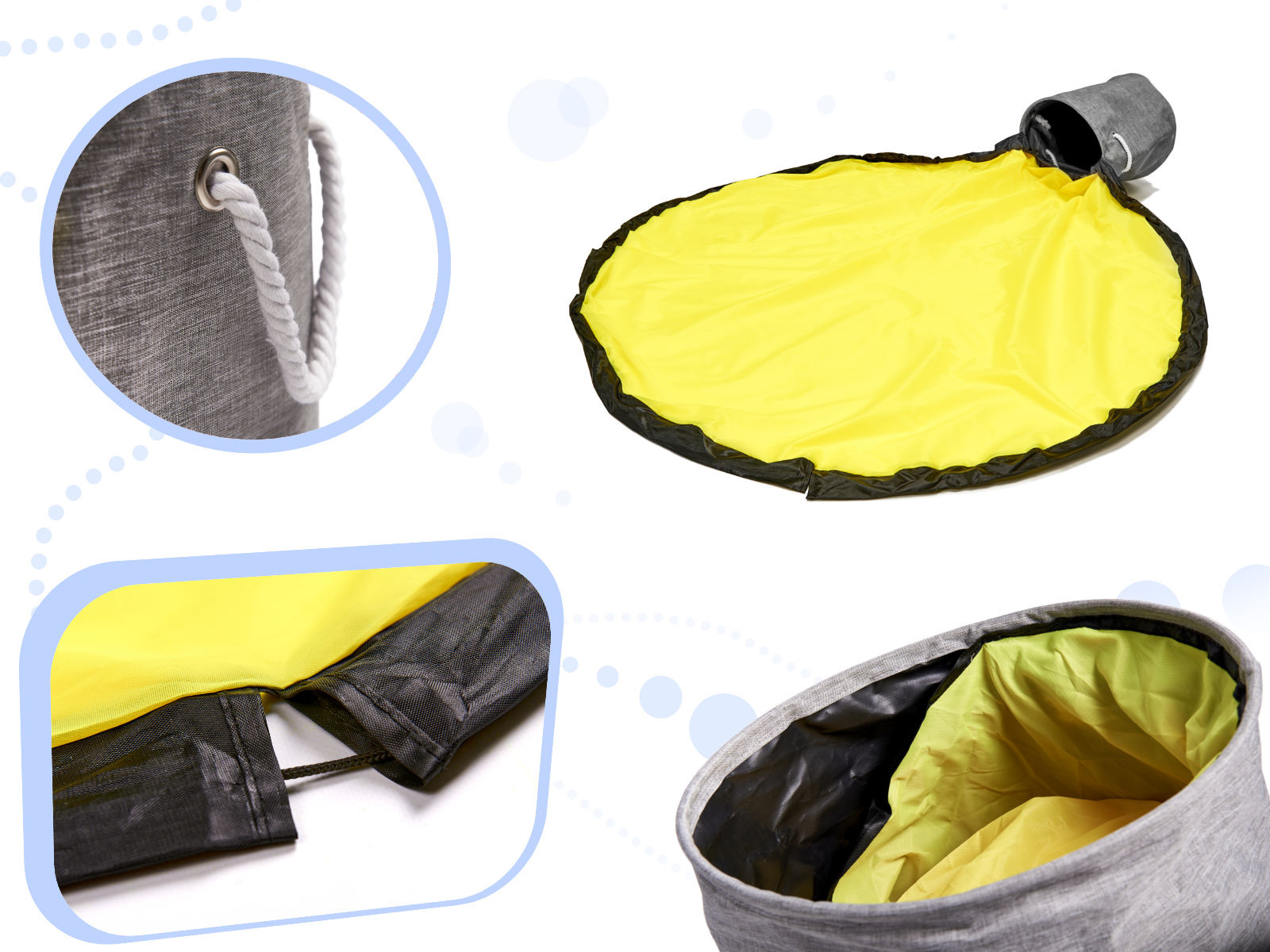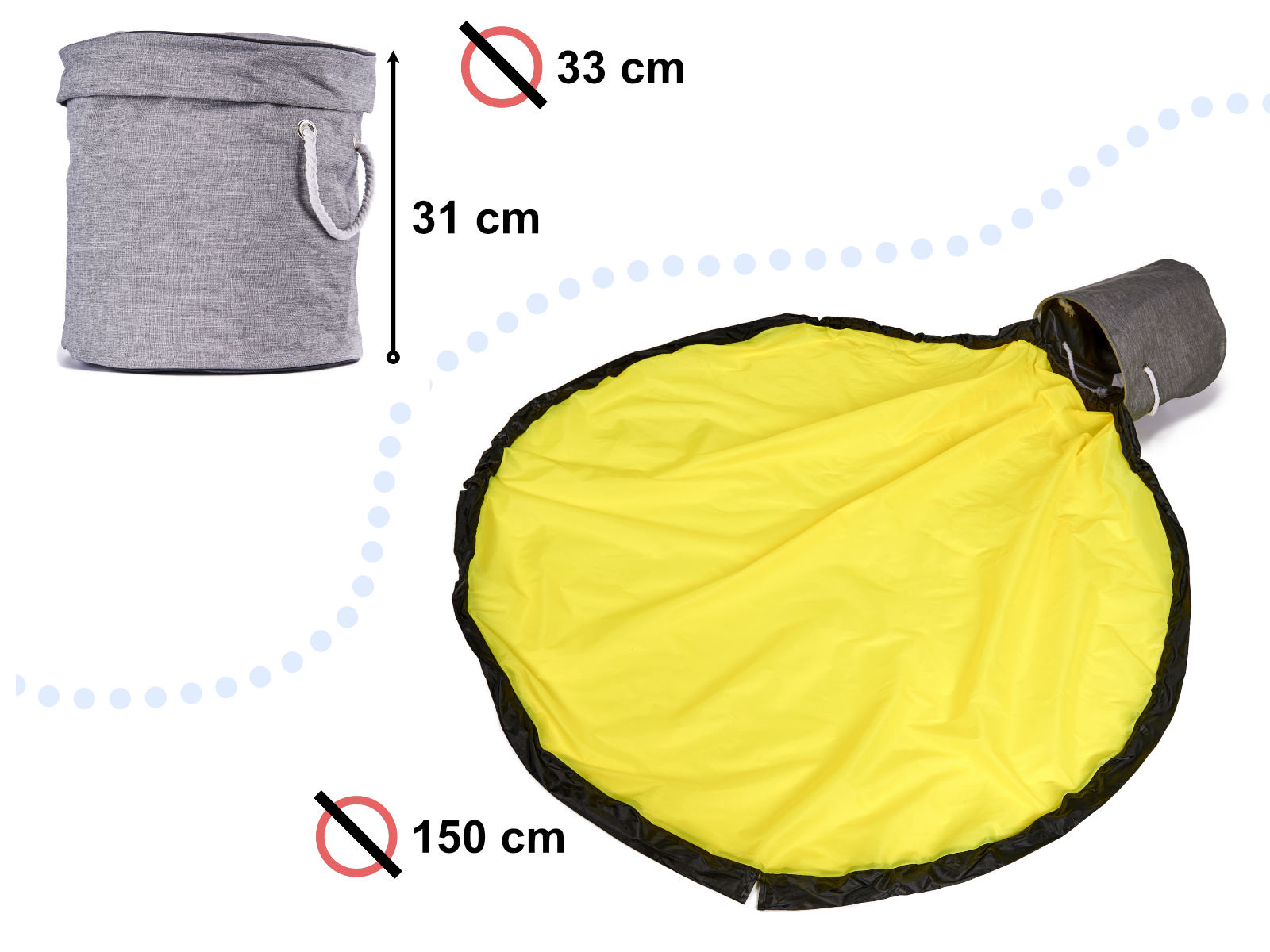 Dovedite nered pod kontrolu! Kombinacija košare i podloge savršeno je rješenje za roditelje i djecu koji cijene urednost. Ovaj alat olakšat će brzo čišćenje sobe nakon završetka igre. Samo povucite uzice smještene na podlozi i sve bacite u koš. Kocke, figurice i druge sitne igračke pospremit ćete u nekoliko sekundi. Podloga će djeci odrediti prostor za igru, kako biste nered brže imali pod kontrolom. Udobne ručke od užeta olakšavaju prenošenje igračaka iz sobe u sobu. Sjajan alat koji će zavoljeti svi roditelji. Osim toga, organizator ima poklopac koji skriva sav sadržaj.