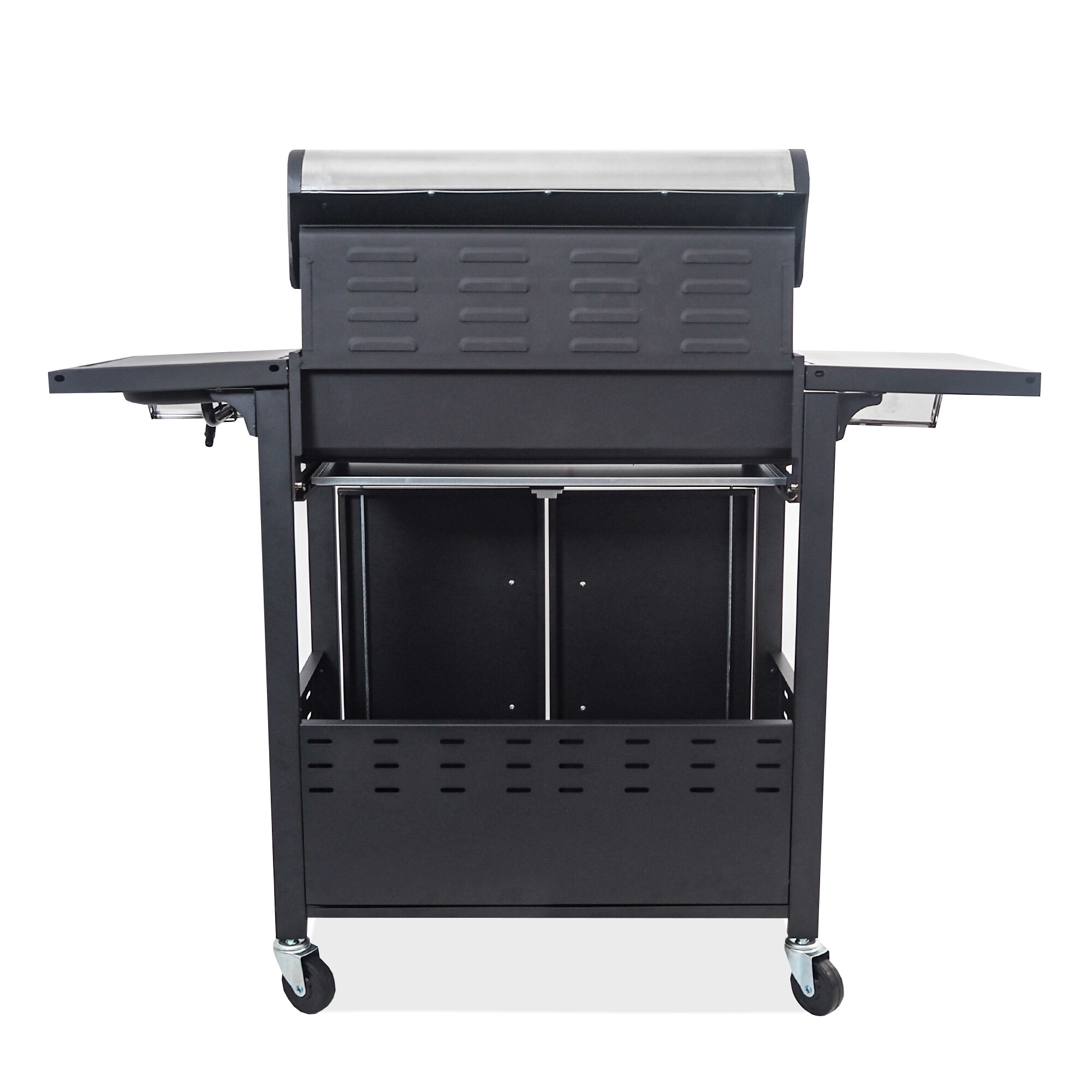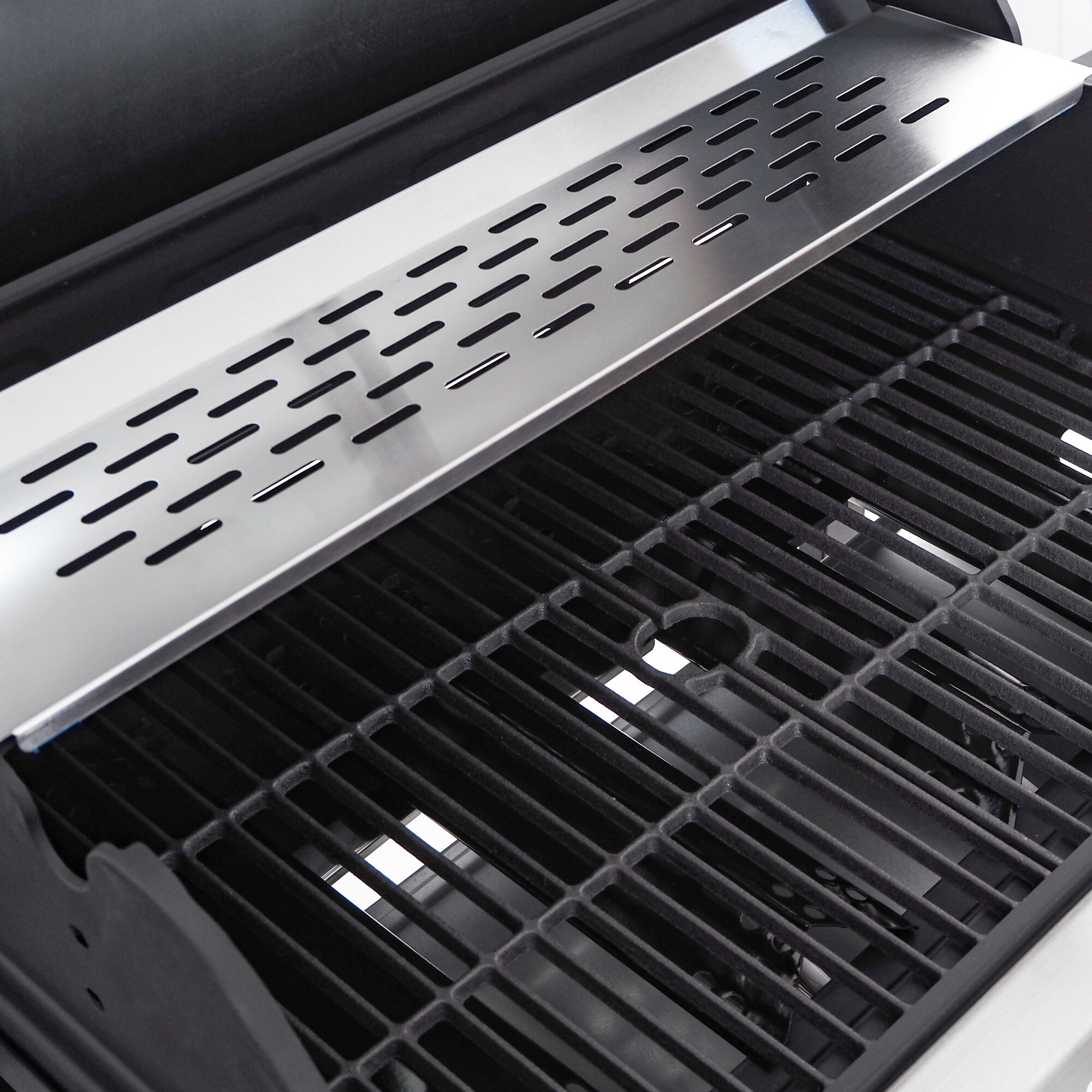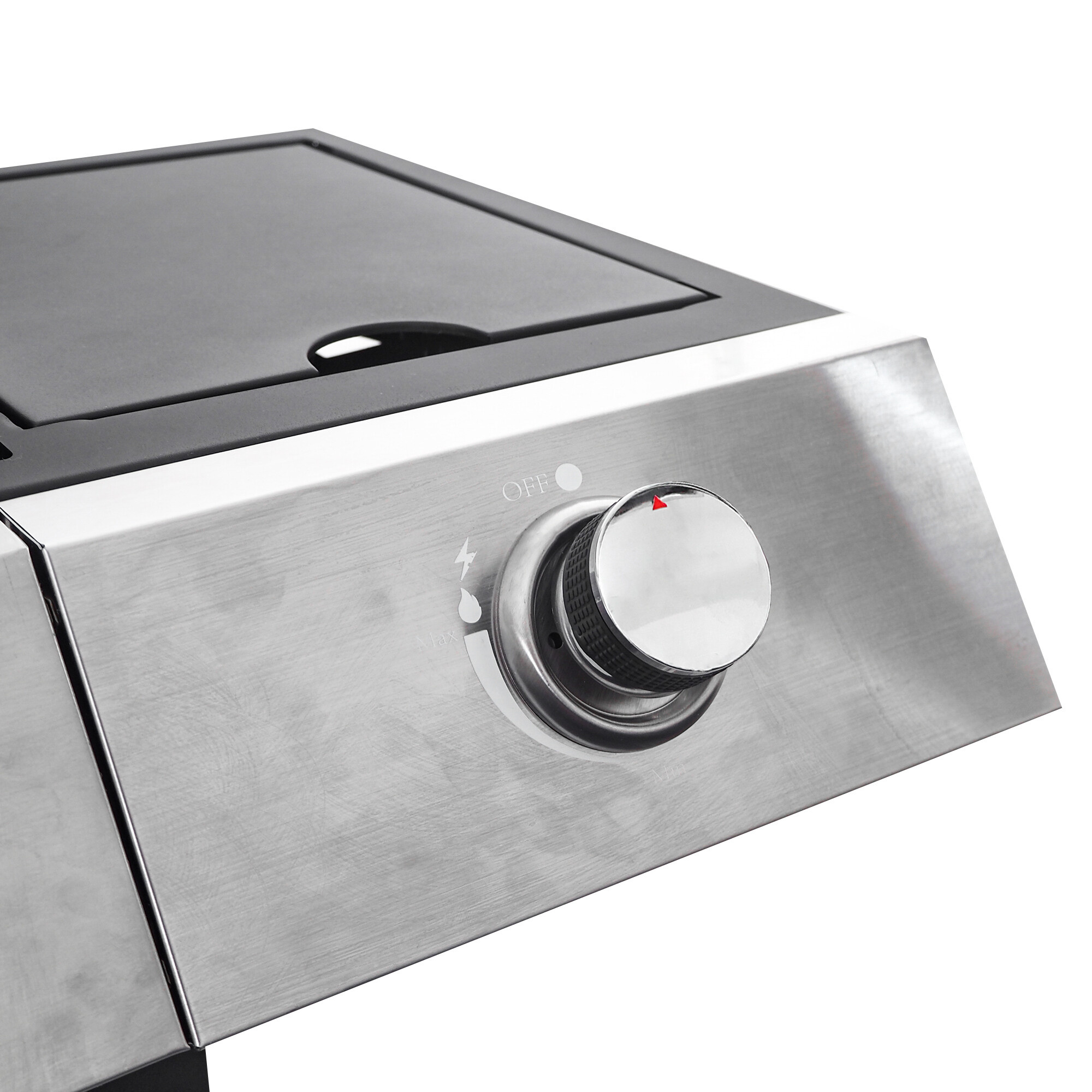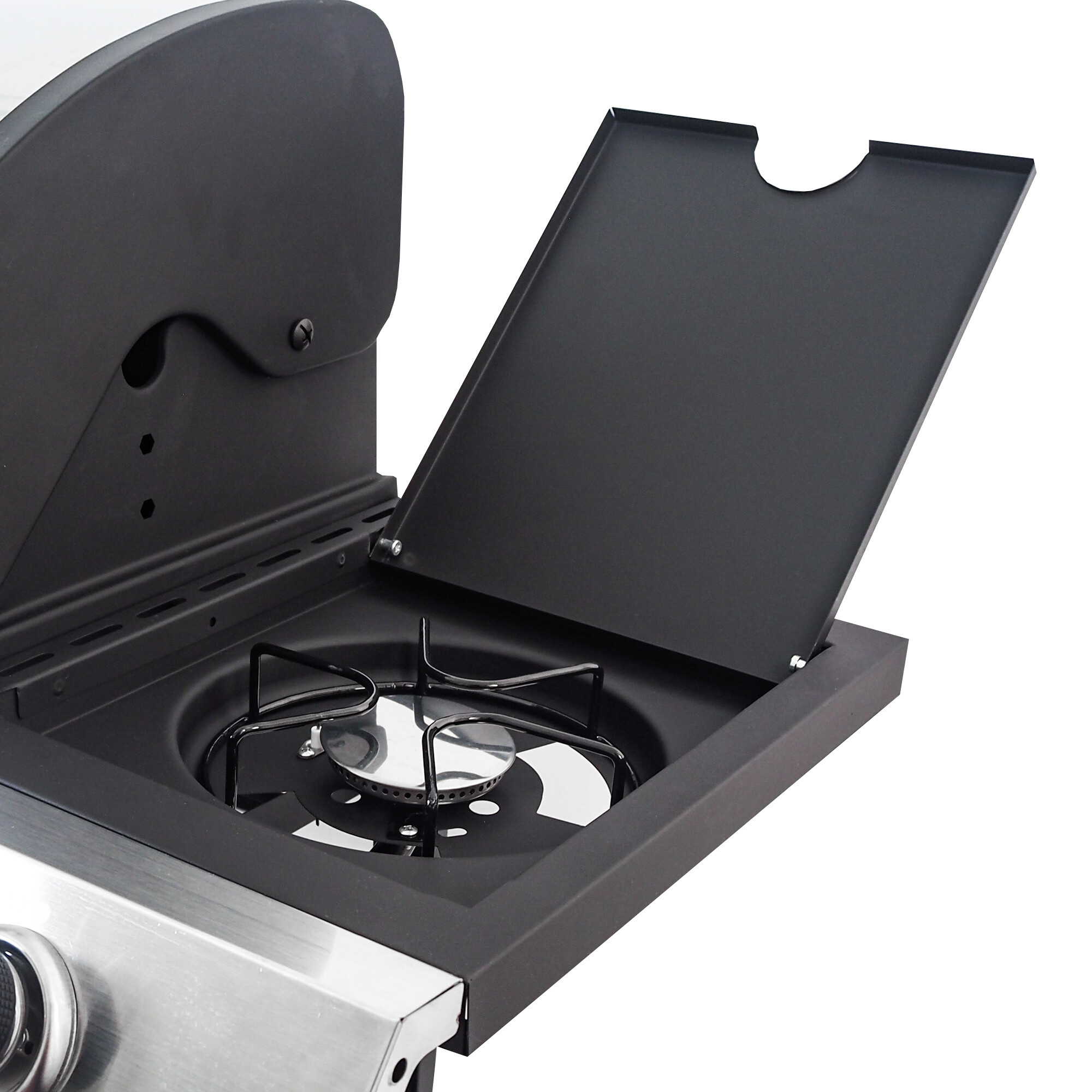 Roštilj je dodatno opremljen ugrađenim bočnim plamenikom, koji je integriran u radnu ploču - tako da možete istovremeno s roštiljanjem udobno pripremiti omiljene umake ili priloge. Praktični poklopac bočnog plamenika omogućuje korištenje kao radnu ili odlagališnu površinu kada je zatvoren.