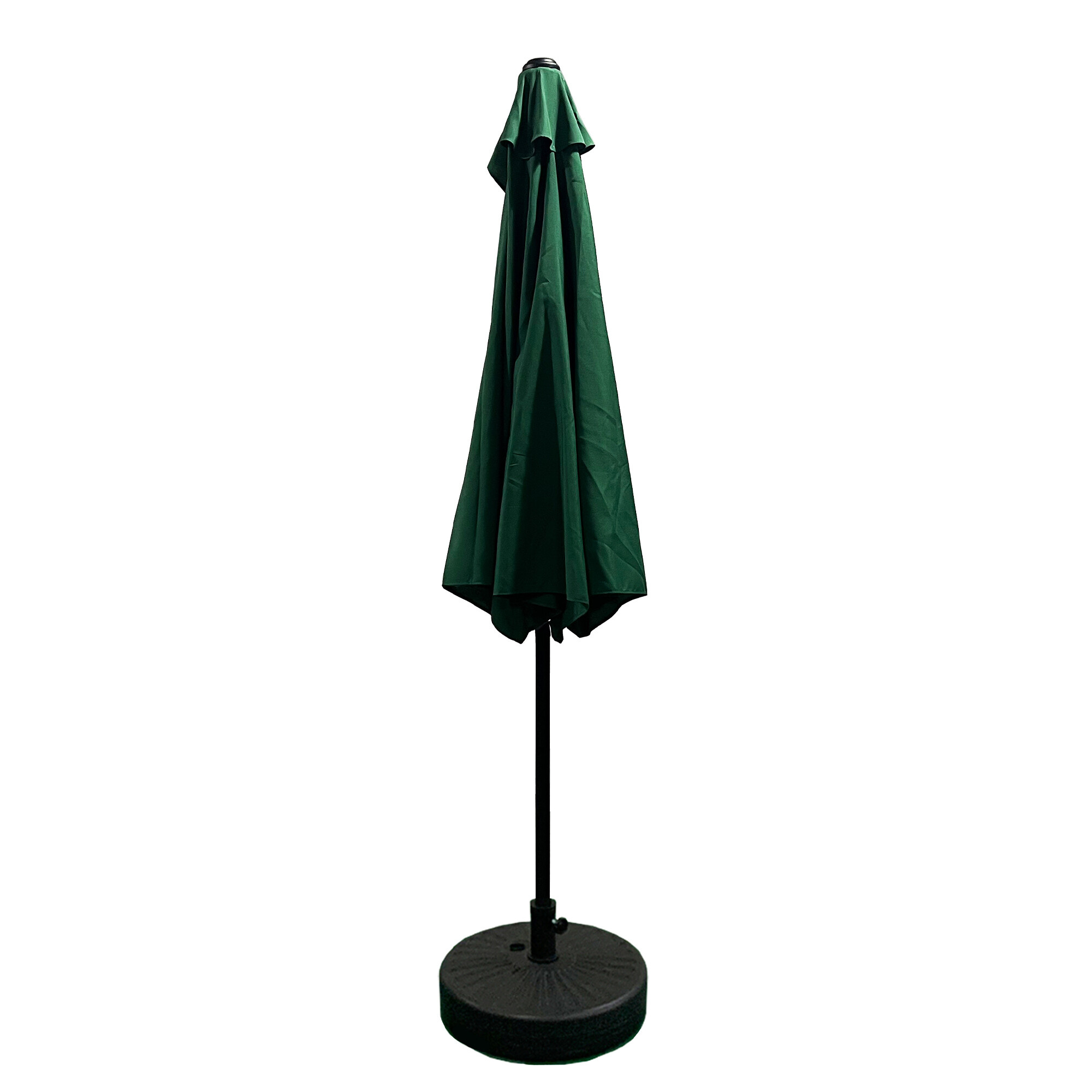 Polukružni vrtni suncobran s čvrstom konstrukcijom i kvalitetnim pokrovom, izrađenim od izdržljivog poliesterskog materijala.