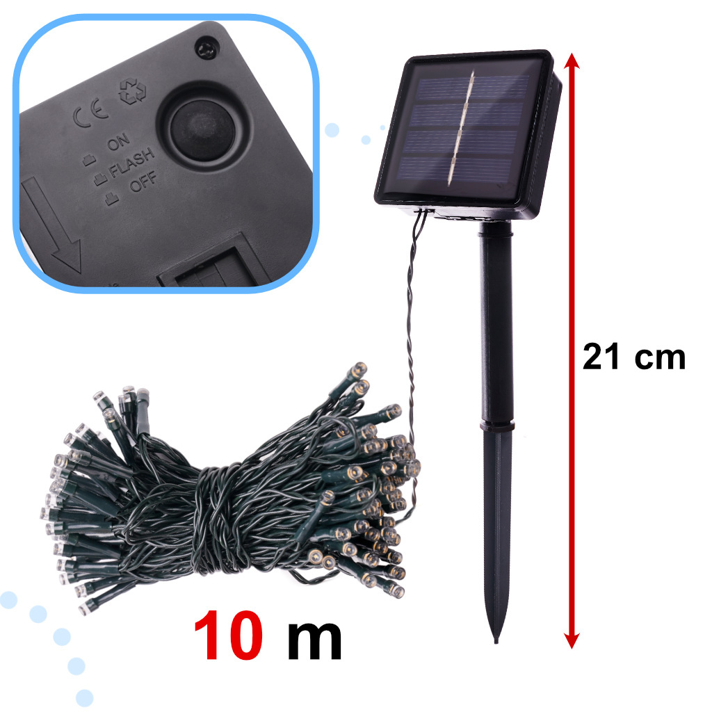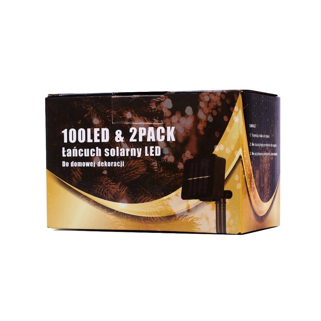 Senzacionalna solarna svjetla koja će čarobno osvijetliti vaš vrt ili terasu. Isporuka uključuje dva solarna panela i dva lanca od po 10 m. Vodootpornost: IP65. Boja svjetla: topla bijela. Dimenzije. panel: 6.5x7x2cm. Dimenzije. pakiranje: 15x8x9.5 cm.Cijeli opis