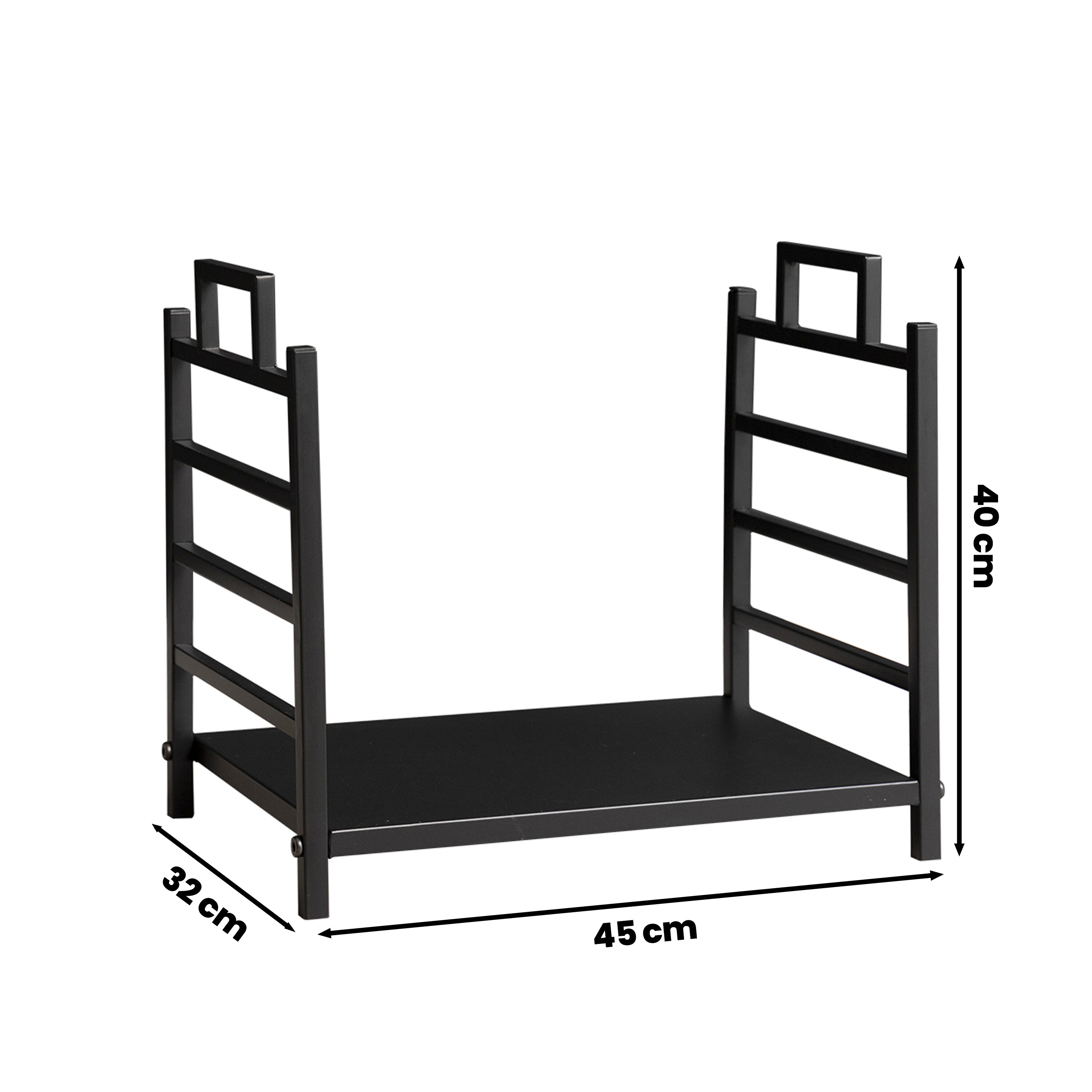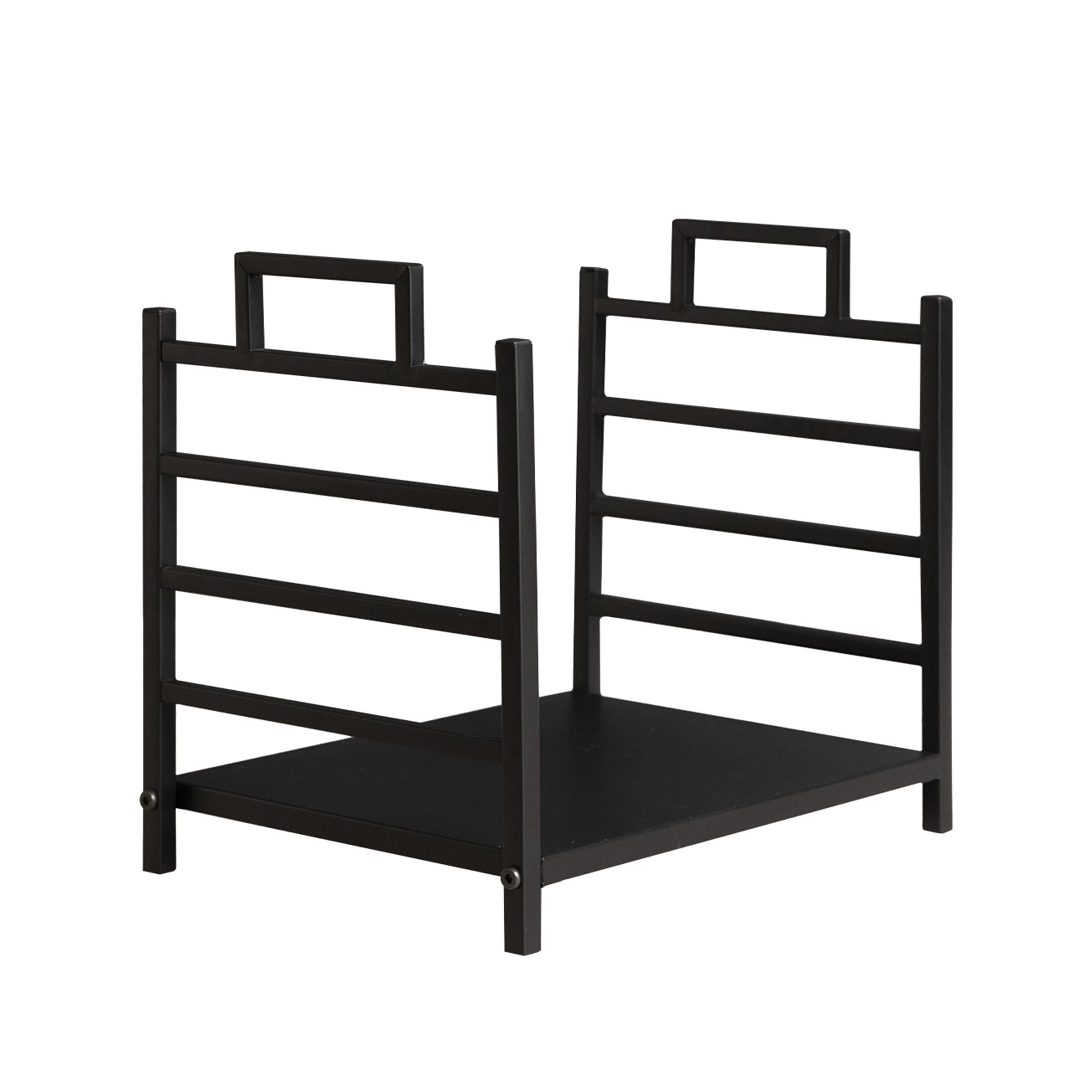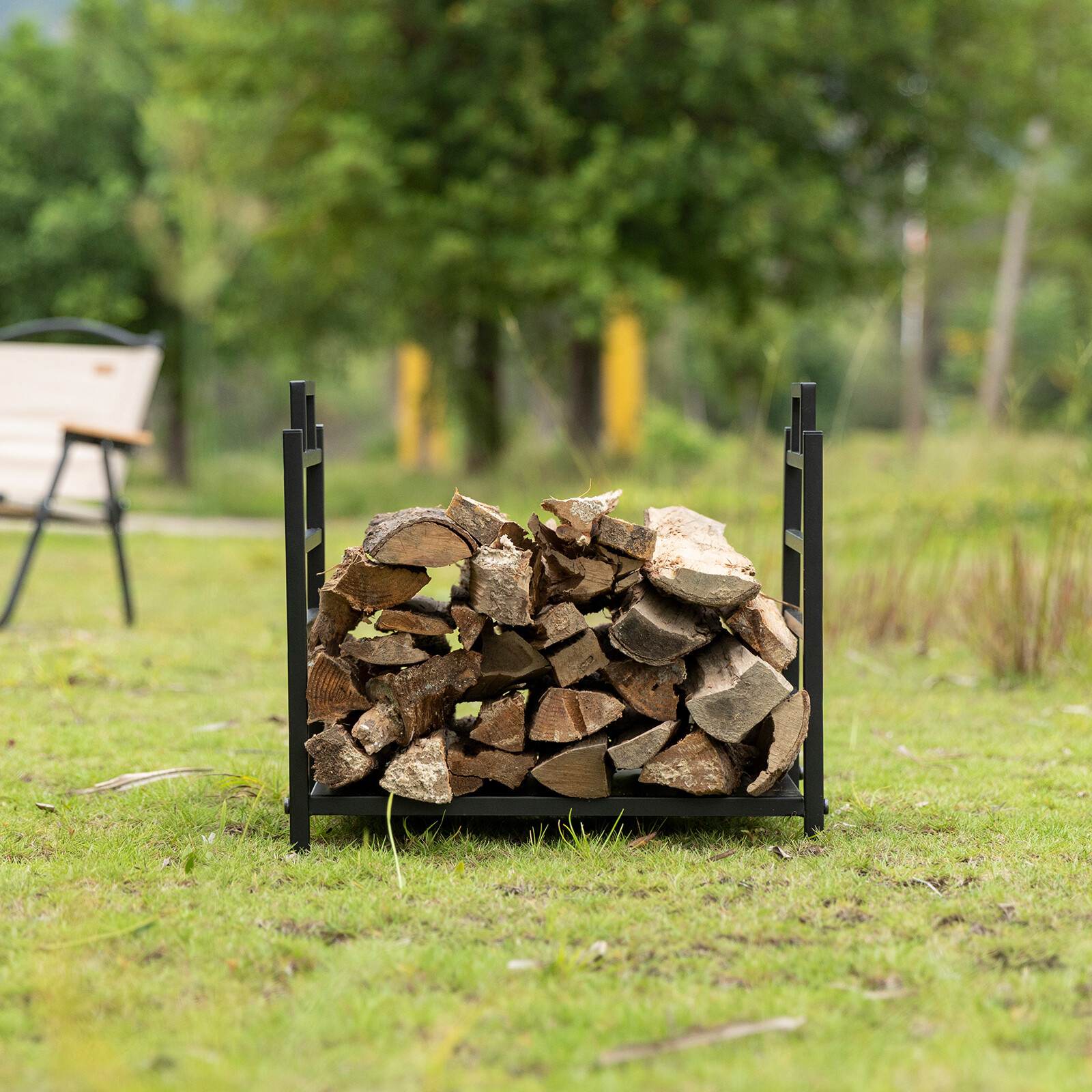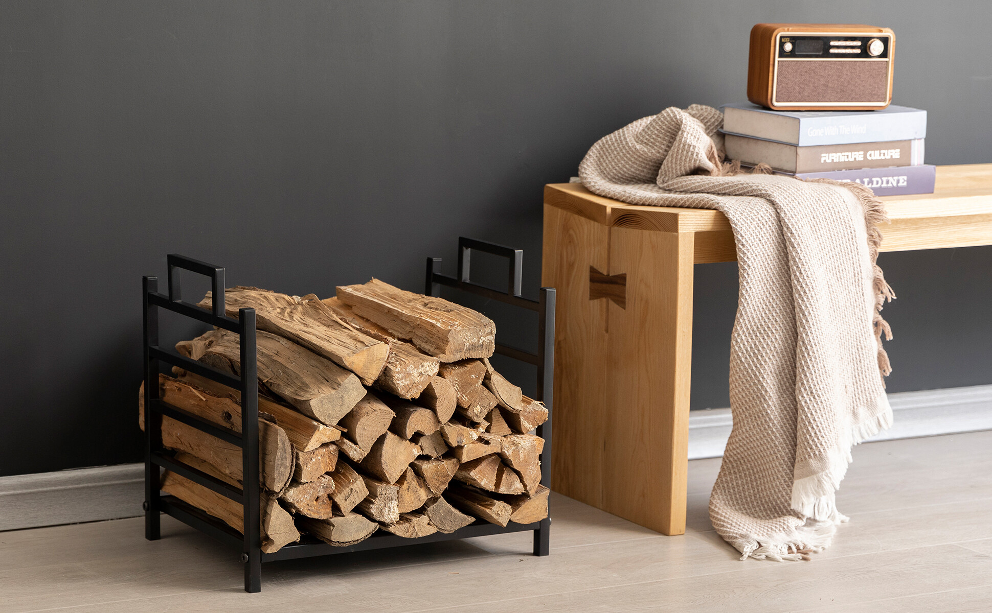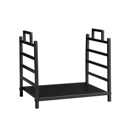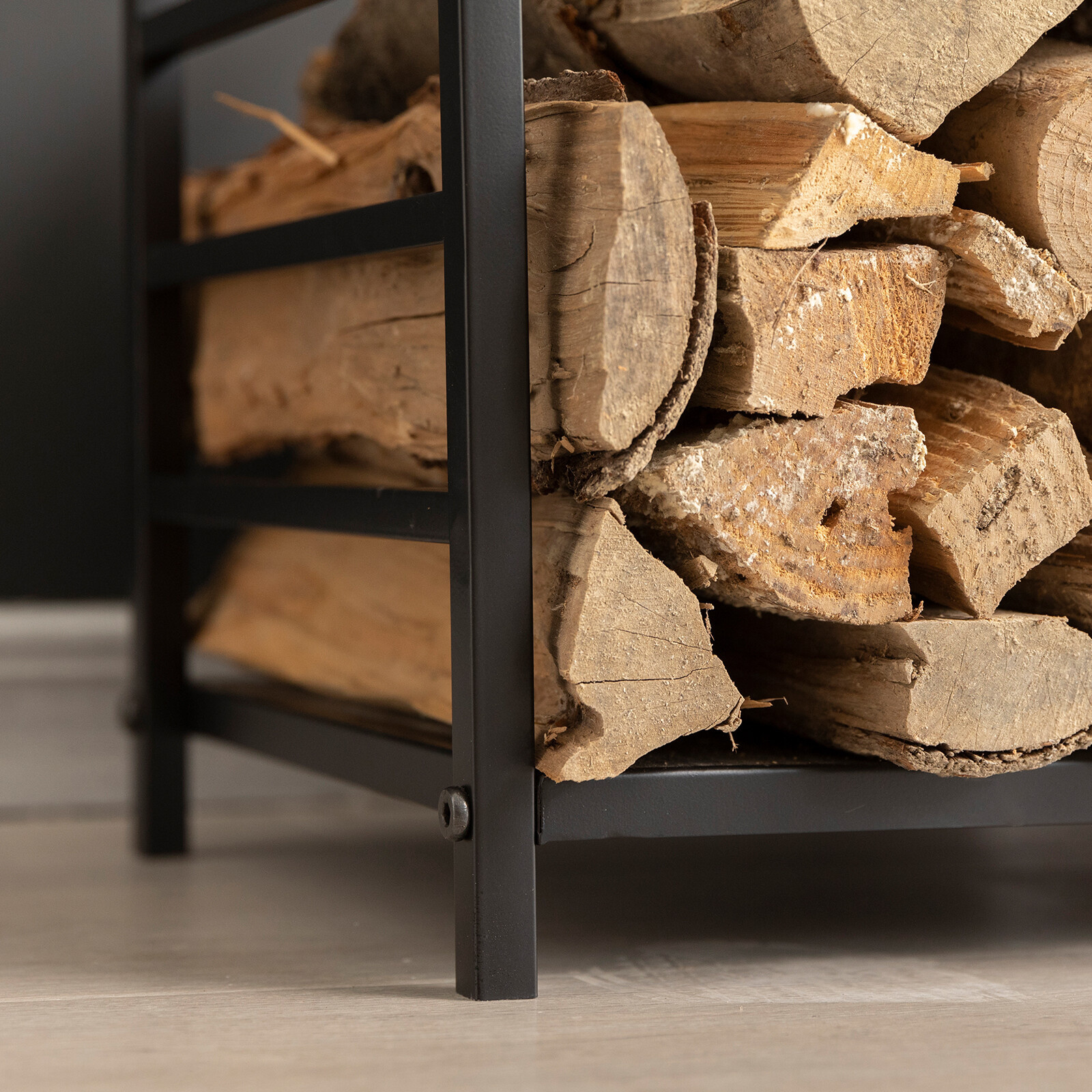 Stalak za drva odgovara svakom interijeru, zahvaljujući cjelokupnoj metalnoj izvedbi u crnoj boji.