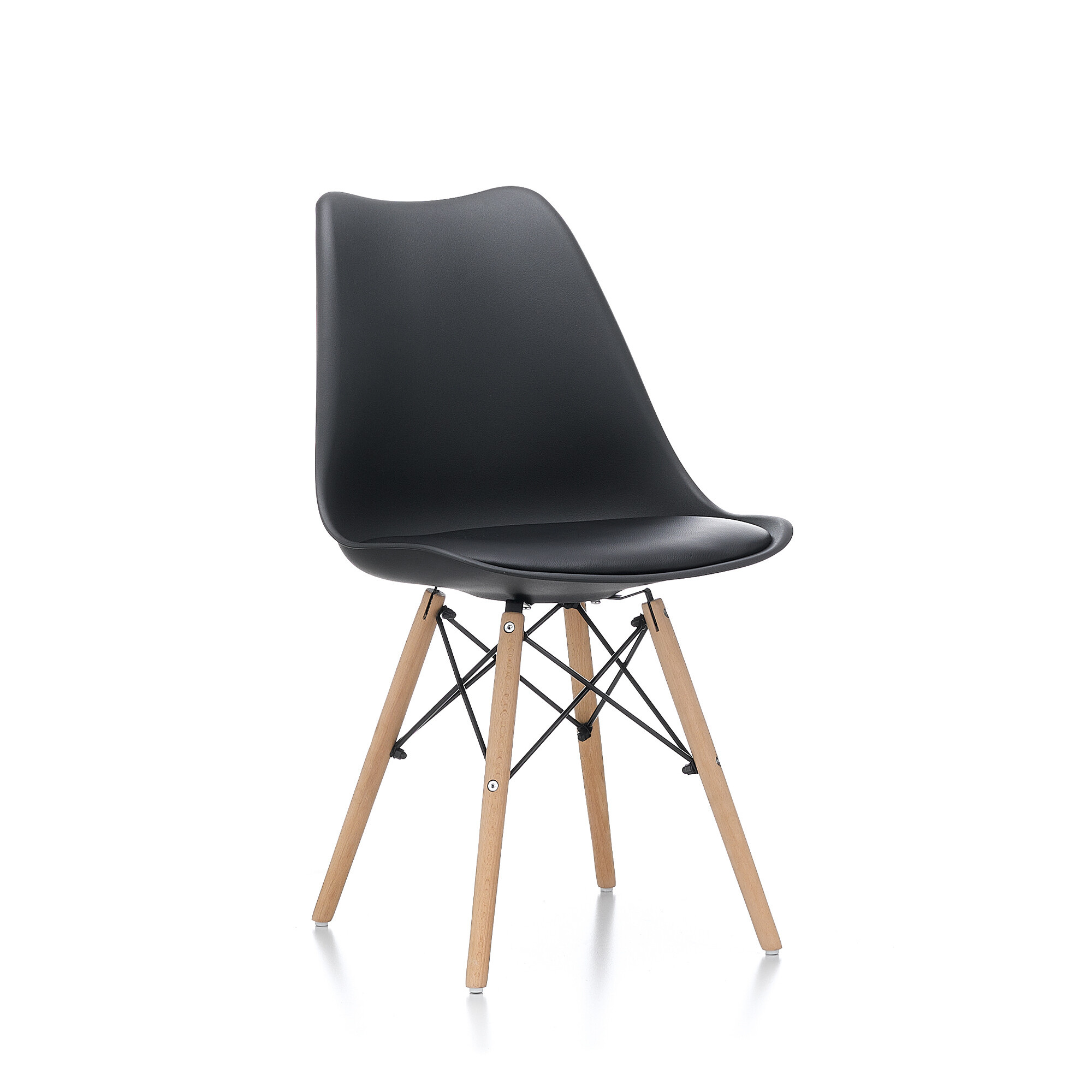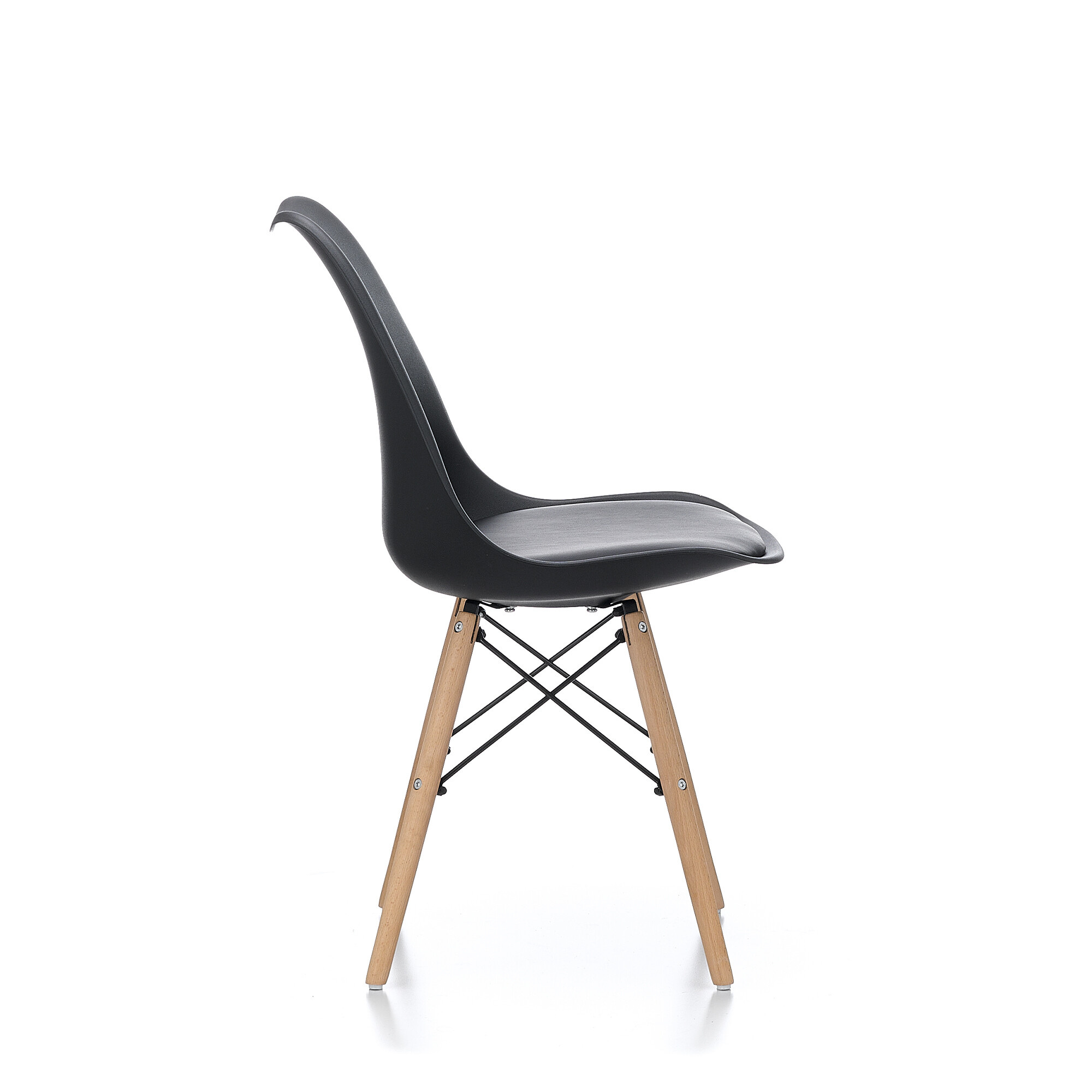 Stolica je izrađena od kvalitetnog i izdržljivog polipropilena s jastukom presvučenim umjetnom kožom u kombinaciji s nogama od bukovog drveta.