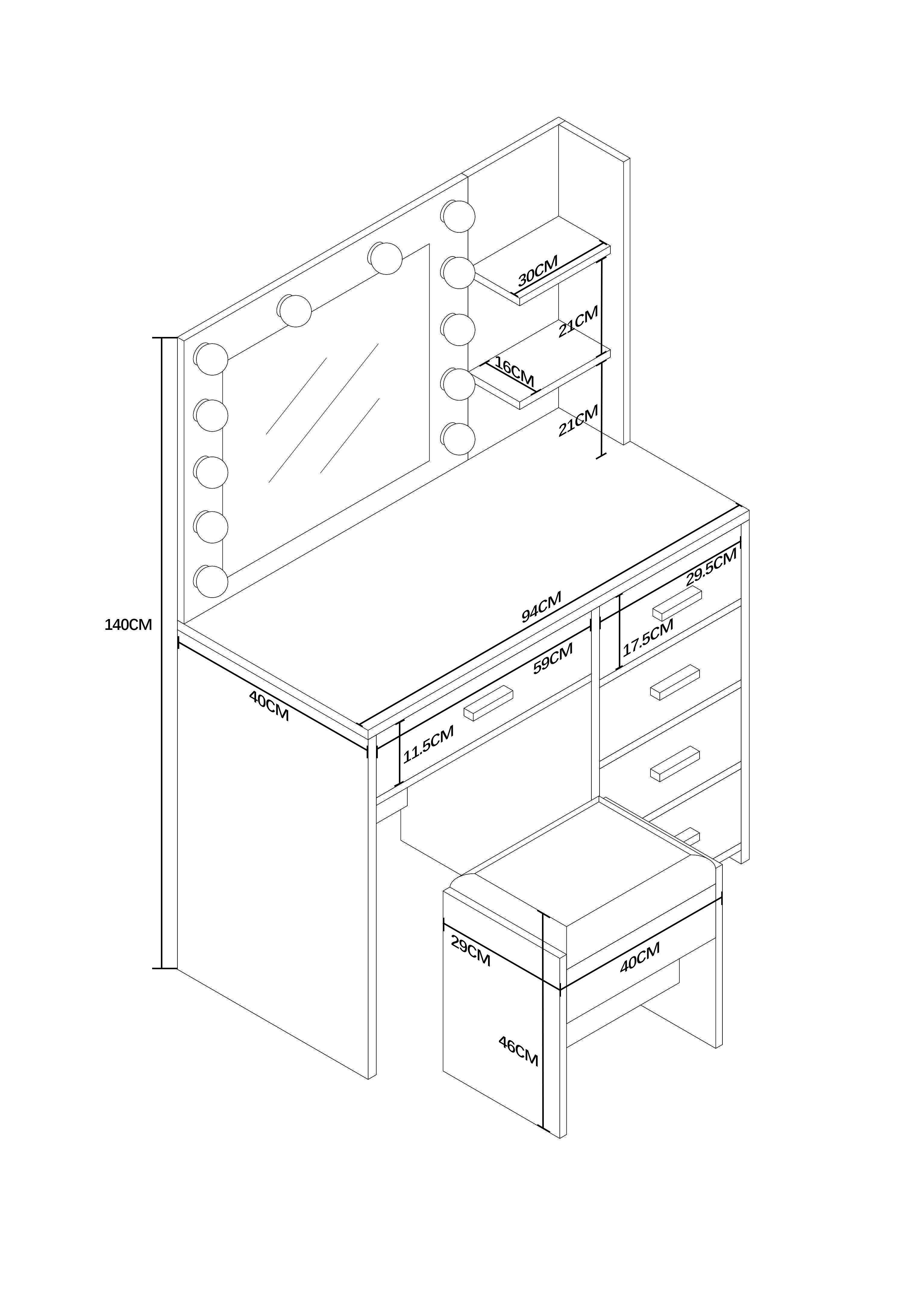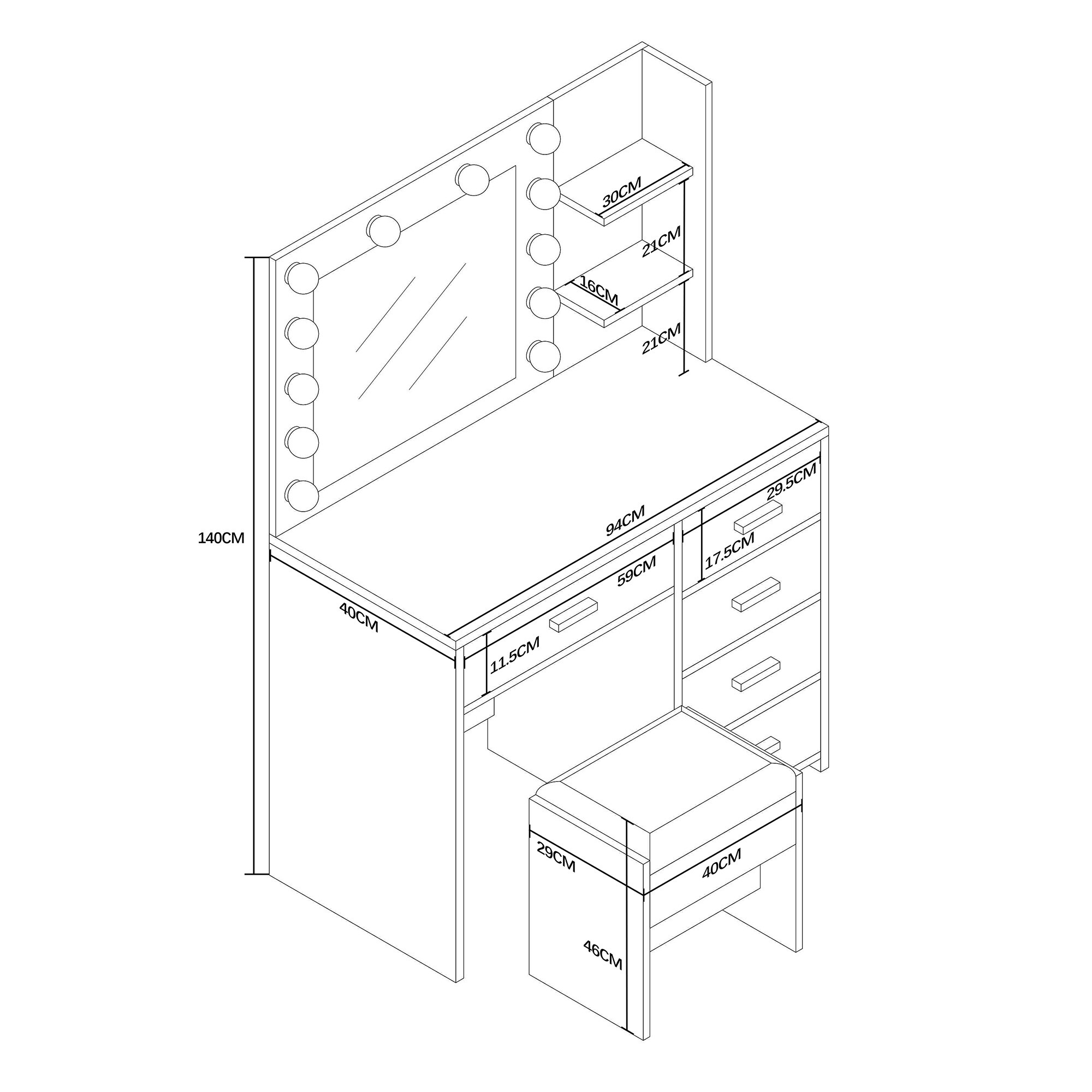 Uz ogledala se nalaze dvije praktične otvorene police na koje možete izložiti svoje omiljene kozmetičke proizvode, parfeme ili dekoracije. Pet prostranih ladica nudi dovoljno prostora za pohranu šminke, nakita i drugih dodataka, koje ćete tako uvijek imati pregledno pri ruci.