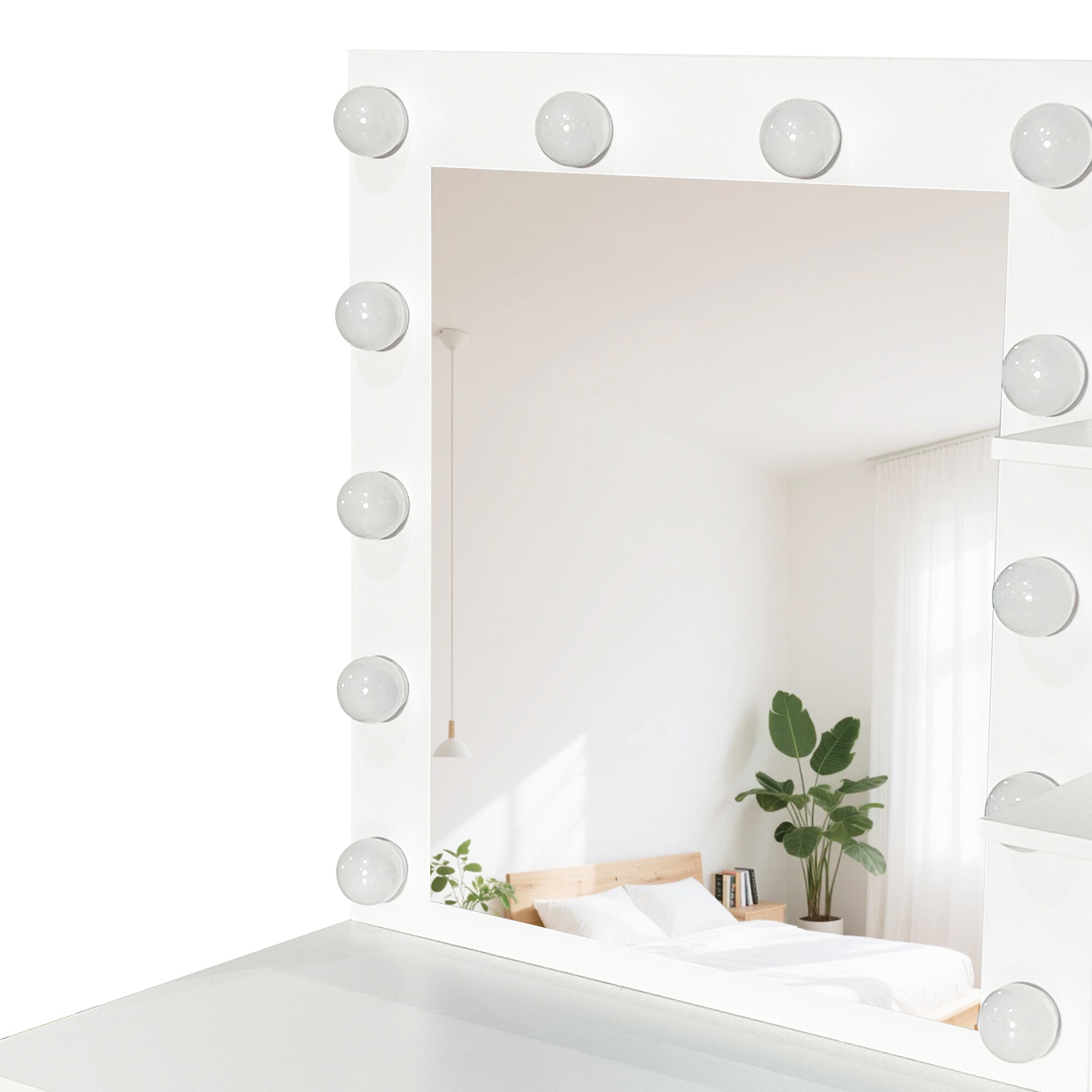 Dominantni dio stola je veliko ogledalo s 12 LED žarulja. Zahvaljujući tome uvijek ćete imati idealno osvjetljenje za šminkanje, uređivanje kose ili večernju njegu kože.