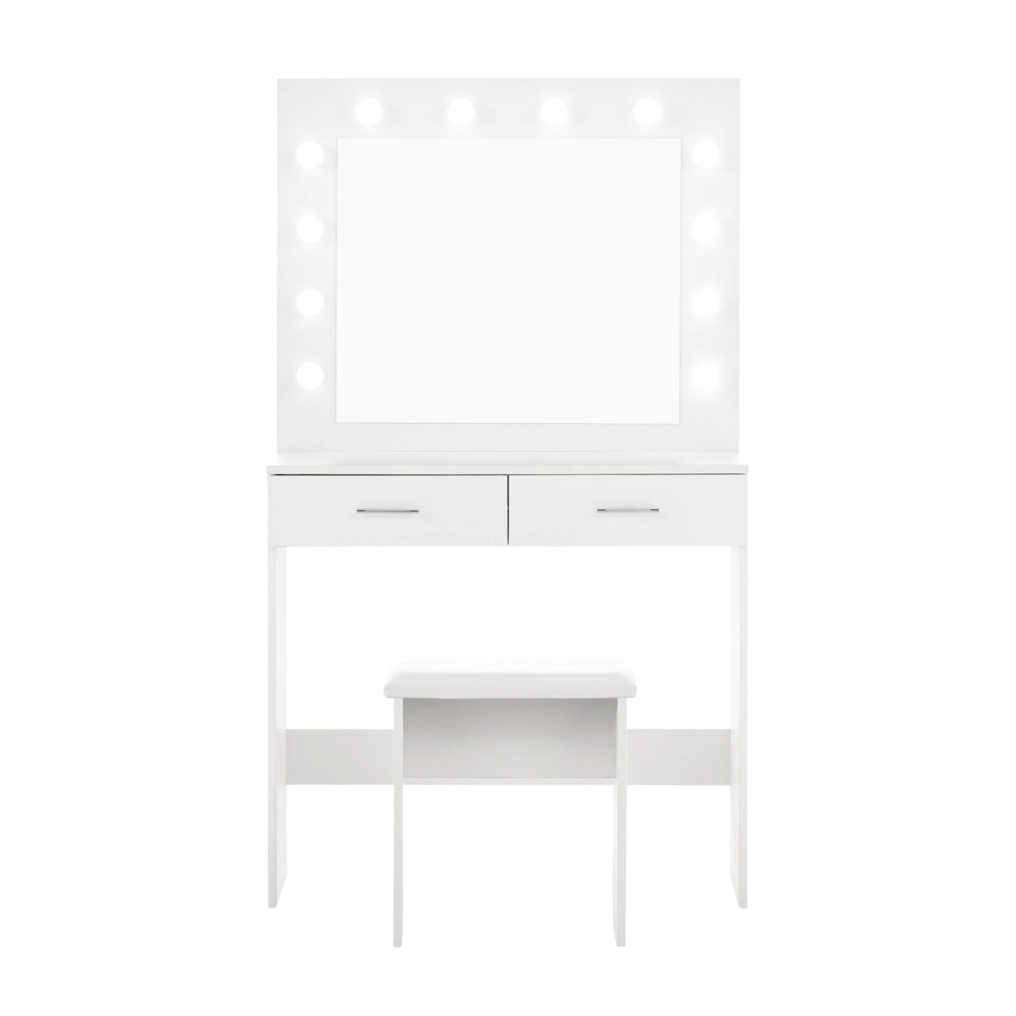 Na ogledalu je 12 LED žarulja, tako da se možete udobno našminkati čak i pri lošem prirodnom svjetlu.Tabure je izrađen od visokokvalitetne mekane pjene, na kojoj je moguće sjediti satima.