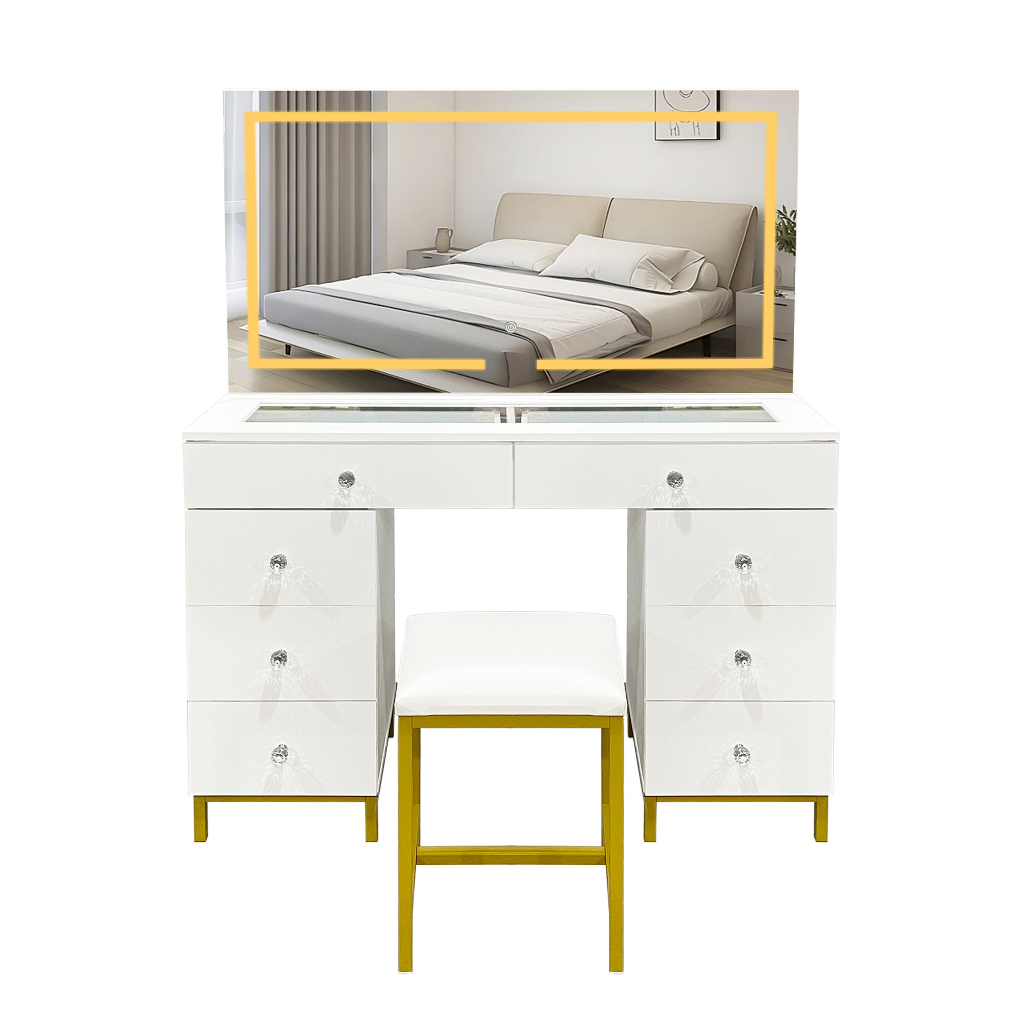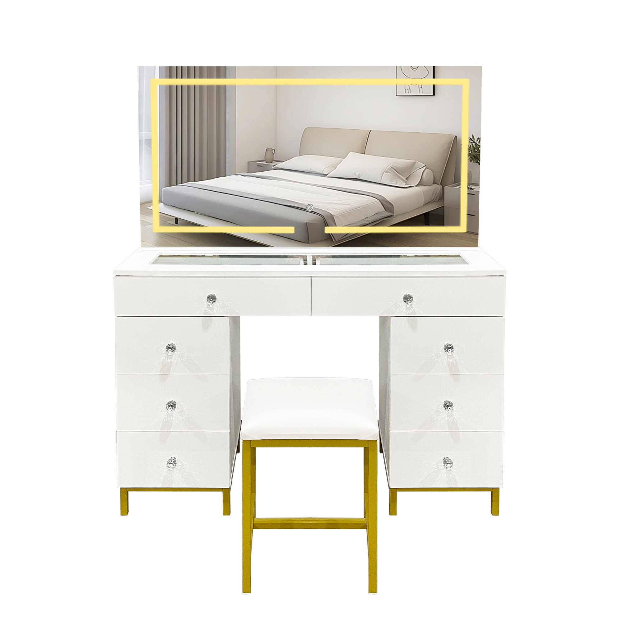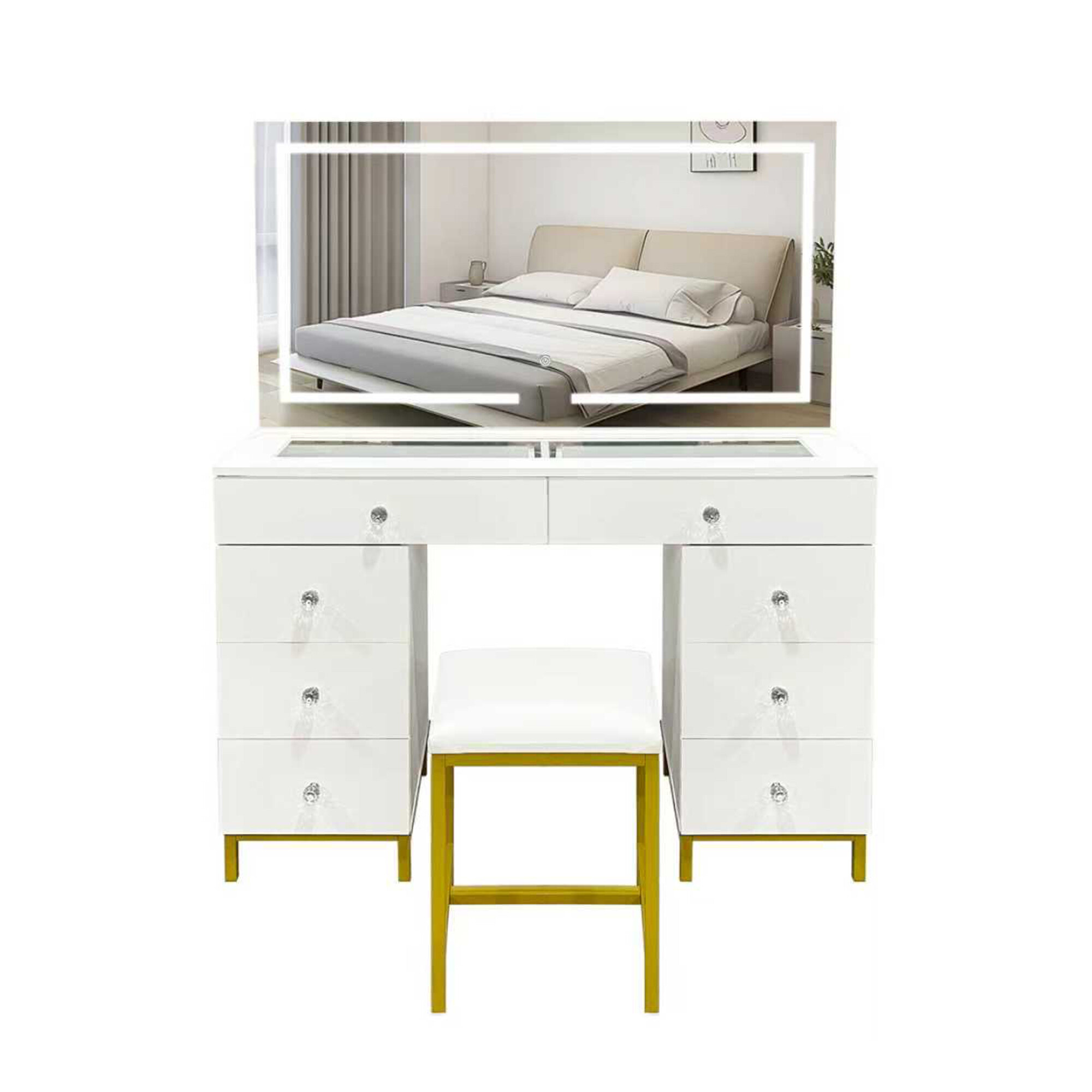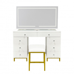 Priuštite si svakodnevnu dozu luksuza s ovim modernim toaletnim stolićem s ogledalom i LED rasvjetom. Stilski bijeli stolić u mat izvedbi postat će ne samo praktičan, već i estetski dodatak svakoj spavaćoj sobi ili garderobi.