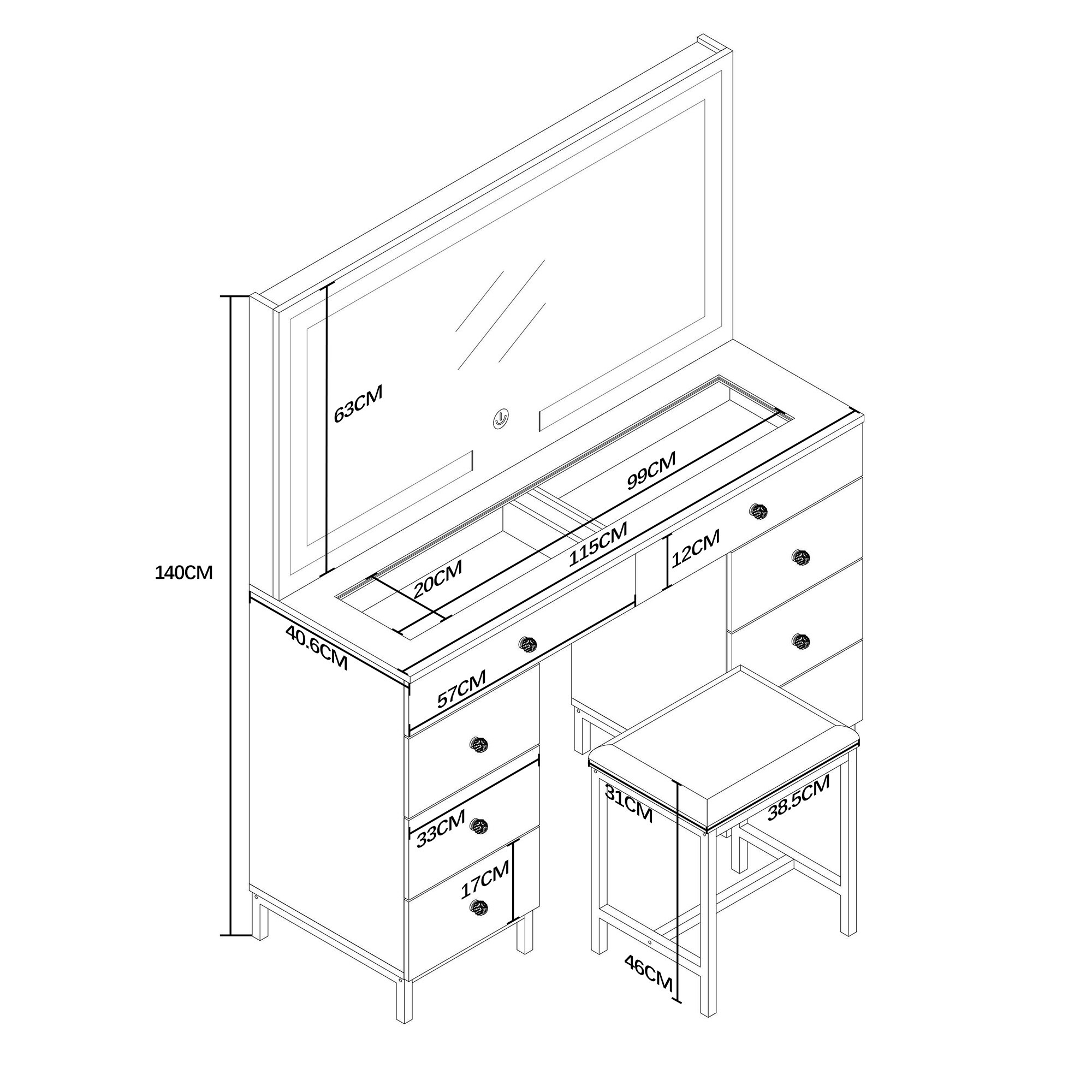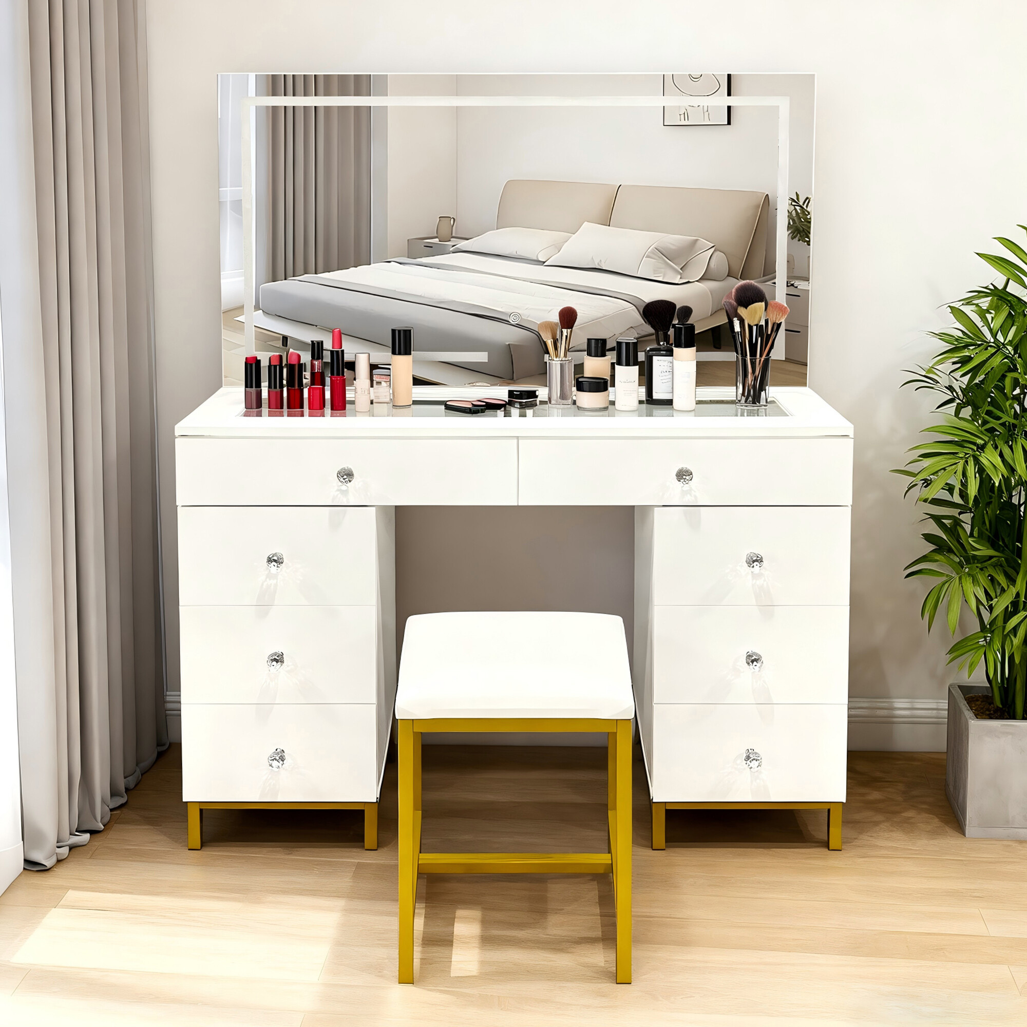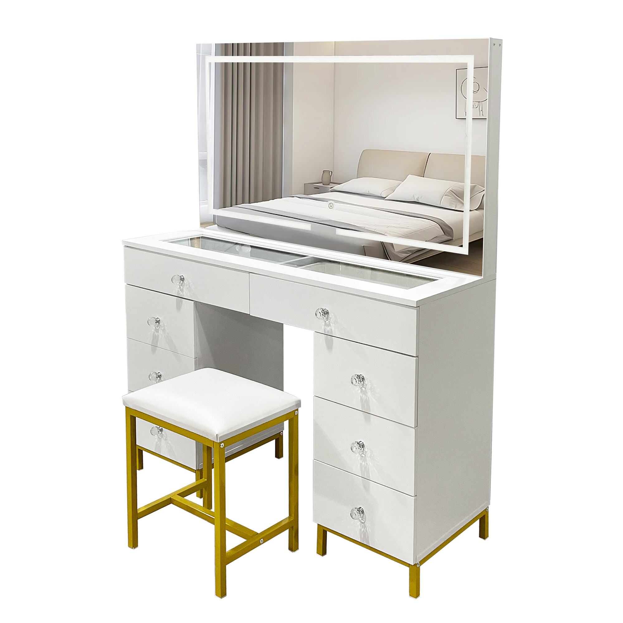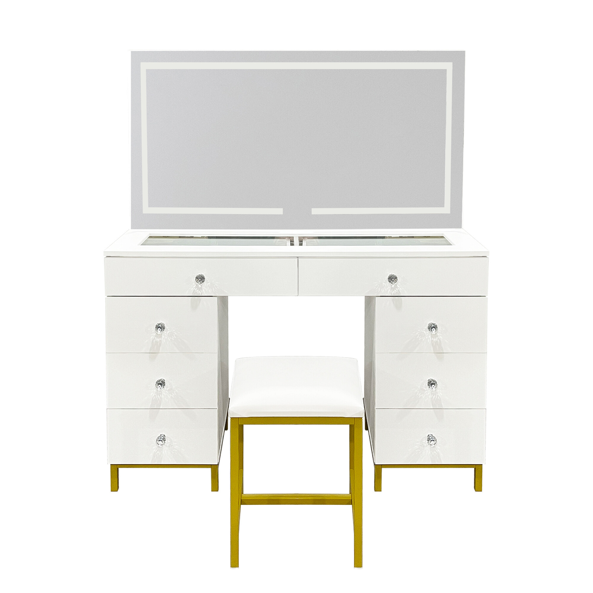 Priuštite si svakodnevnu dozu luksuza s ovim modernim toaletnim stolićem s ogledalom i LED rasvjetom. Stilski bijeli stolić u mat izvedbi postat će ne samo praktičan, već i estetski dodatak svakoj spavaćoj sobi ili garderobi.