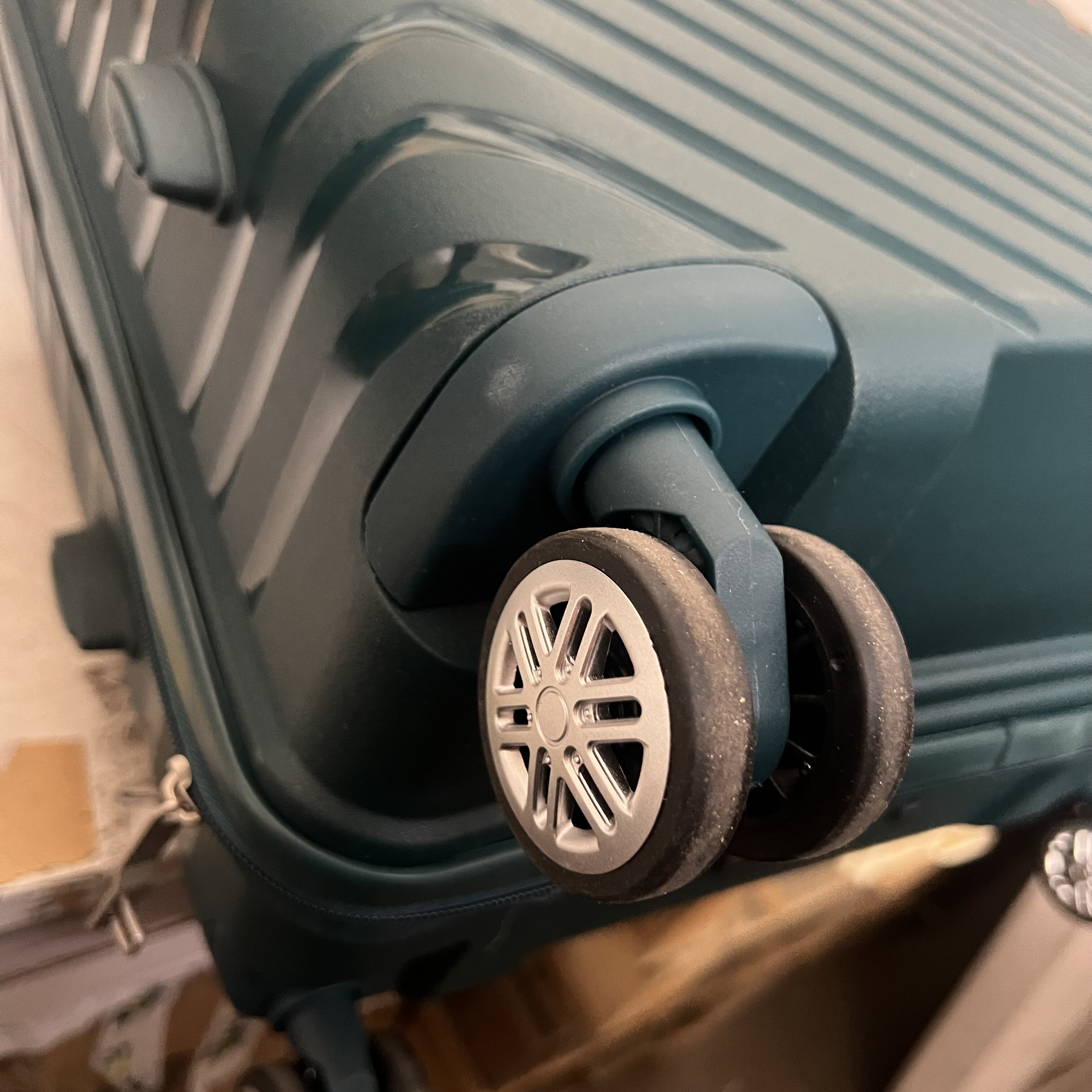 Kotači su blago zaprljani, a površina kovčega ima lagane ogrebotine.