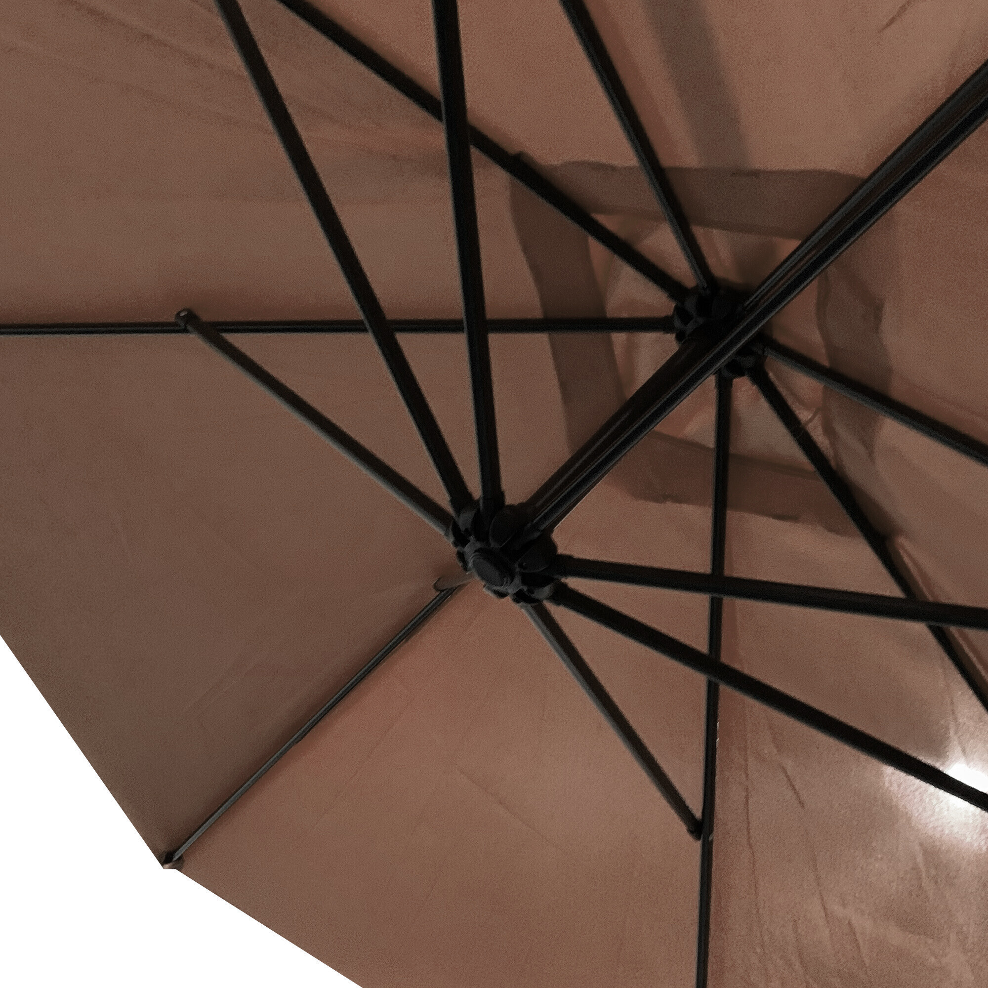Praktični vrtni suncobran izrađen od izdržljivog poliestera, čija je noga smještena izvan zasjenjenog područja.