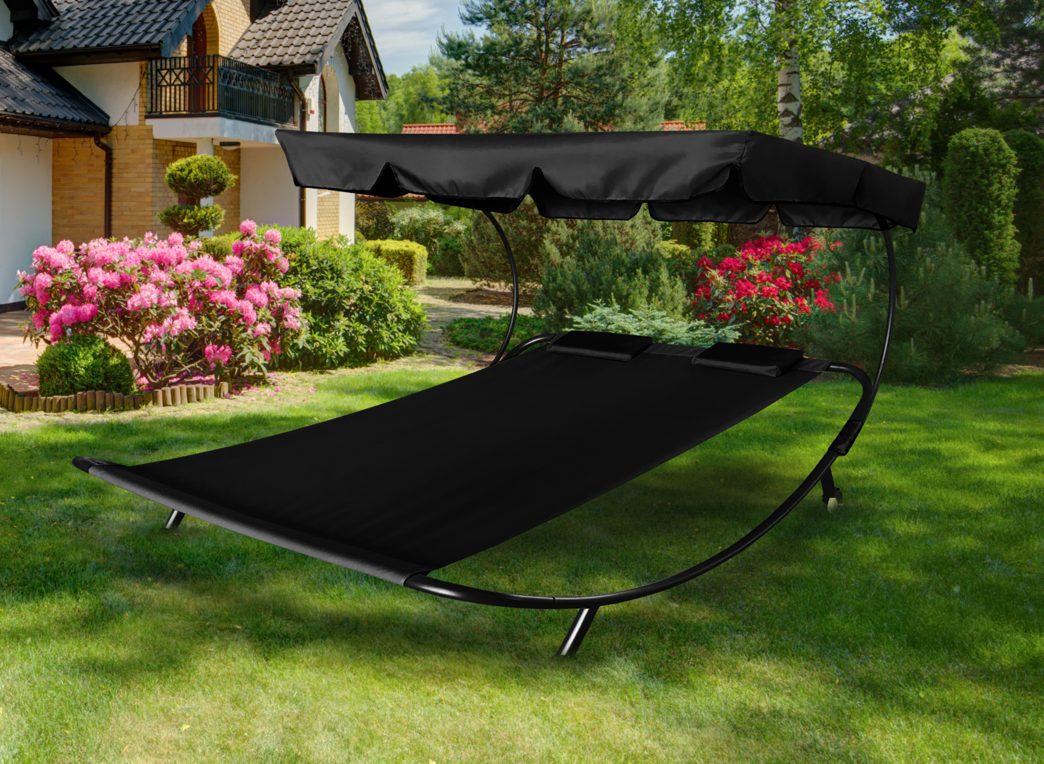 Dvostruki ležaj izrađen je od kvalitetne oxfordske tkanine koja izvrsno odolijeva vremenskim uvjetima. Nagnuti sjenilo zaštitit će vas od sunca.