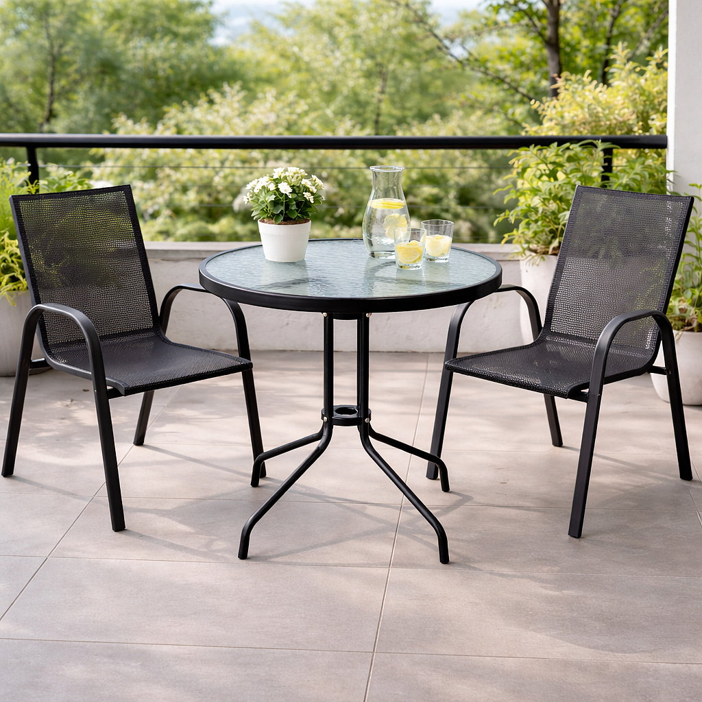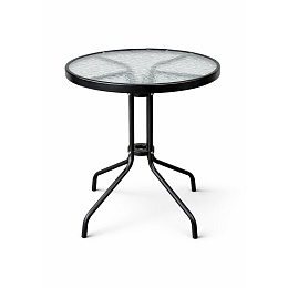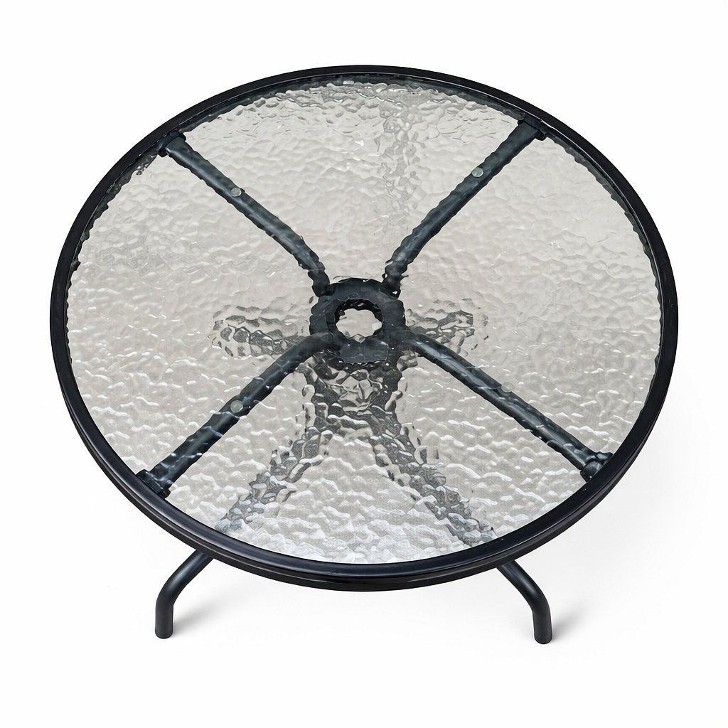 Okrugli vrtni stol s čvrstim metalnim okvirom i teksturiranim staklenim pločama, pogodan za vrtove, terase, kafiće, sjenice, balkone.
