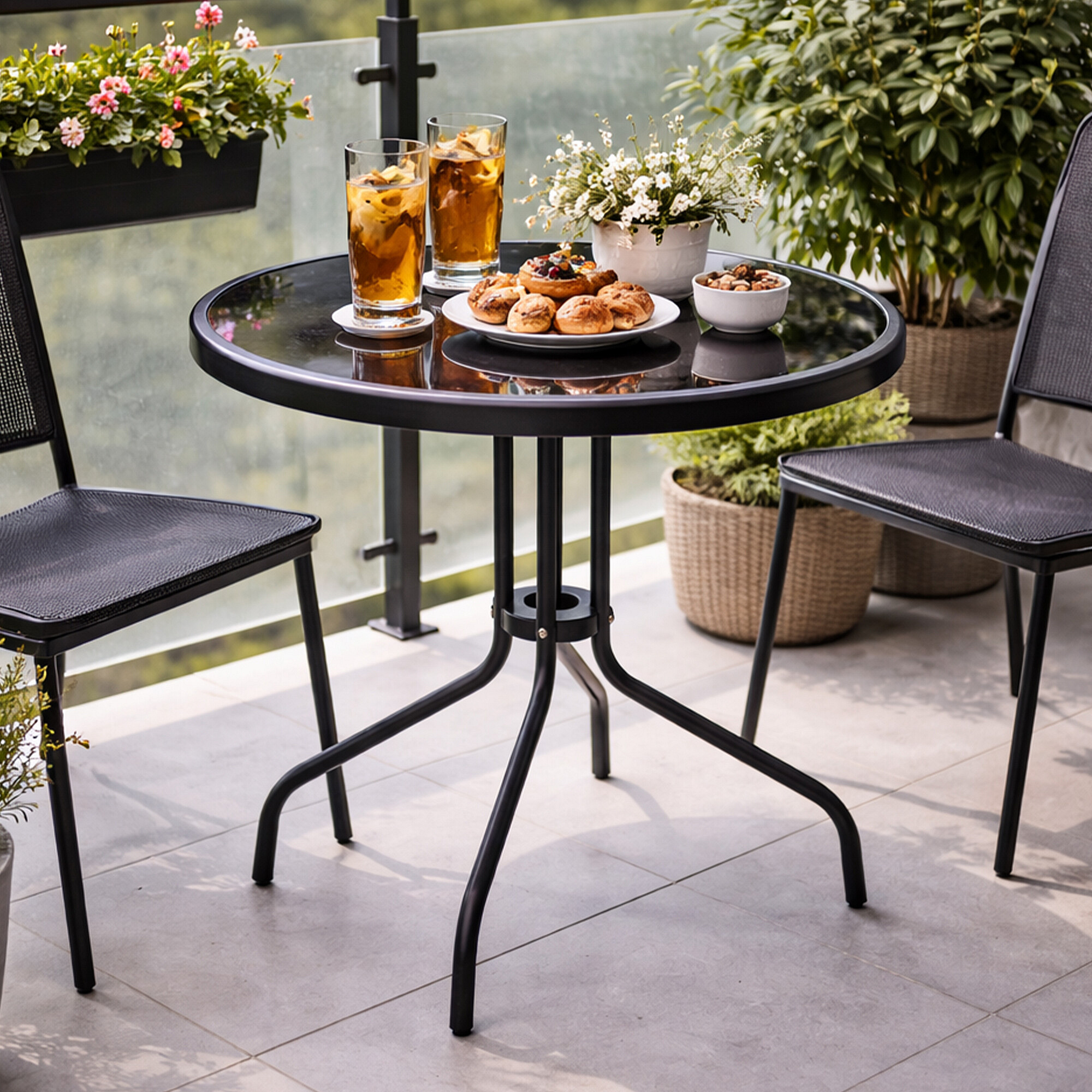 Vrtni stol s čvrstim metalnim okvirom i staklenom pločom u modernom dizajnu, pogodan za vrtove, terase, kafiće, sjenice, balkone ili plaže. Cijeli opis