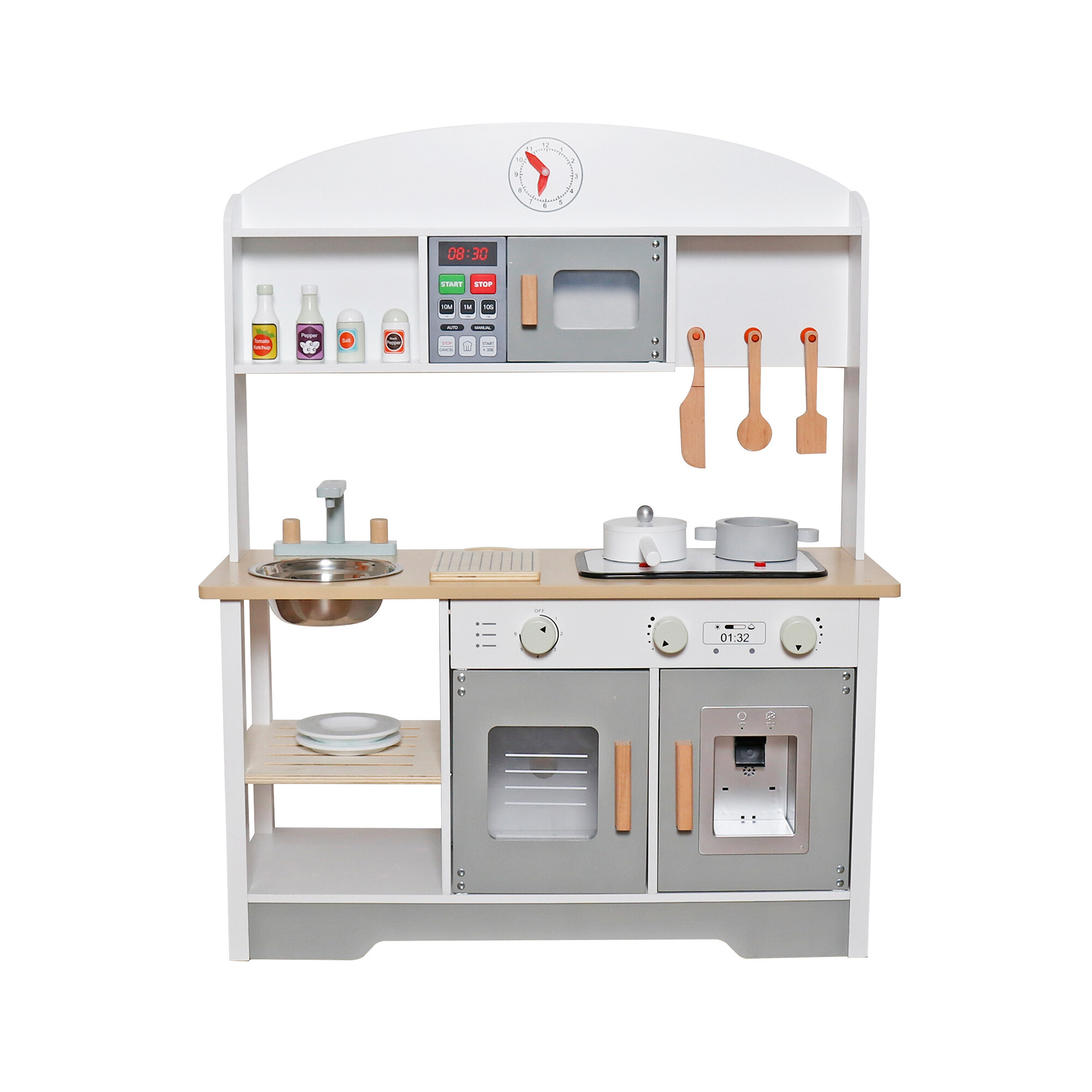 Ovaj model dječje kuhinjice opremljen je cijelim nizom funkcionalnih elemenata i dodataka. Kuhinjska je dovoljno velika da se s njom može igrati više djece istovremeno.