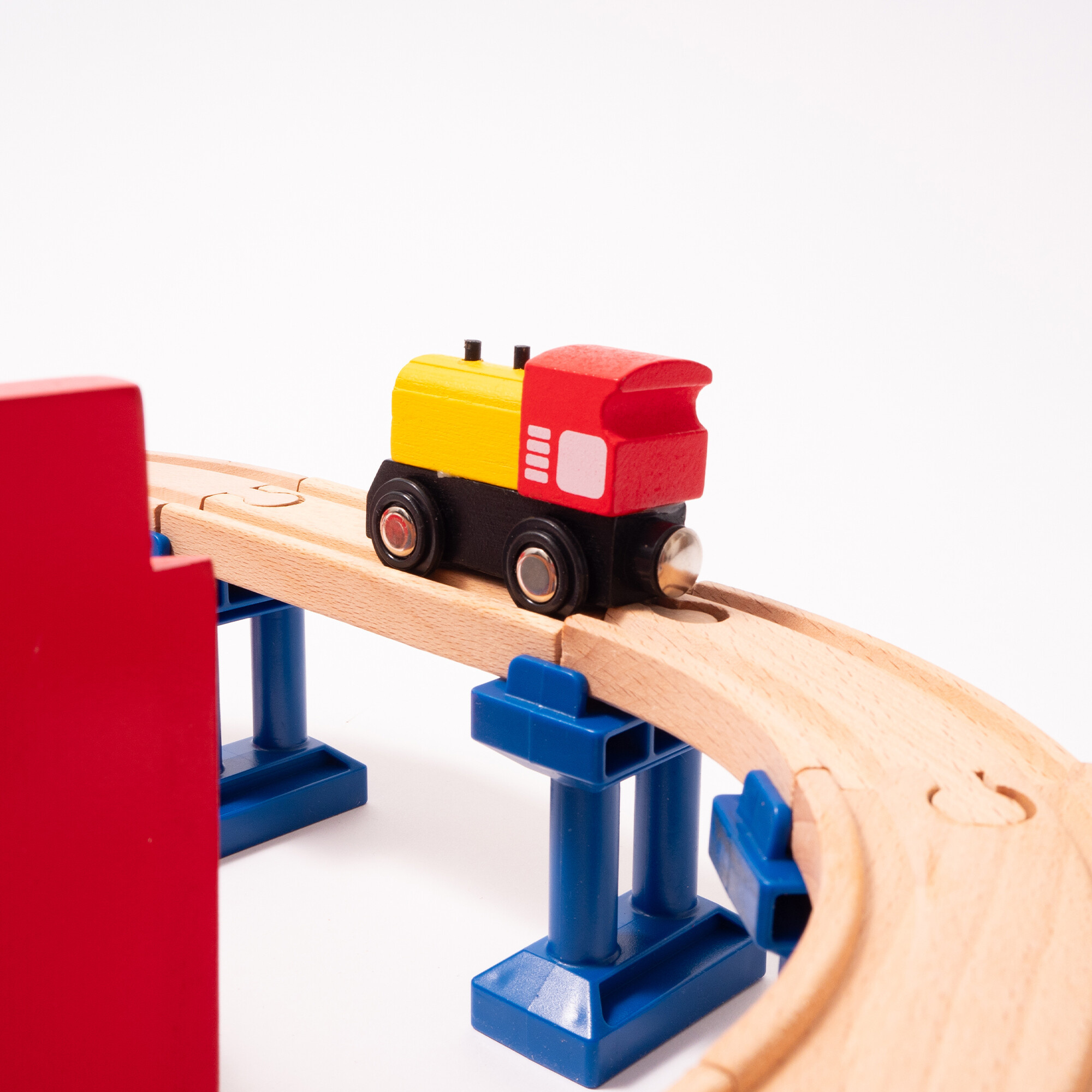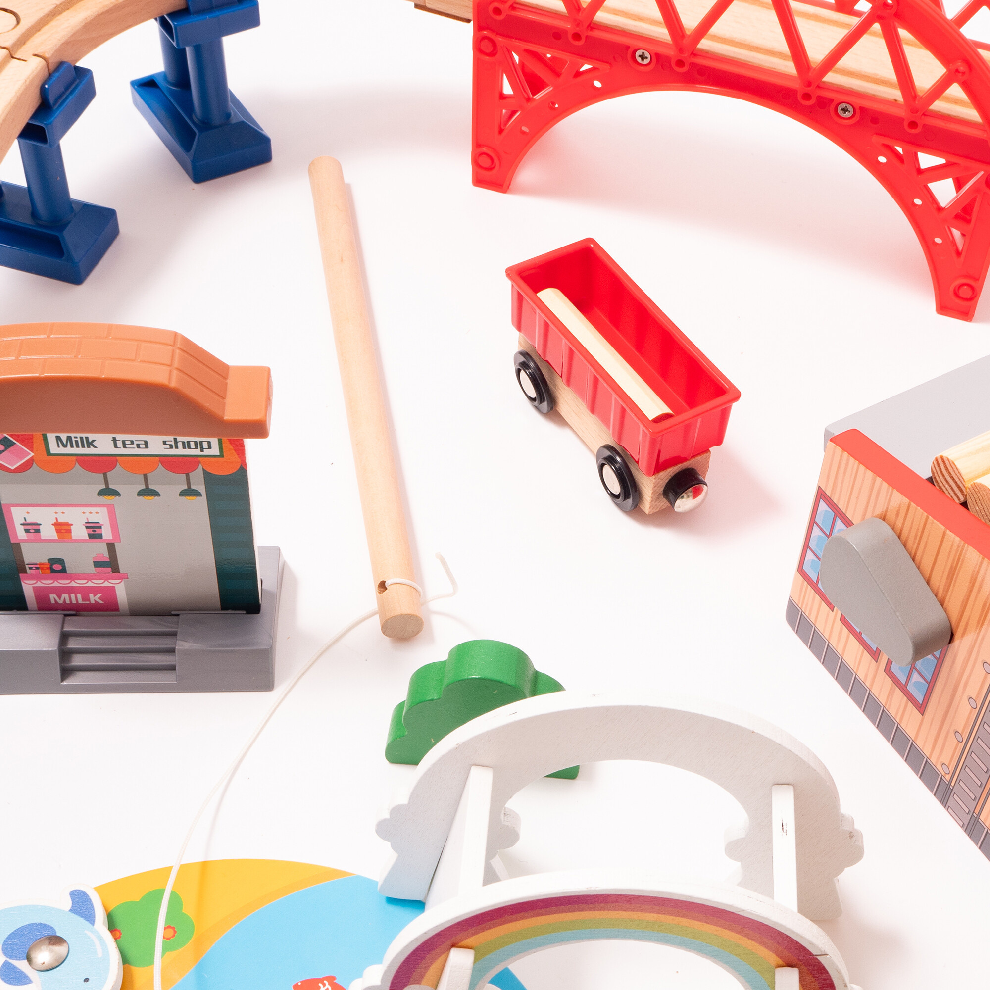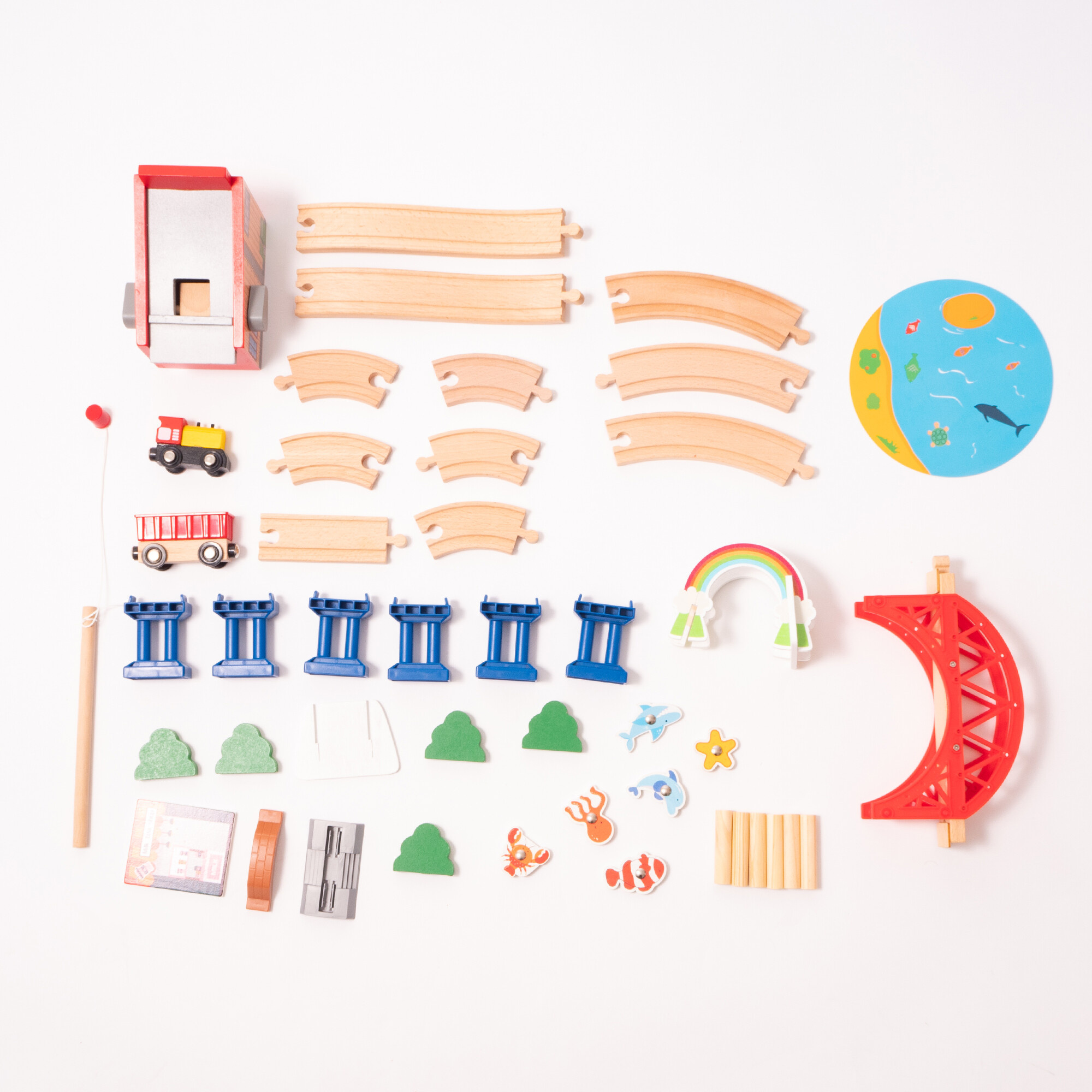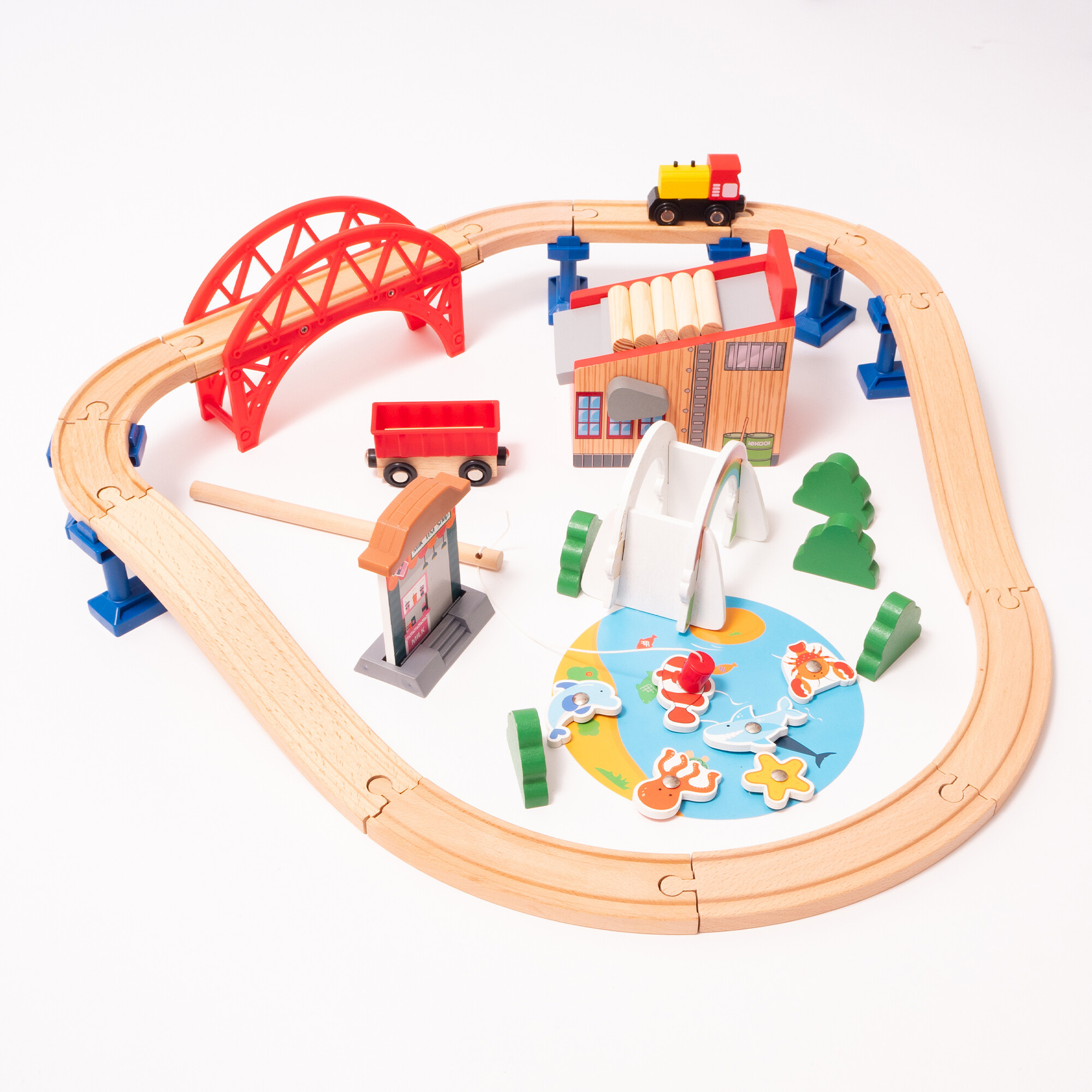 Vlakovna staza je dovoljno velika da se s njom može igrati više djece istovremeno.Drvena željeznička staza je idealan poklon za svaku priliku.