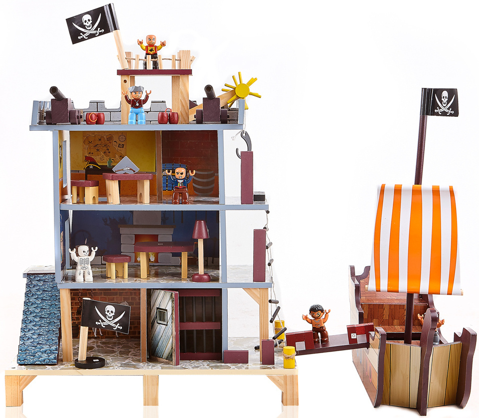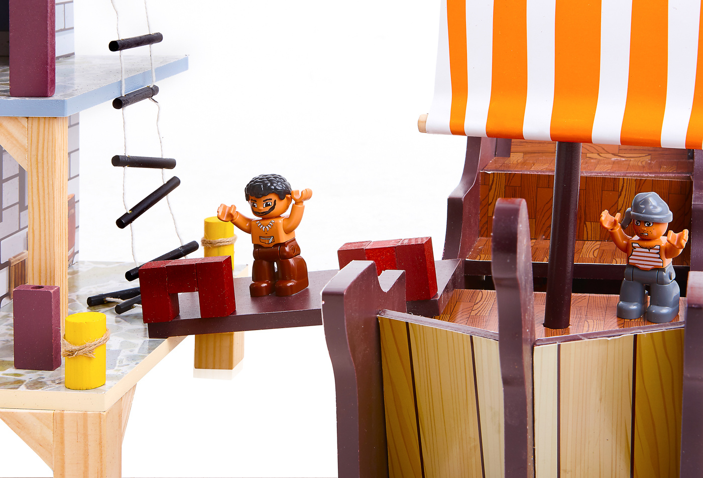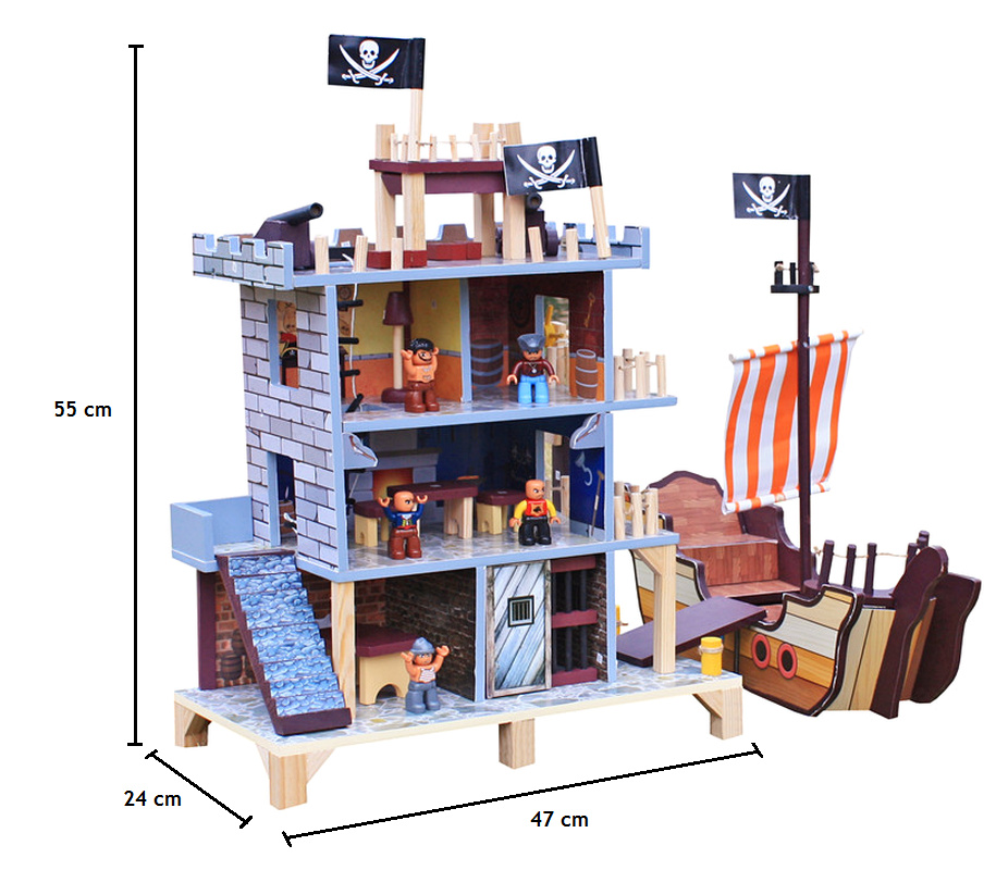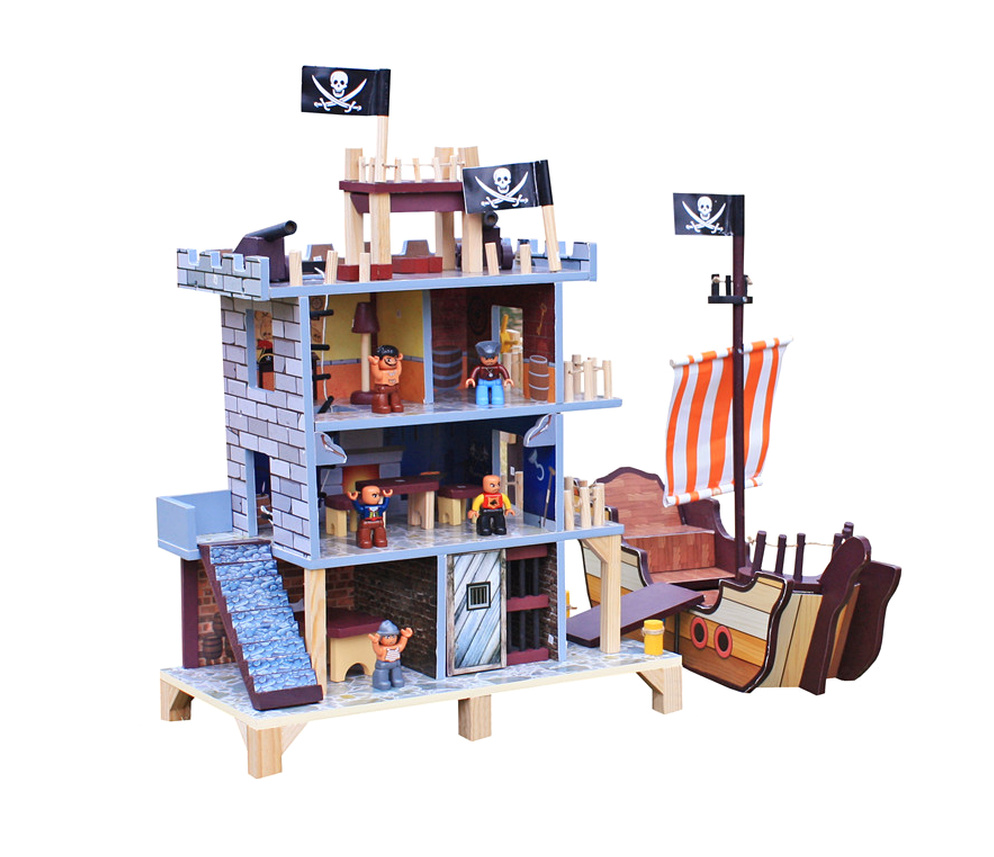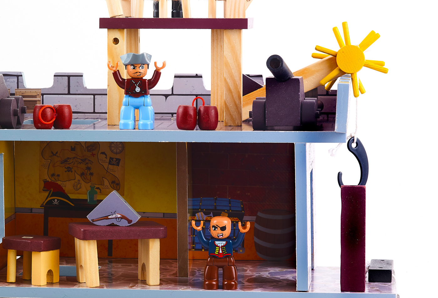 - Ne nedostaje zatvorska ćelija, stražarska kula sa zastavom i dva topa te luka za gusarski brod