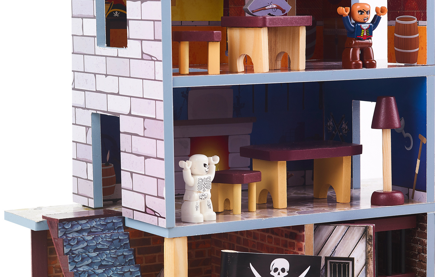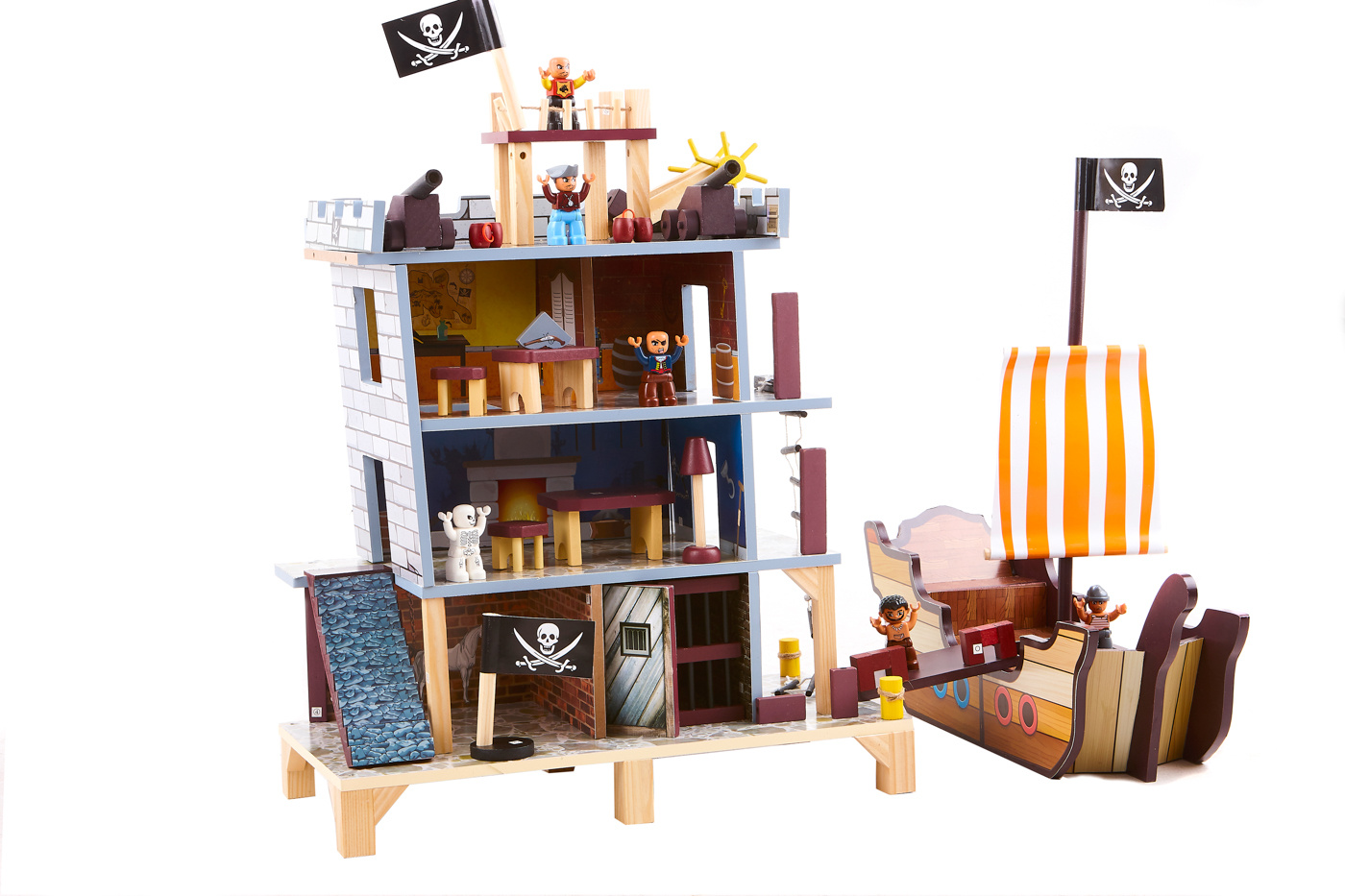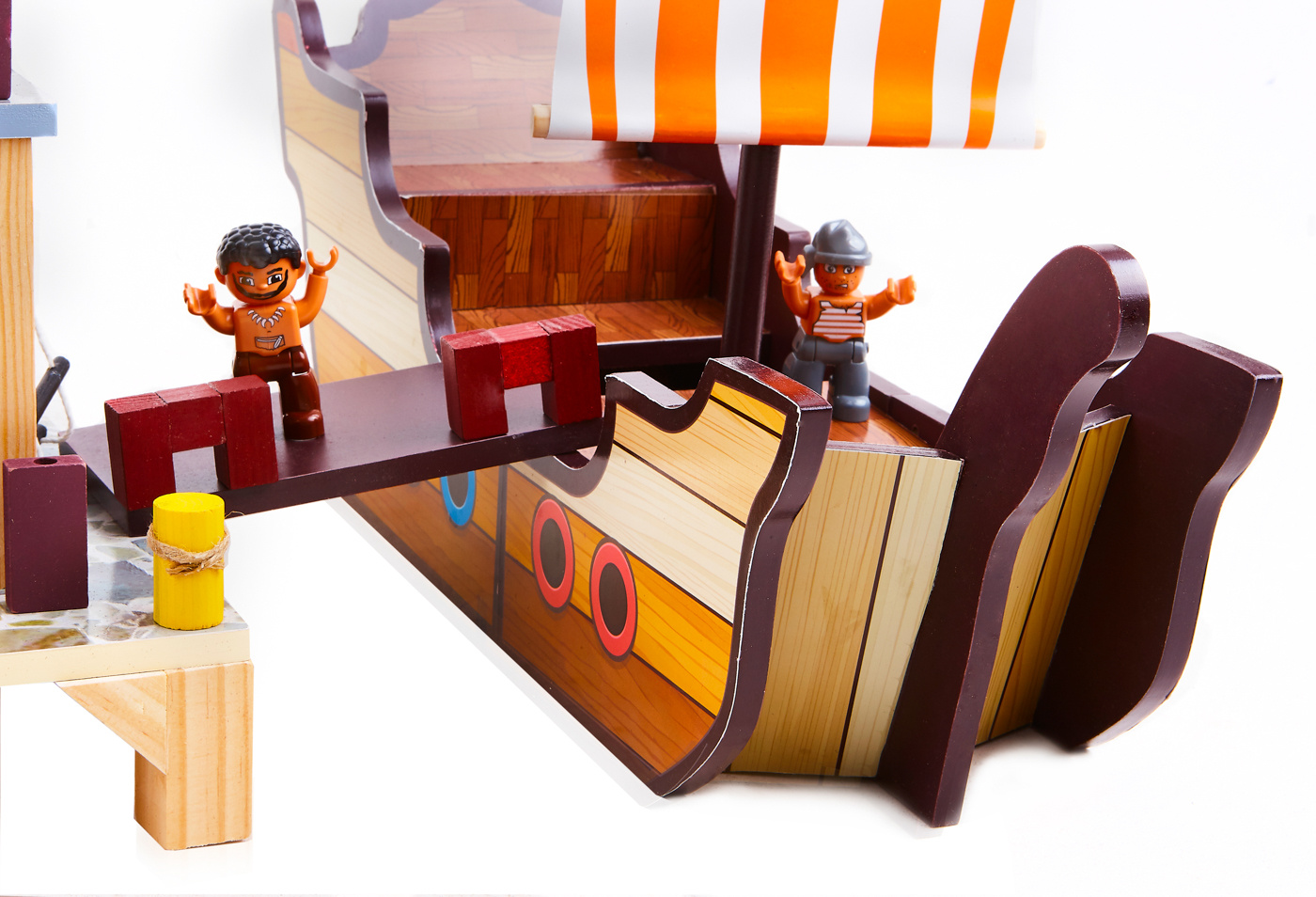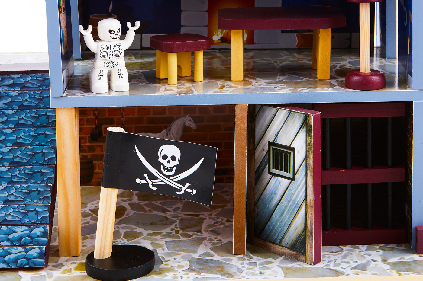 - Ne nedostaje zatvorska ćelija, stražarska kula sa zastavom i dva topa te luka za gusarski brod