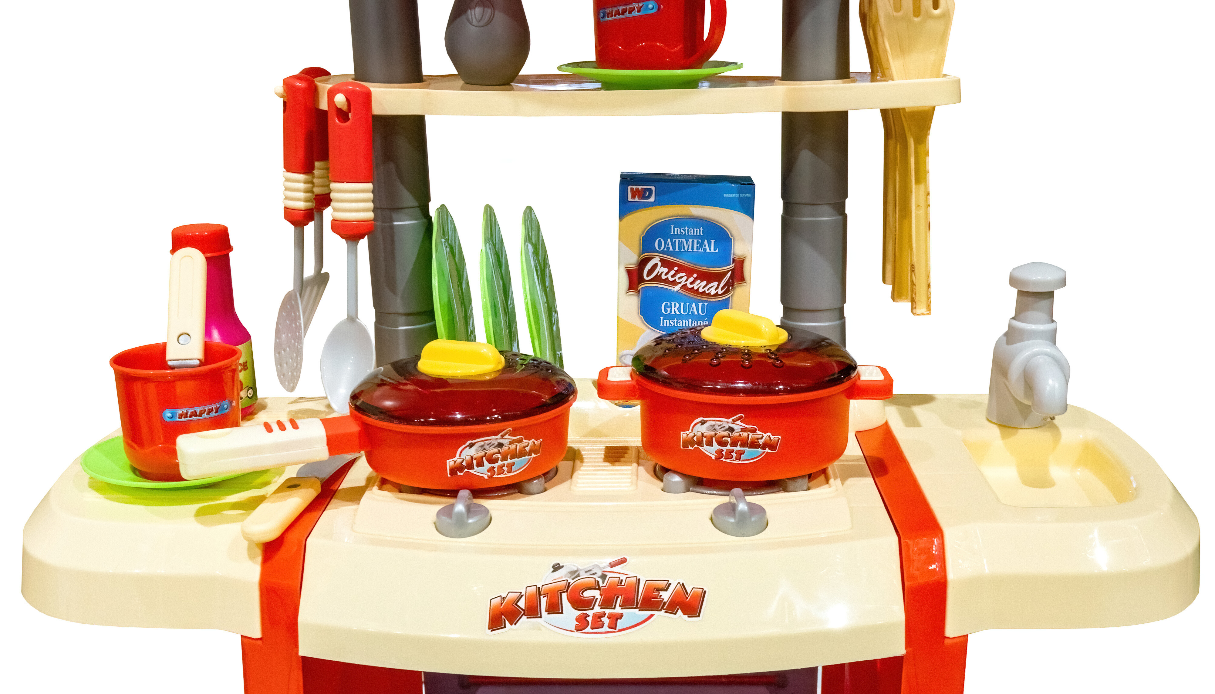 - Sadrži mnogo različitih dodataka kao što su lonac, tava, poklopci, tanjuri, kuhinjski pribor, šalica, namirnice itd.