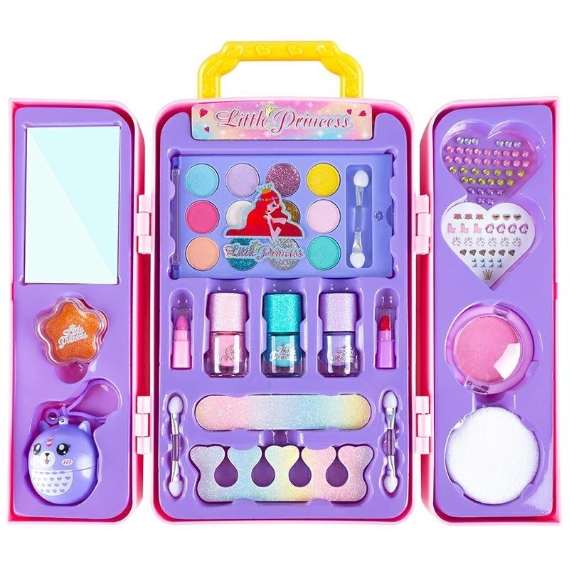 Set kozmetike za djecu u zatvorenom kovčegu. Svi kozmetički proizvodi izrađeni su od sigurnih tvari i lako se ispiru. Set uključuje: kozmetičku torbicu - zatvoreni kovčeg s ogledalom 3 štapića za sjenila 3 laka za nokte 12 sjenila za oči 2 ruža za usne ruž na privjesku rumenilo + spužvicu za rumenilo sjajilo za usne turpiju i razdjelnik za prste naljepnice za nokte i ukrase dimenzije kovčega: 24x16x9cm dimenzije pakiranja: 39,5x31x11cm Igračka je namijenjena djeci od 3 godine. Proizvod zapakiran u dodatnu kartonsku kutiju - spreman za slanje. Količina kom. na paleti: 96