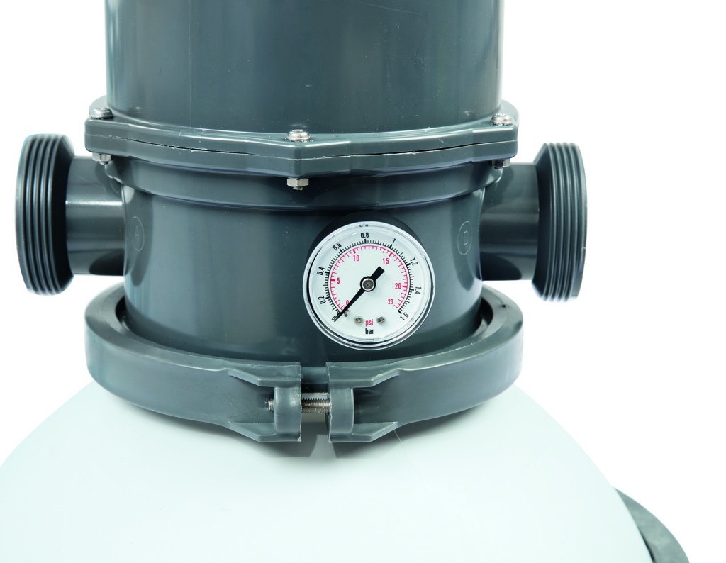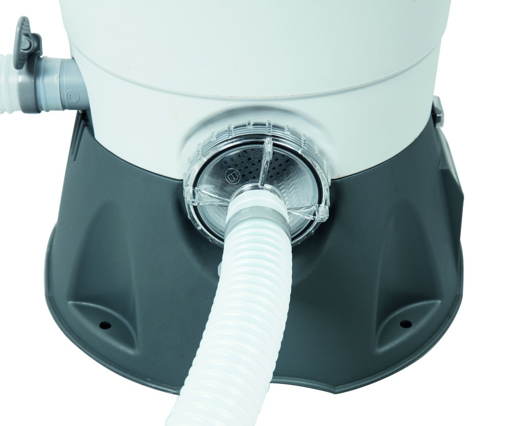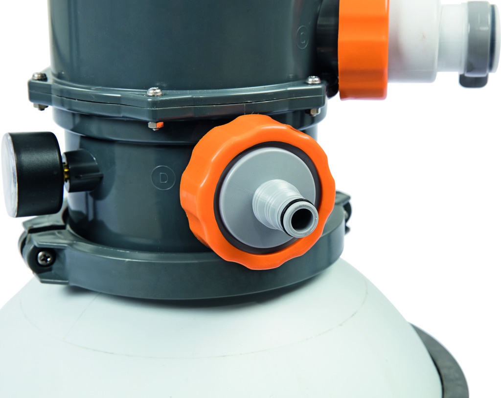 Pješčani filtar uređaj tvrtke Bestway sastoji se od plastične baze, polipropilenskog filtra s gornjim 6-smjernim ventilom, manometra i pumpe s predfiltrom za grube nečistoće.