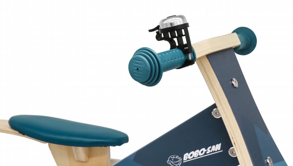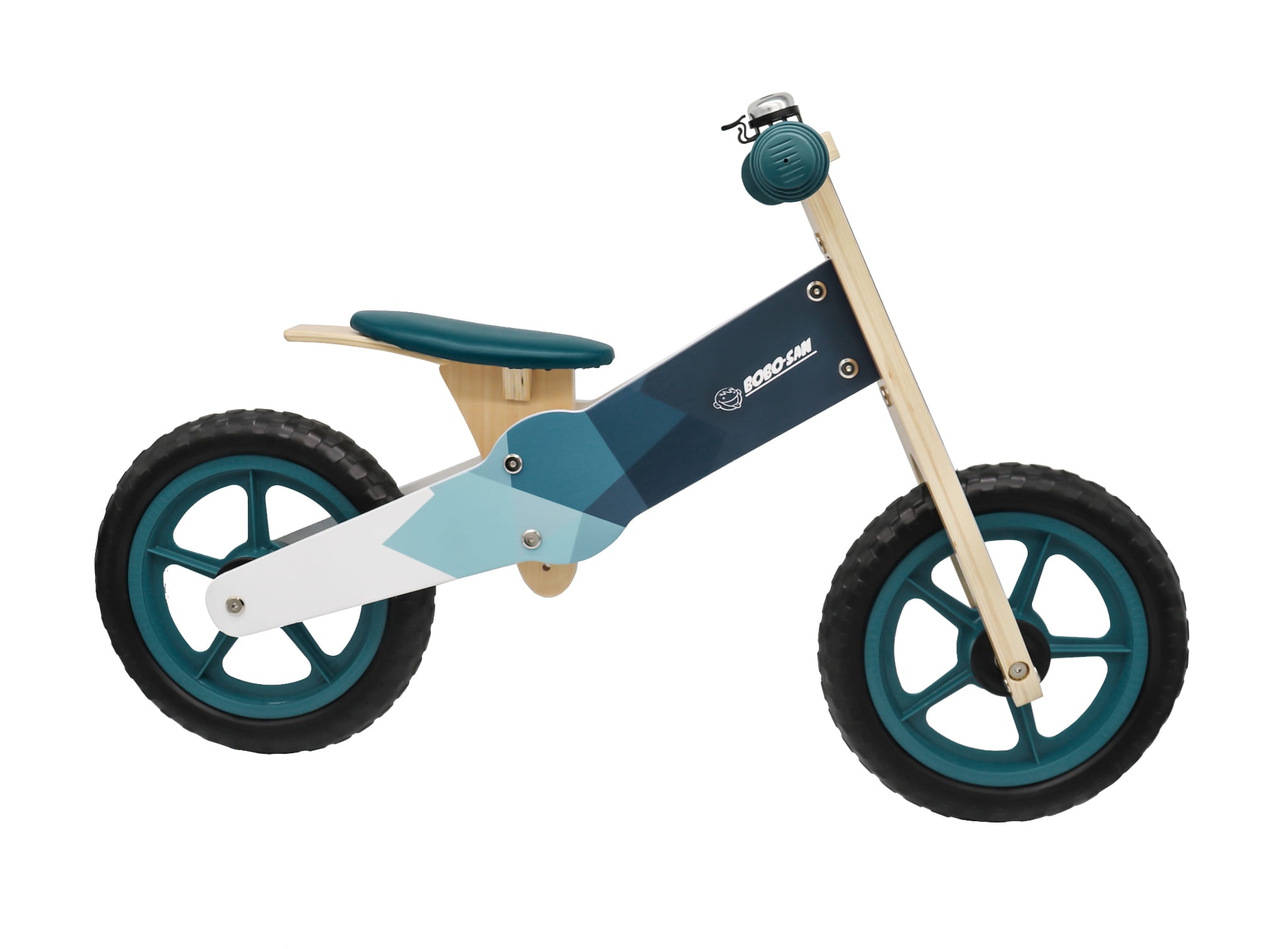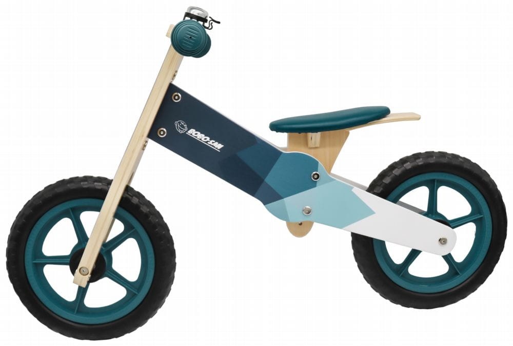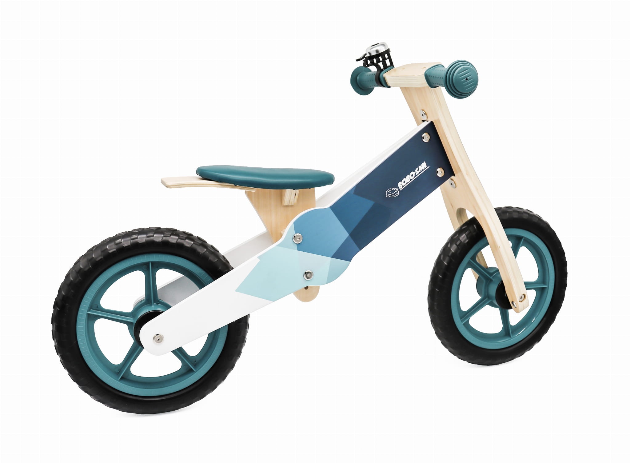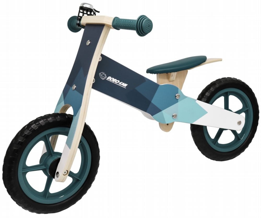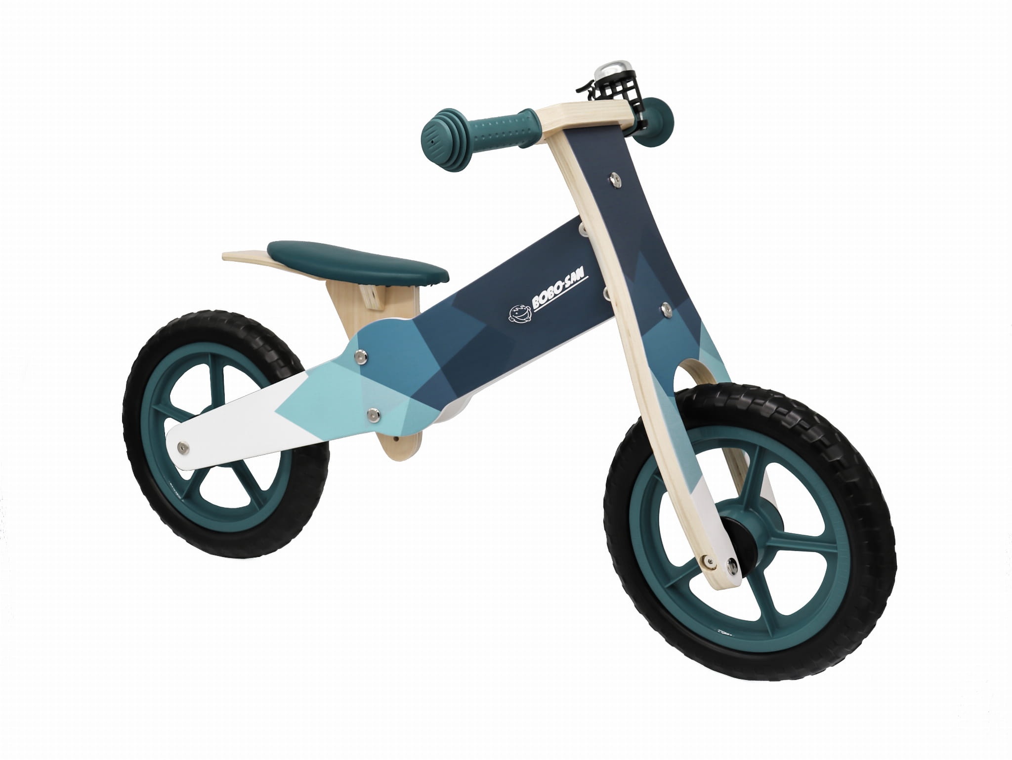 Dječji drveni bicikl bez pedala, s upravljivim upravljačem, ergonomski oblikovanim i podesivim sjedalom po visini.