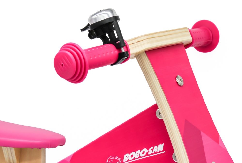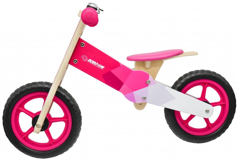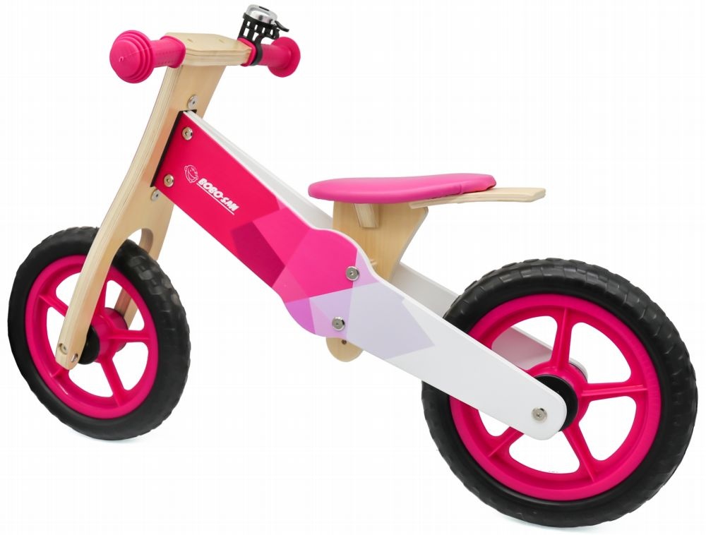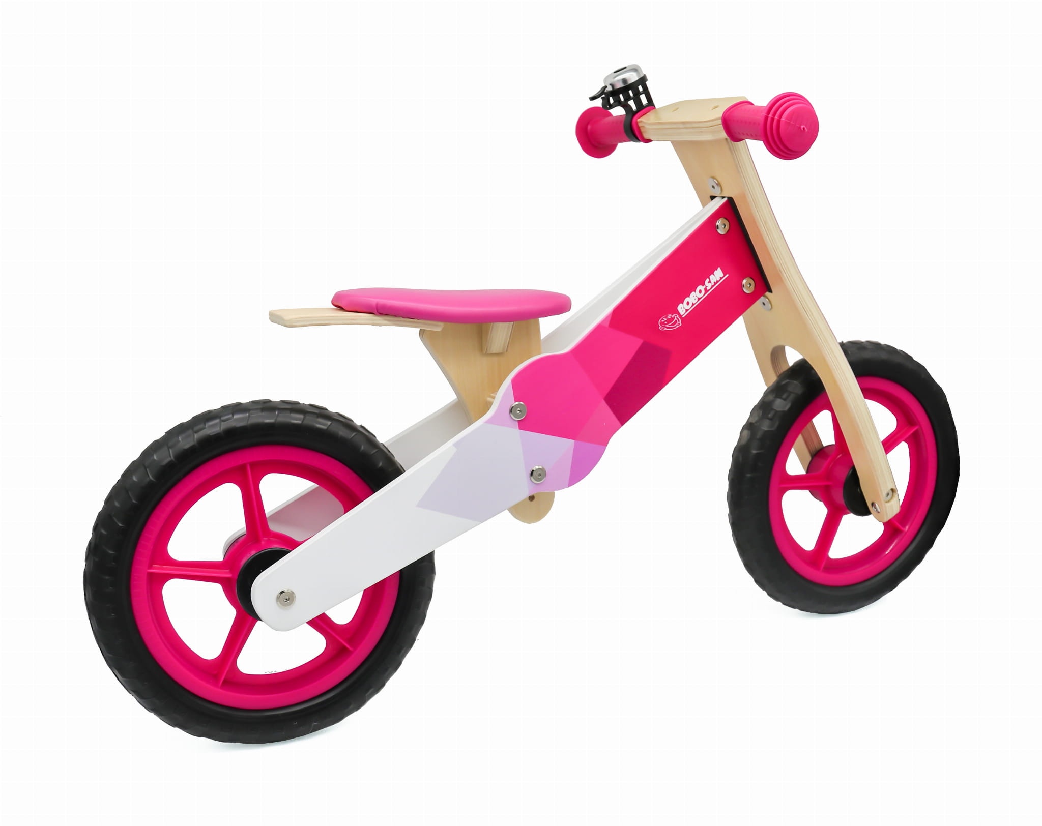 Dječji drveni bicikl bez pedala, s upravljivim upravljačem, ergonomski oblikovanim i podesivim sjedalom po visini.