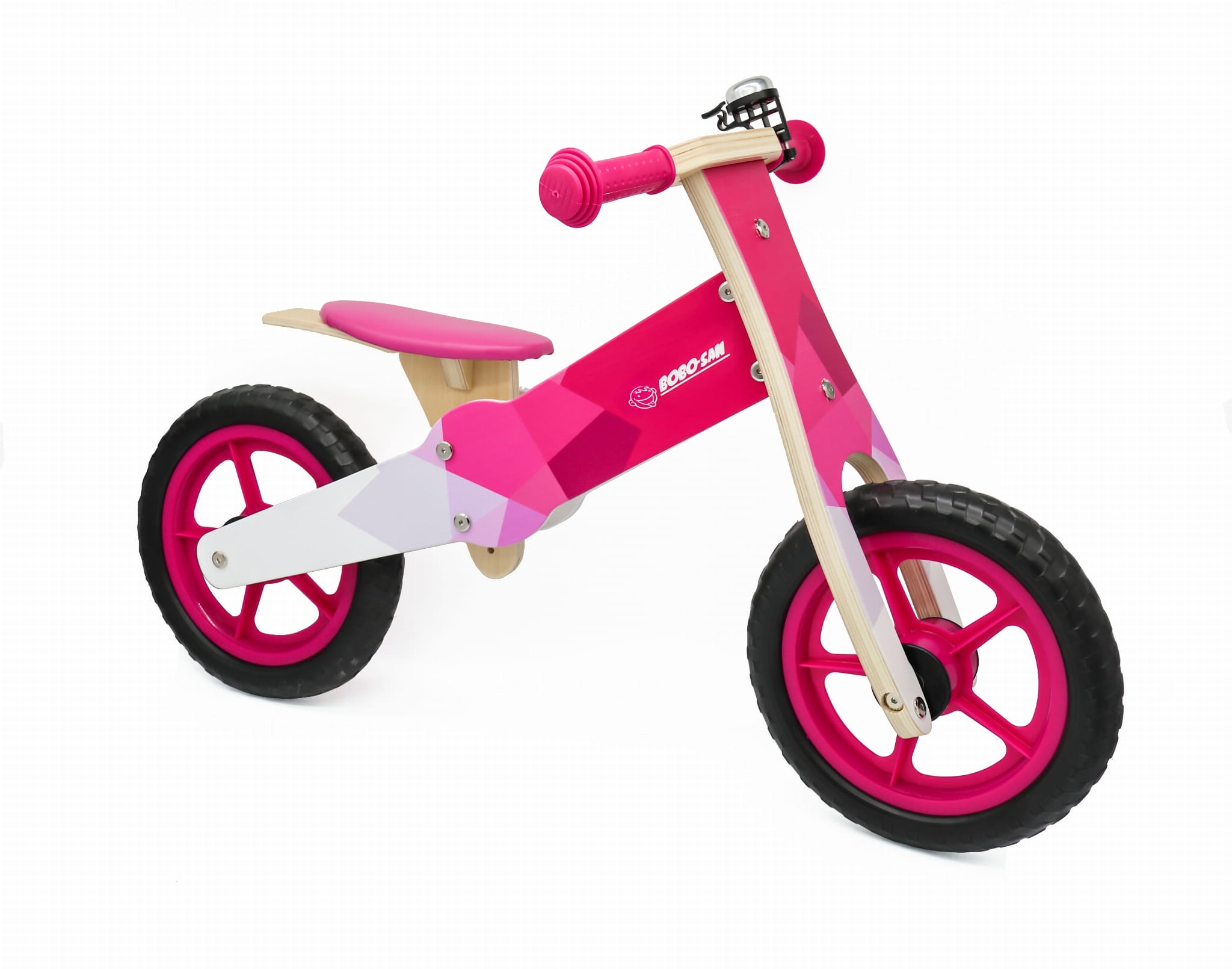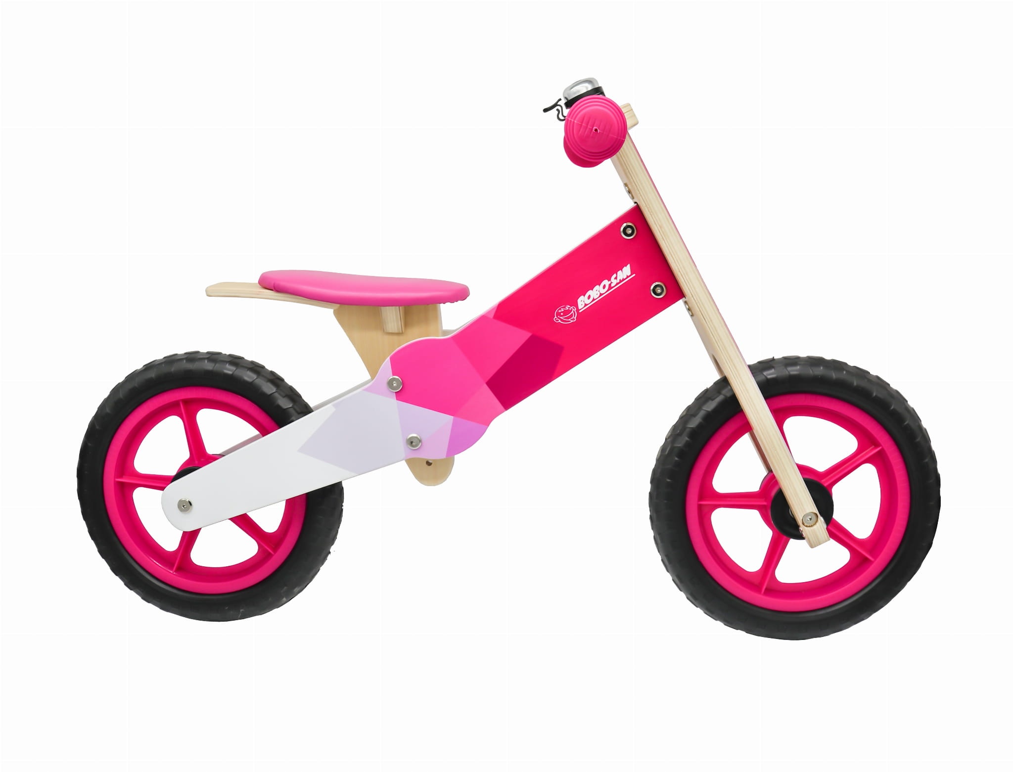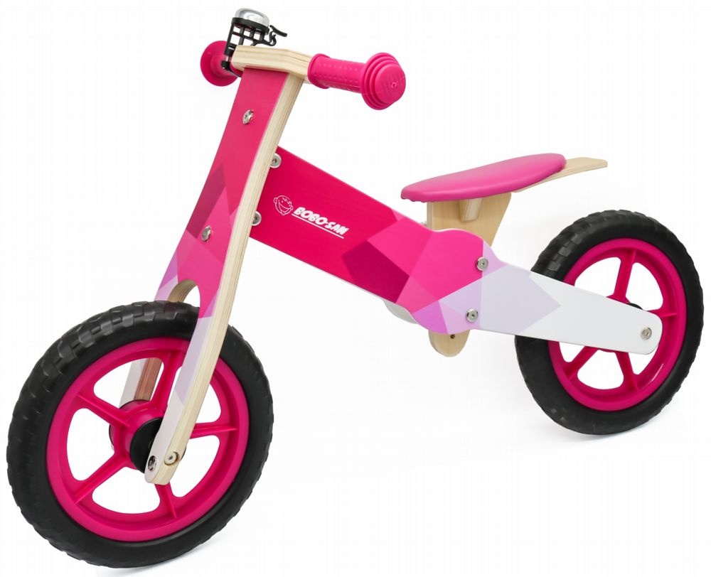 Dječji drveni bicikl bez pedala, s upravljivim upravljačem, ergonomski oblikovanim i podesivim sjedalom po visini.
