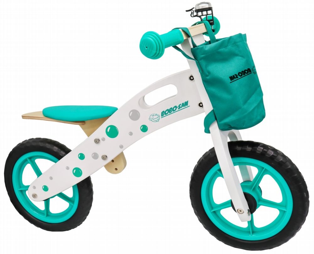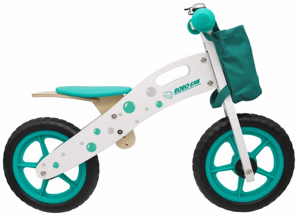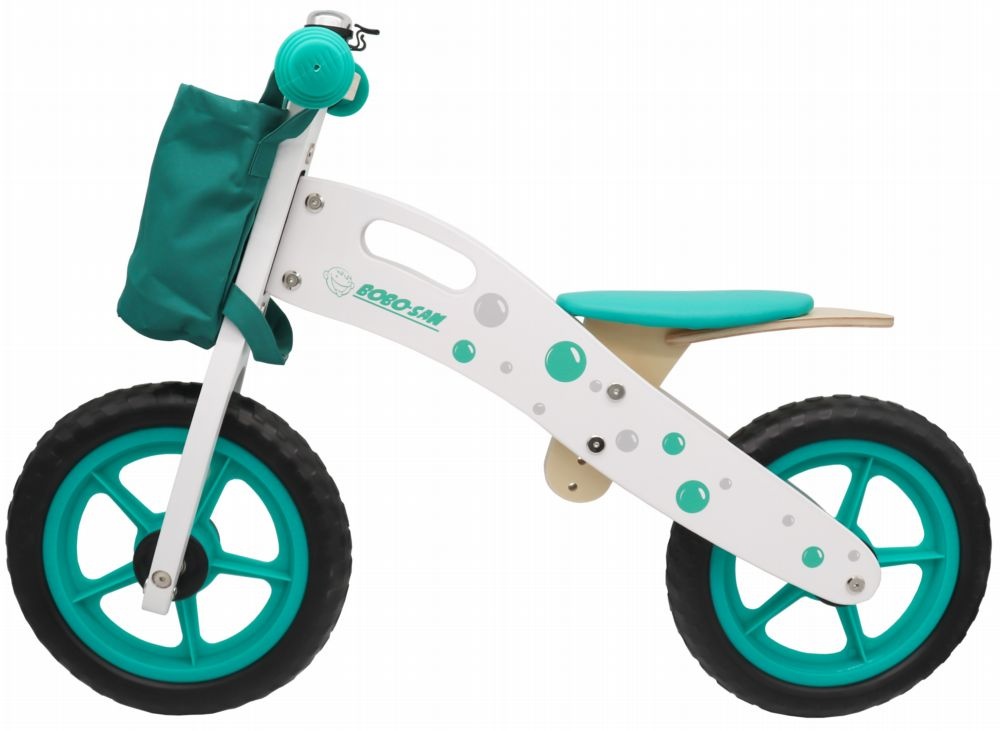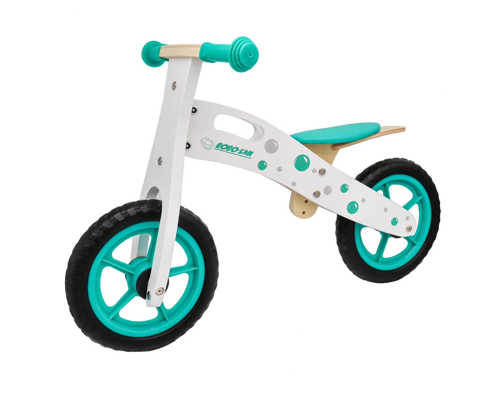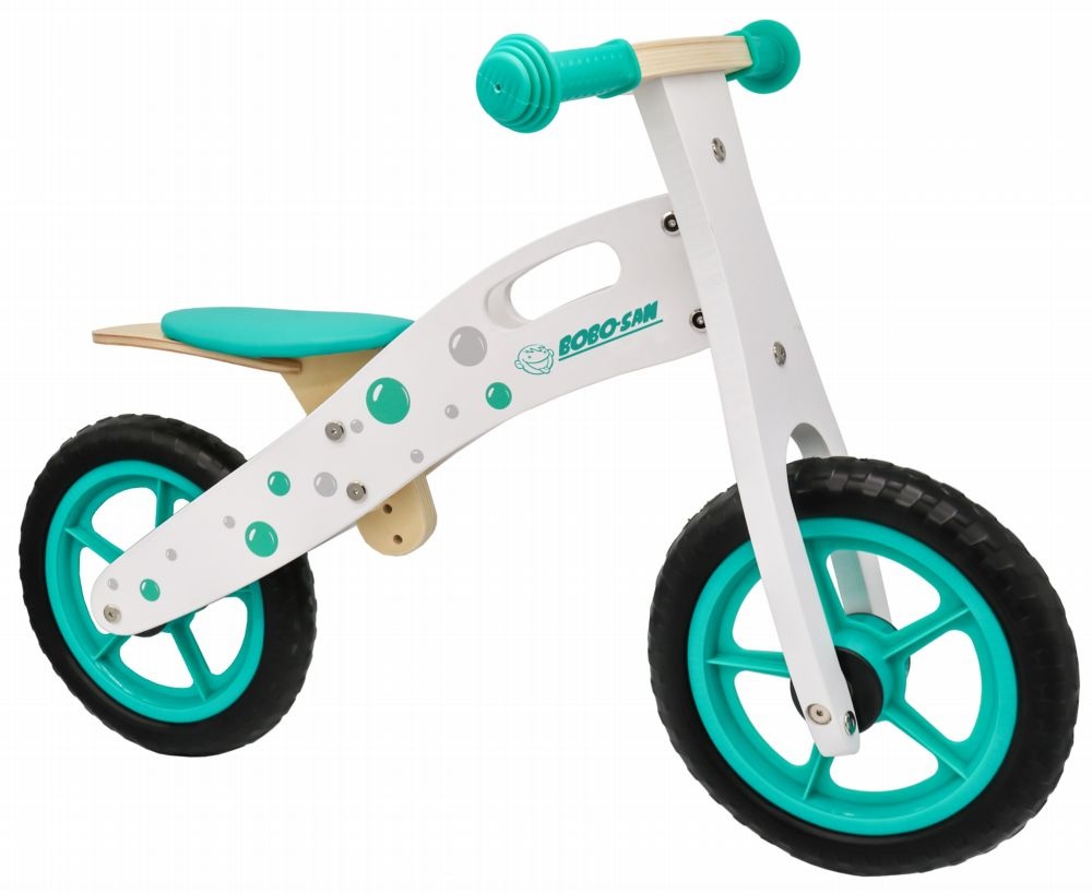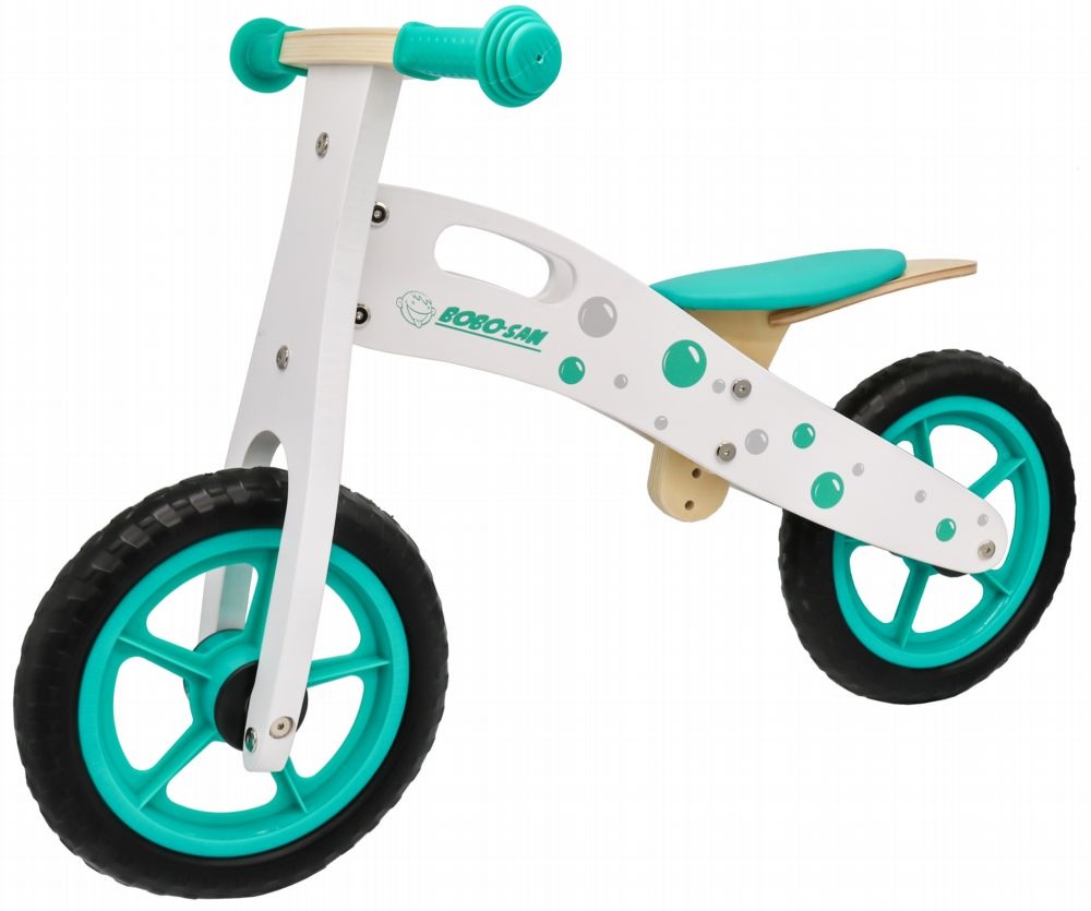 Dječji drveni bicikl bez pedala, s upravljivim upravljačem, ergonomski oblikovanim i podesivim sjedalom po visini. Cijeli opis