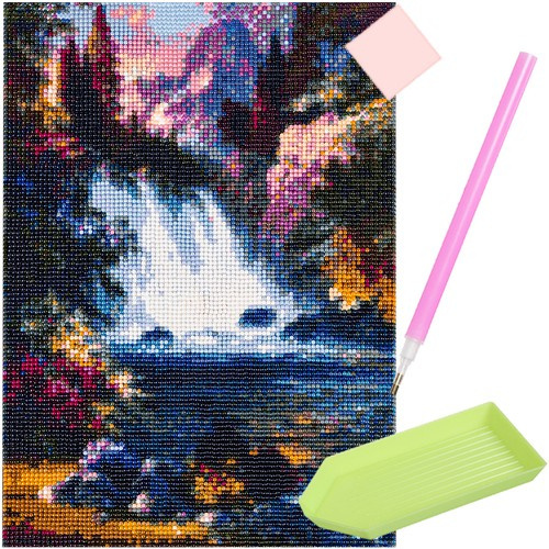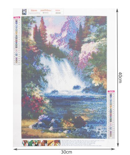 SPECIFIKACIJE – uzorak: vodopad; platno prekriveno ljepljivim slojem: da; u setu: šareni dijamanti, aplikator, suho ljepilo, posudica; dimenzija: 30x40 cm; dimenzija slike: 25x35 cm; težina: 0,1 kg; težina u pakiranju: 0,103 kg