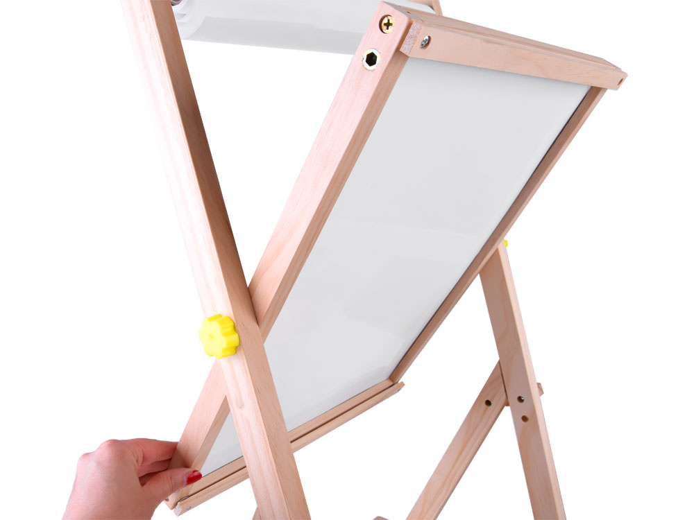 Obostrana drvena ploča s dvije različite površine za slikanje, crtanje ispunjava zahtjeve svakog djeteta. Ploča je opremljena policom za potrebne dodatke, brojalicom, rolnom papira i magnetskim slovima te će svakom djetetu pružiti mnogo kreativne i umjetničke zabave.