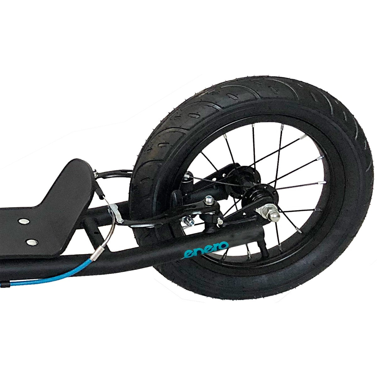 Nafukovací pneumatiky o rozměrech 12" a pevný rám jsou ideální pro rychlou a bezpečnou jízdu.