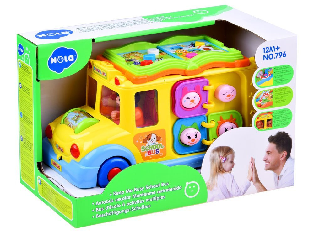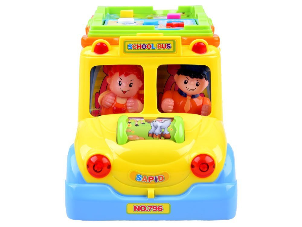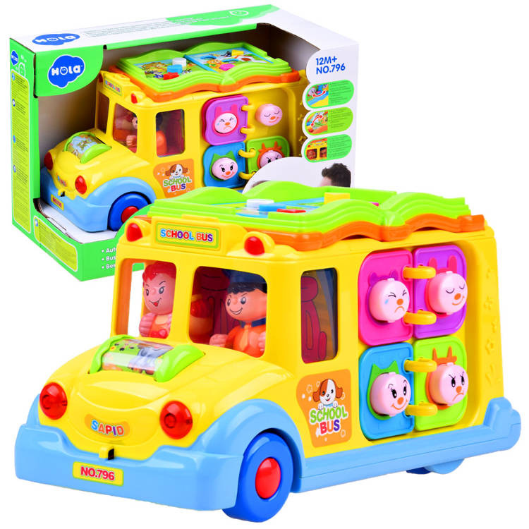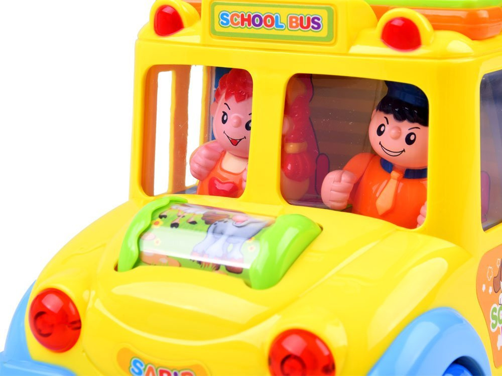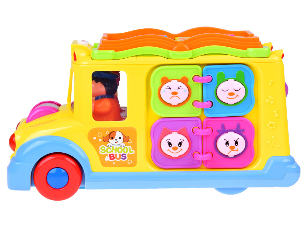 Igračka može sama voziti i mijenjati smjer vožnje svaki put kada naiđe na prepreku, ali dijete je također može samostalno upravljati. Tijekom vožnje svira vesela glazba i trepere prednja svjetla. U prednjem dijelu autobusa nalazi se šareni rotirajući valjak sa životinjama, koji nakon okretanja pušta zvukove smijeha djeteta i melodiju. Na krovu igračke nalazi se šarena brošura s gumbima različitih boja i oblika. Pritiskom na gumbe pokreću se zvukovi životinja koje su na slici. Tipke također pokreću zvukove sirene, pokretanje motora i melodije. Na boku automobila nalaze se 4 smajlića s različitim izrazima od veselog do tužnog. Smajlići su okruženi šarenim okvirima koji su raspoređeni kao stranice knjige. Na drugoj strani vozila nalaze se 4 zupčanika s ručicom kojom se može okretati. Na stražnjoj strani igračke su vrata s zvonom koje proizvodi zvuk. Iza vrata su šarene slike koje se mijenjaju nakon okretanja ključa.