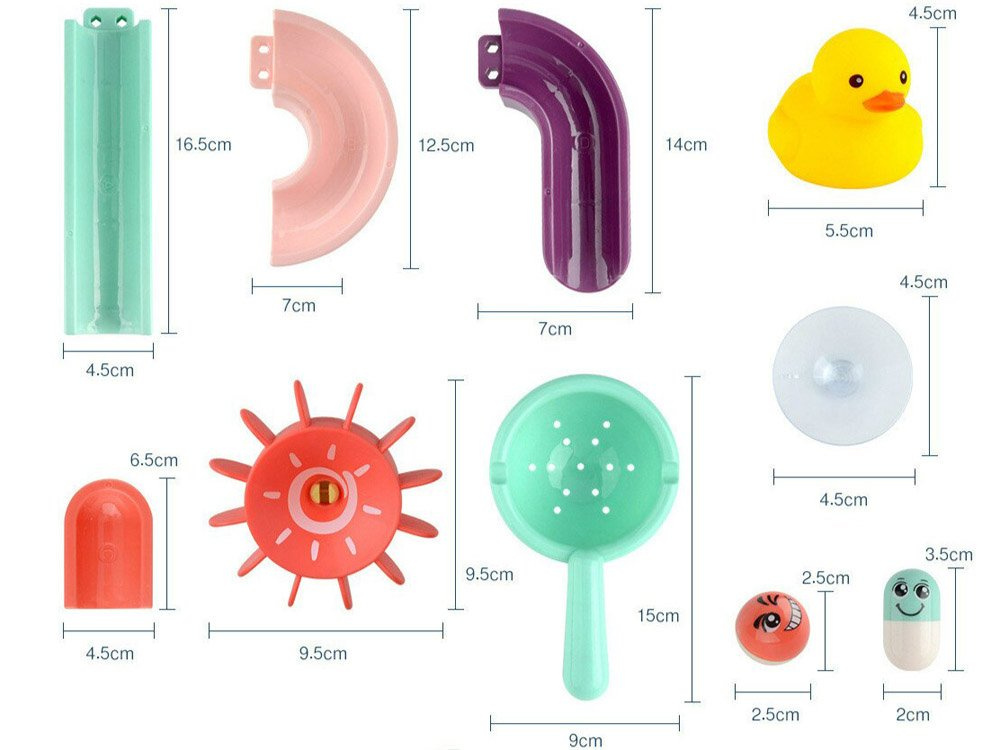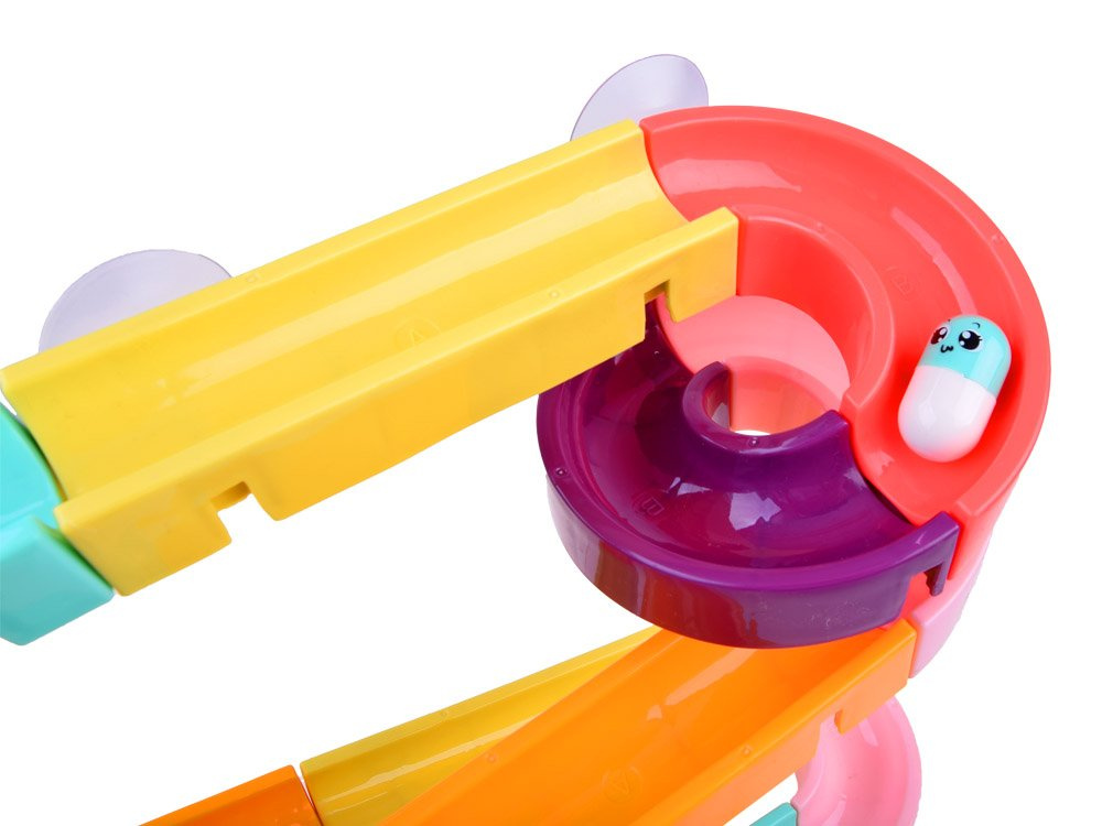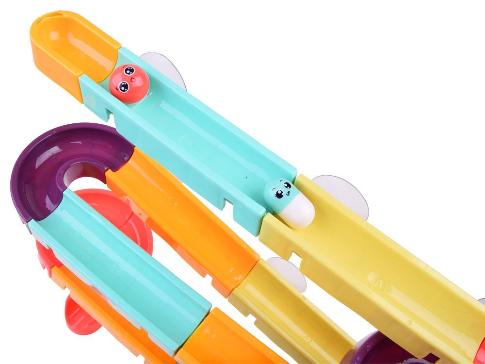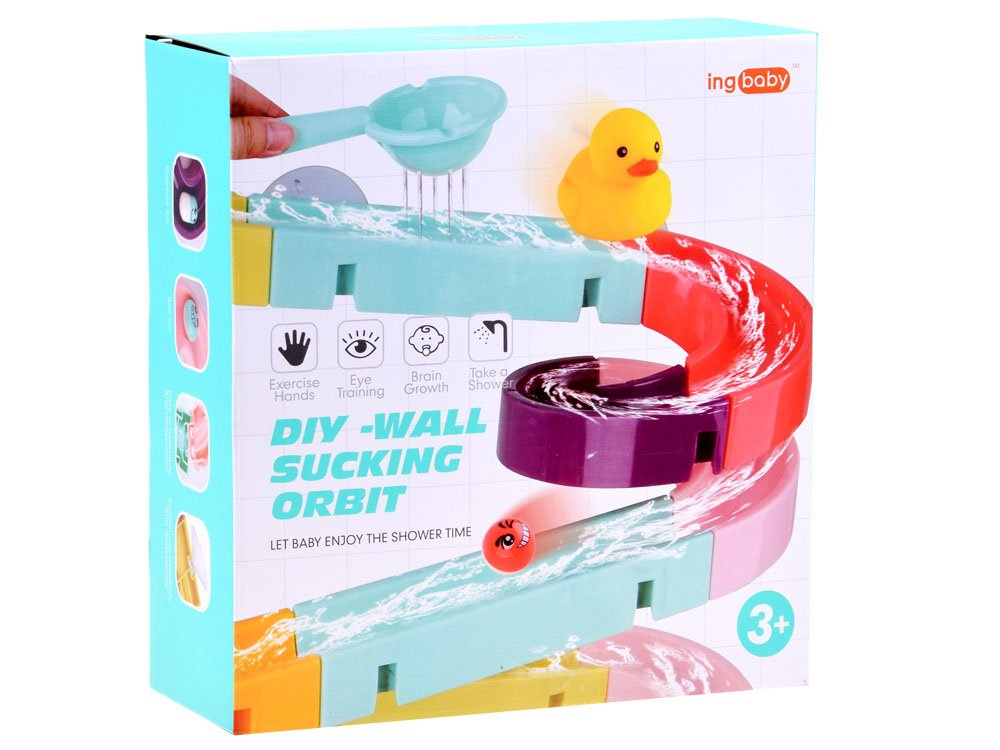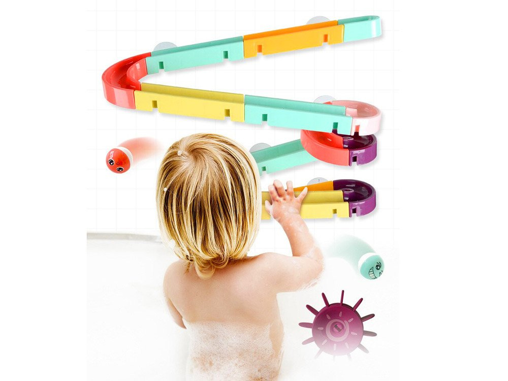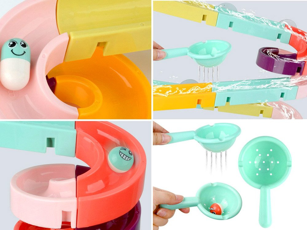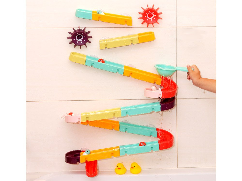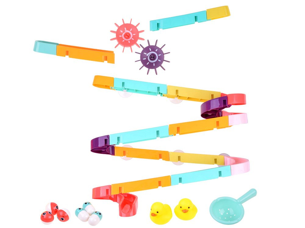 Set je izrađen od plastike i ima silikonske usisne čašice, tako da se staza može pričvrstiti na pločice u kupaonici. Dio paketa uključuje šarene dijelove za sastavljanje spiralne staze, gumene patkice, loptice, grah i cjedilo. Tijekom kupanja dijete može smišljati fantastične igre s patkicom koja bježi, lopticom koja se kotrlja i valjcima koje se mogu zalijepiti jedan uz drugi kako bi dijete moglo okretati oba istovremeno. Set se sastoji od 44 dijela od kojih možete izgraditi tobogan.