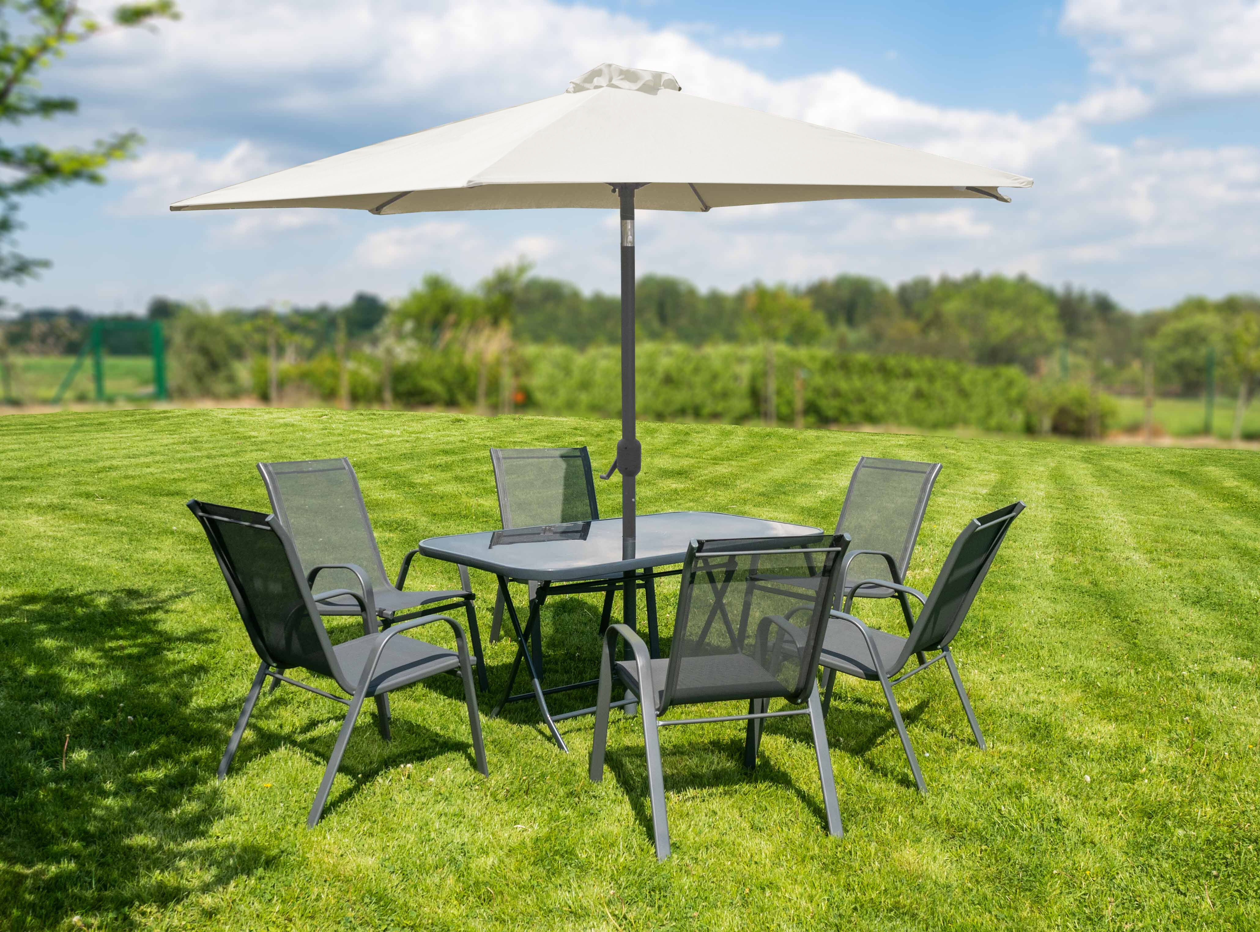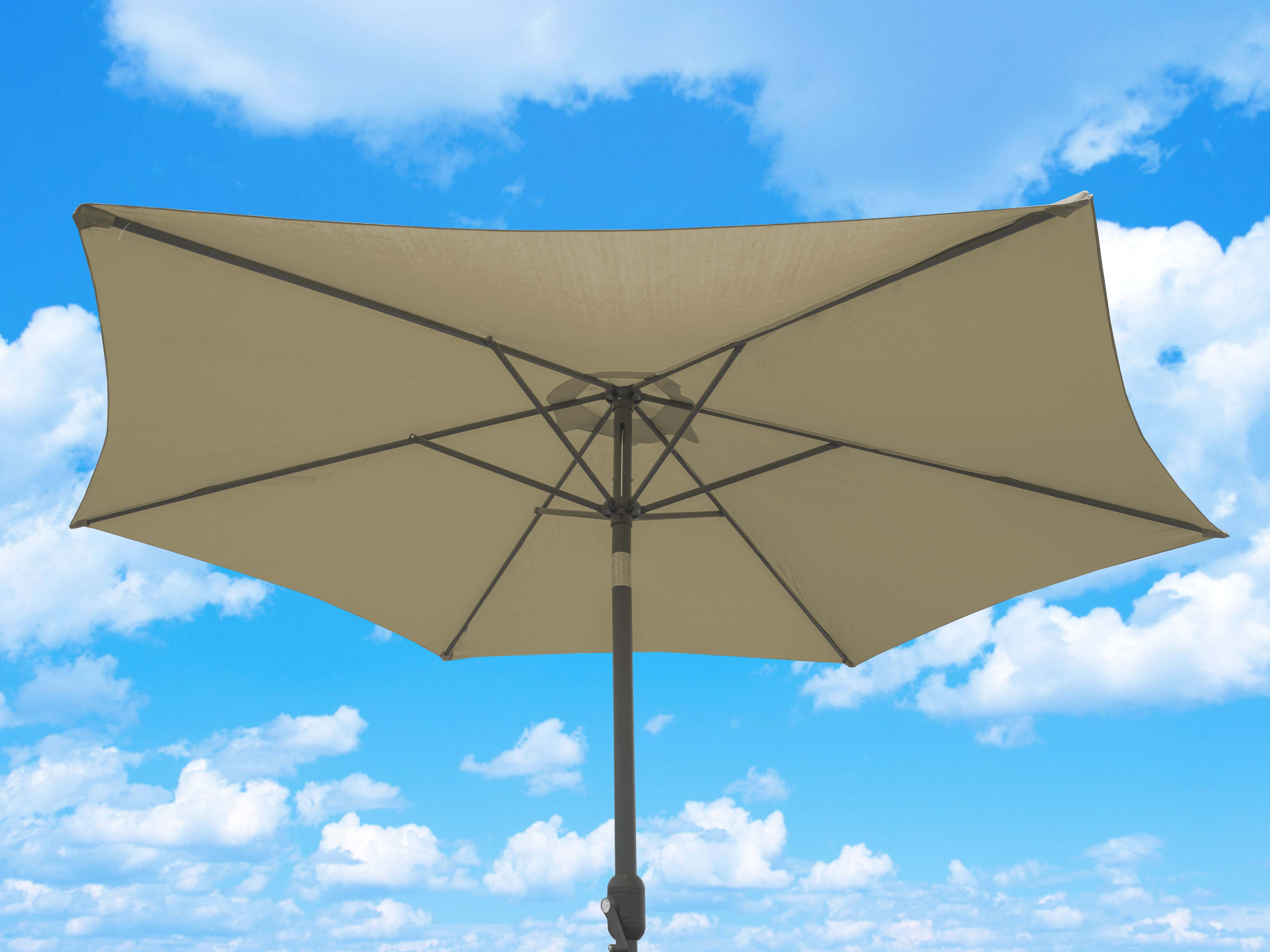 Klasični vrtni suncobran s čvrstom konstrukcijom i kvalitetnim pokrovom, izrađenim od izdržljivog poliesterskog materijala.