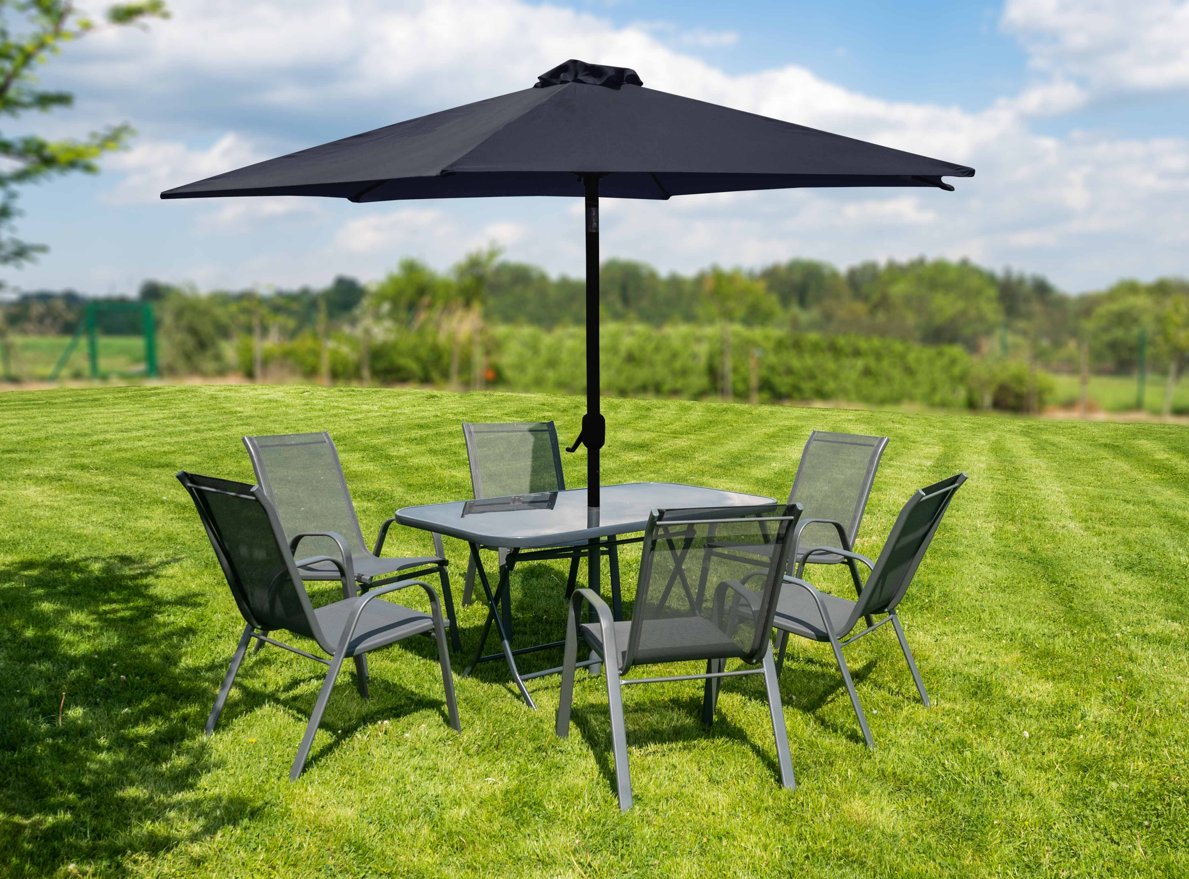 Klasični vrtni suncobran s čvrstom konstrukcijom i kvalitetnim pokrovom, izrađenim od izdržljivog poliesterskog materijala.