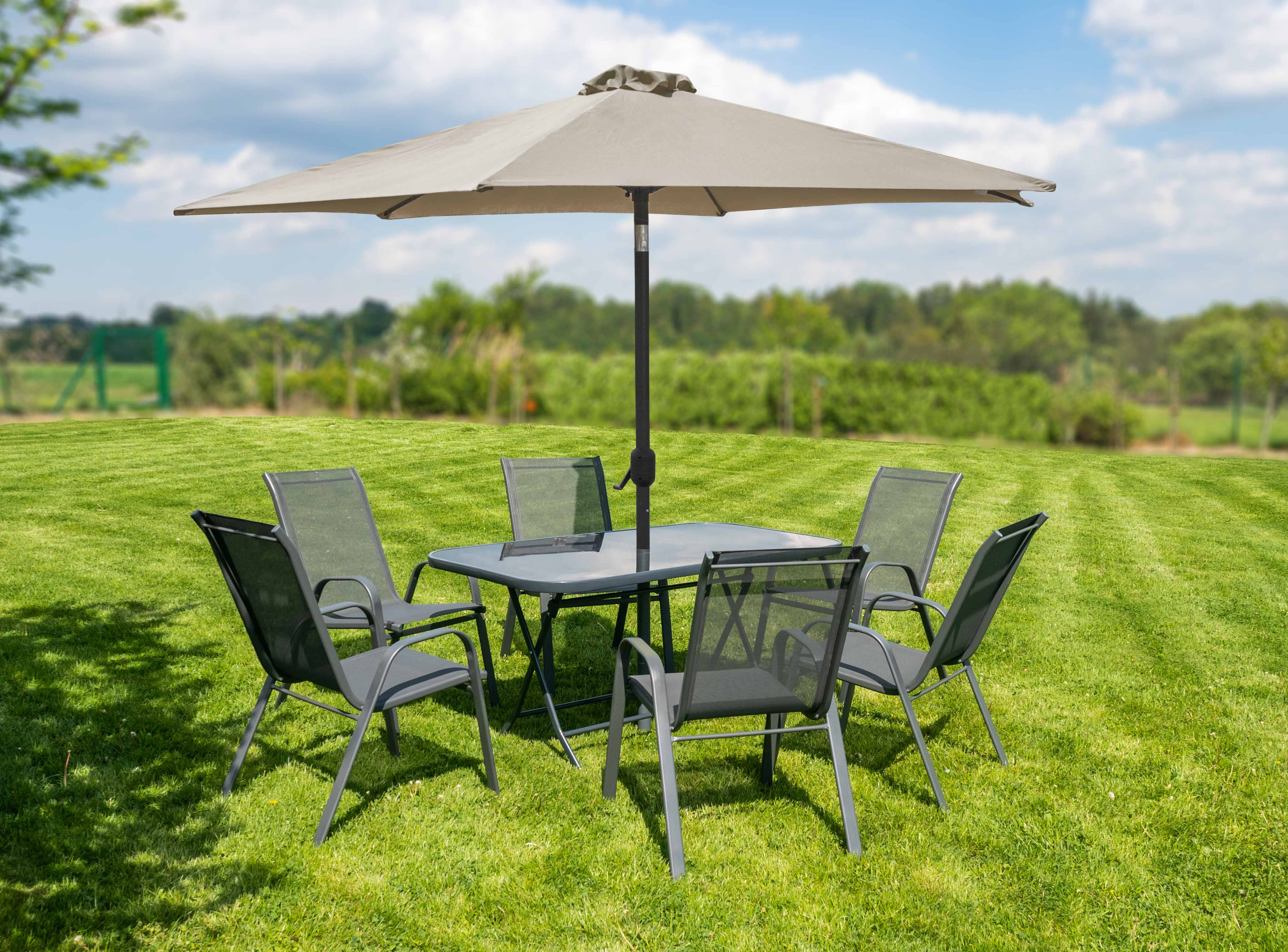 Klasični vrtni suncobran s čvrstom konstrukcijom i kvalitetnim pokrovom, izrađenim od izdržljivog poliesterskog materijala.