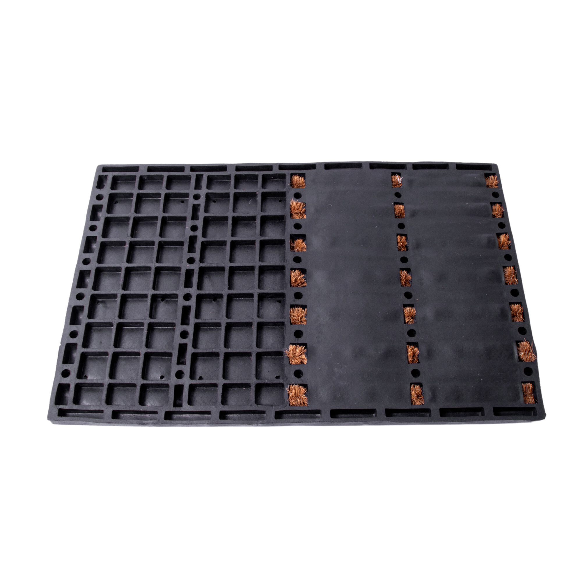 Kokosova prostirka izrađena je od prirodnog materijala, što je čini ekološkom i prijateljskom prema okolišu. Kokosova prostirka je vrlo izdržljiva i podnosi opterećenje velikog broja pješaka. Stoga je idealan za korištenje u prolaznim prostorima. Kokosova prostirka ima sposobnost upijanja vlage, što je čini izvrsnim izborom za ulaze i hodnike, gdje može upiti vlagu s cipela i zadržati nečistoće.Gumeni dio s detaljem otiska prikladan je za odlaganje prljave/mokre obuće.