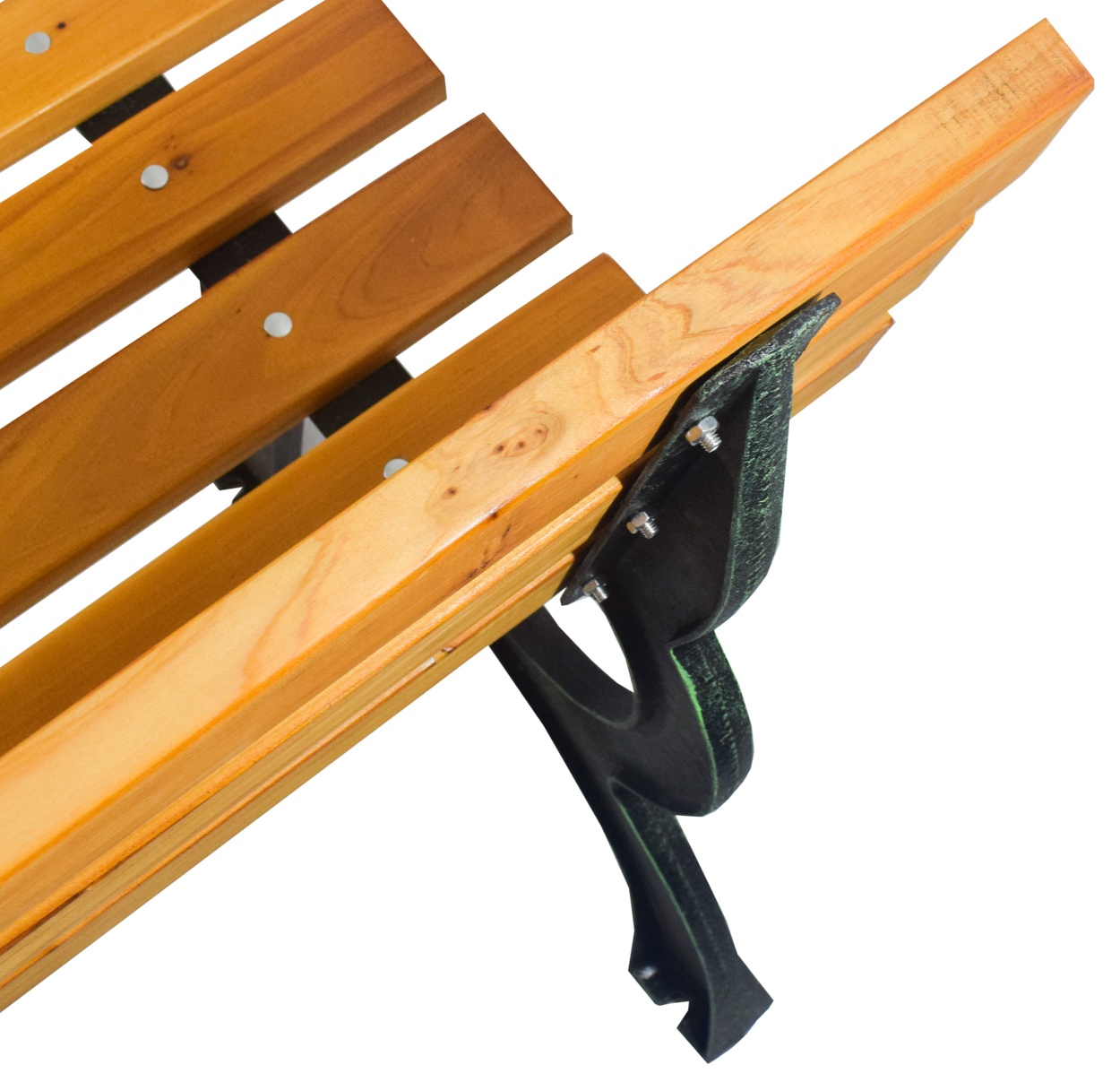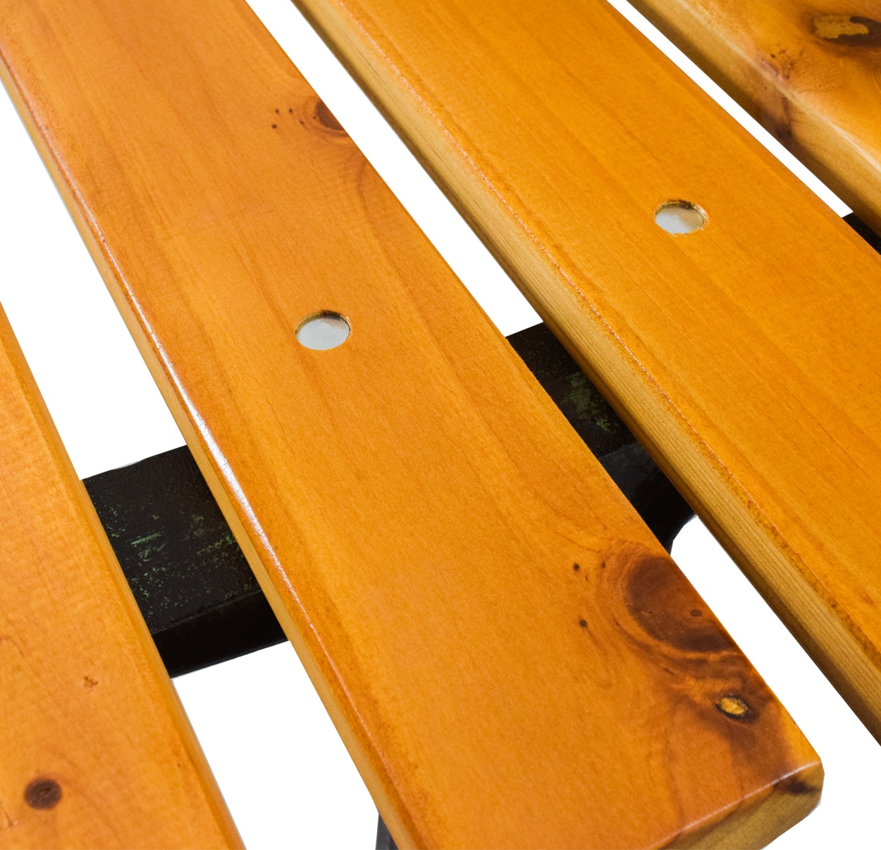 Čvrsta konstrukcija od lijevanog željeza, koja je dopunjena drvenim letvicama. Nosivost klupe 240 kg.