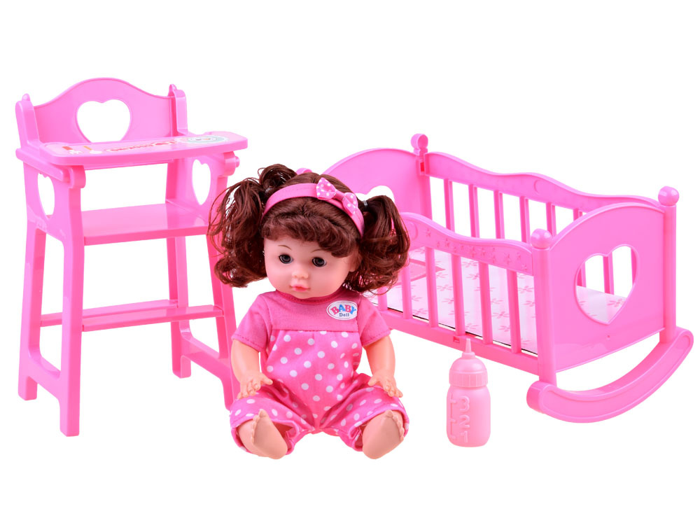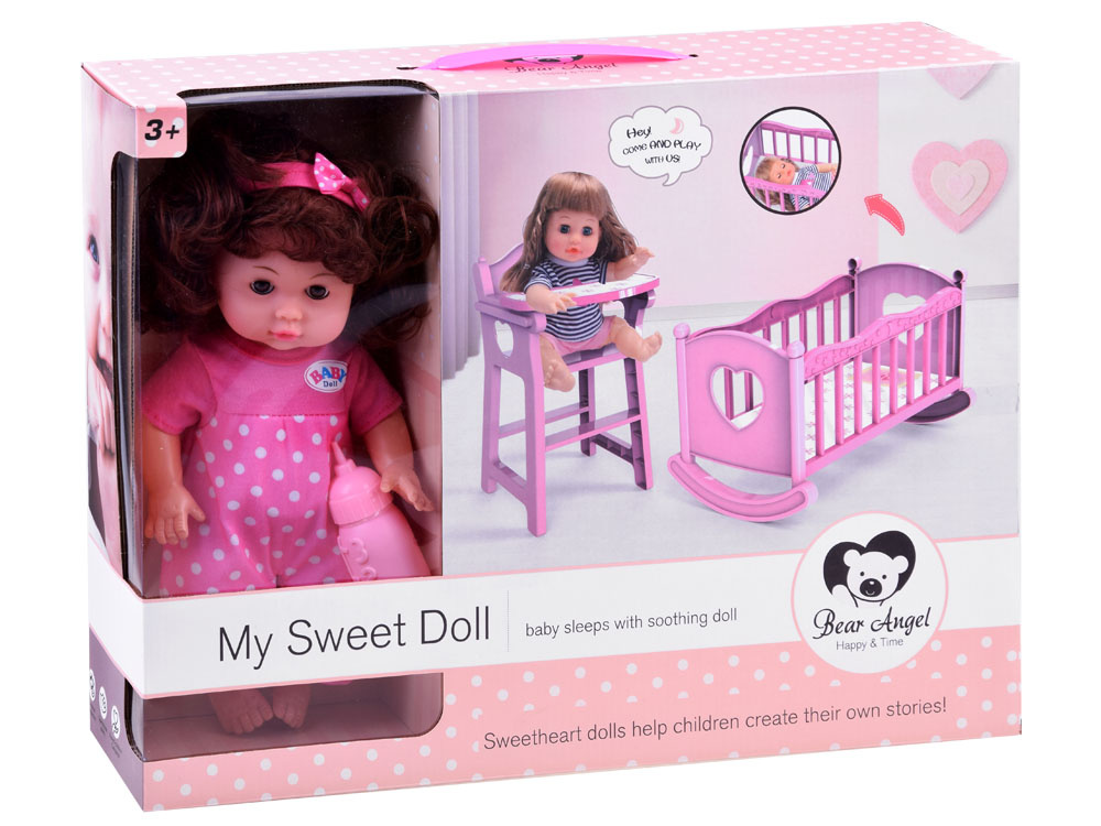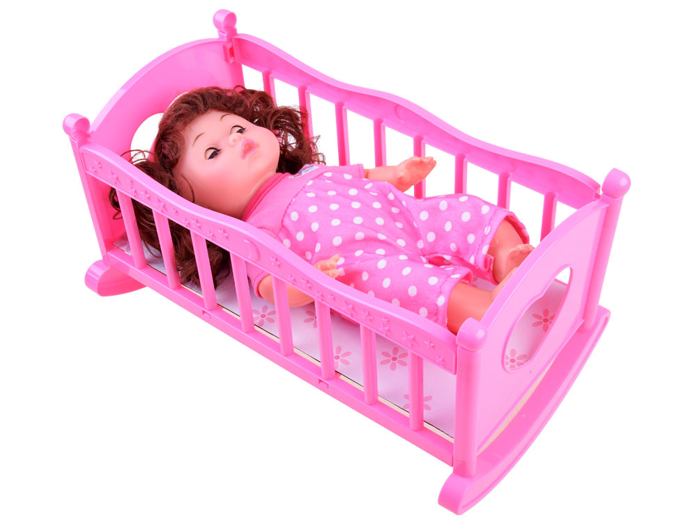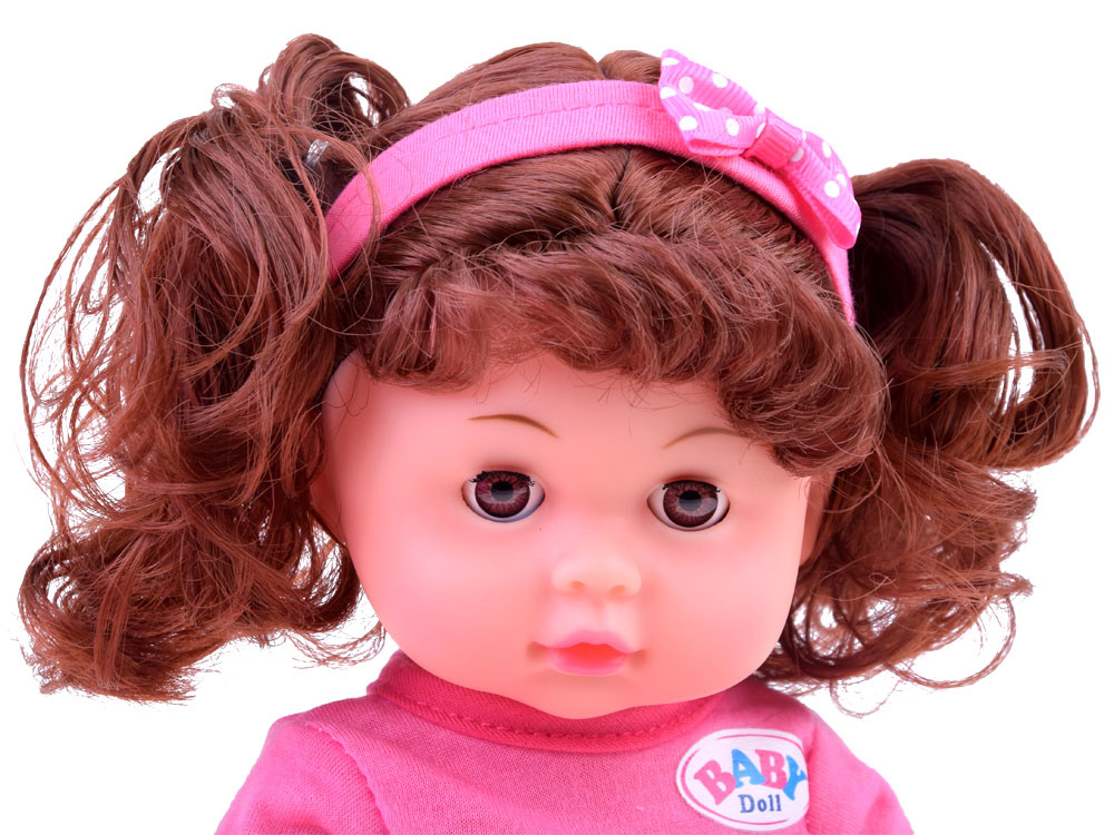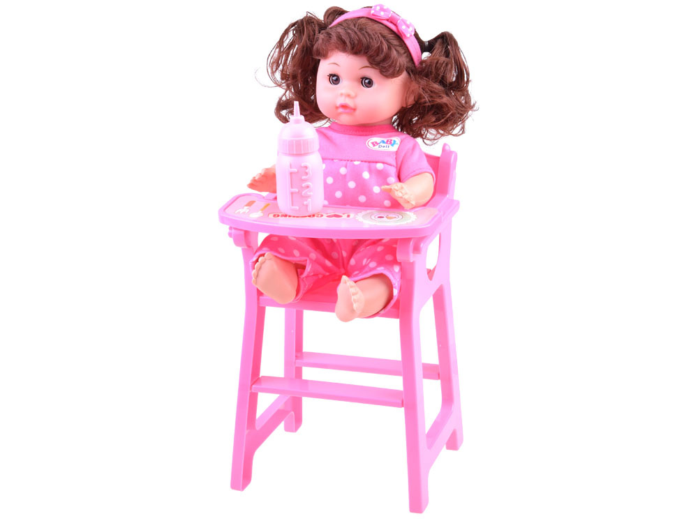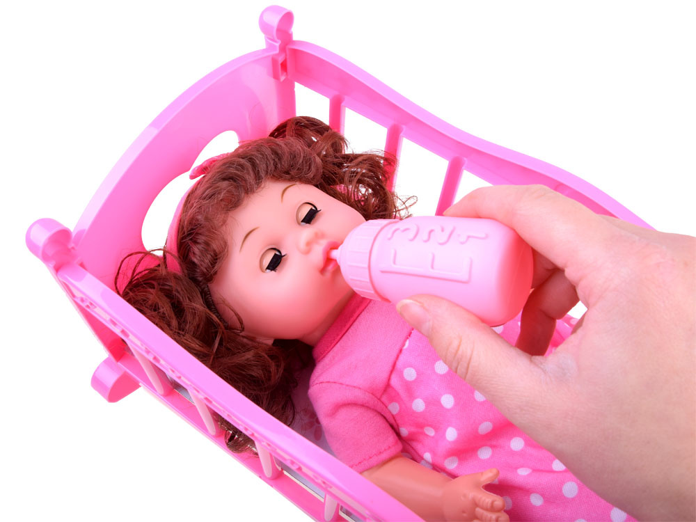 Lijepa lutka s kompletom dodataka razveselit će svaku djevojčicu. Set uključuje ružičaste dodatke za lutku: krevetić, stolicu i bočicu za hranjenje. Dijete ima funkciju pijenja (zahvaljujući vrpci), jednostavno napunite bočicu vodom, dajte djetetu da pije, stavite pelenu ili brzo idite na tutu. Lutka ima govornu funkciju zahvaljujući zvučniku ugrađenom u trbuh.Govori poljske riječi: mama, tata i također se smije, plače, ispušta zvukove jedenja i pijenja itd. Odjevena je u prekrasni ružičasti kombinezon s točkicama i na glavi ima slatku ružičastu traku s mašnom. Sve dijelove ormara lako je skinuti kada želimo promijeniti njezinu odjeću. Lutka ima dugu kovrčavu kosu svezanu u dva repa, što joj daje šarm. Tijelo lutke je izrađeno od plastike i ima pokretne ruke i noge, dok je glava lutke gumena. Kad položite lutku na leđa, oči joj se zatvore. Boca, stolica i krevetić izrađeni su isključivo od plastike, a krevetić dolazi s kartonskim madracem.