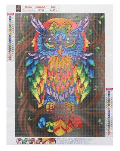 Preporučujemo otkriti uvijek taj dio platna na kojem radite kako se ne bi gubila viskoznost ljepila. Kamenčići su podijeljeni u nekoliko vrećica i označeni kodom. Platno sadrži legendu, prema dodijeljenim kodovima prepoznajete gdje zalijepiti kamenčiće. uzorak: sova
