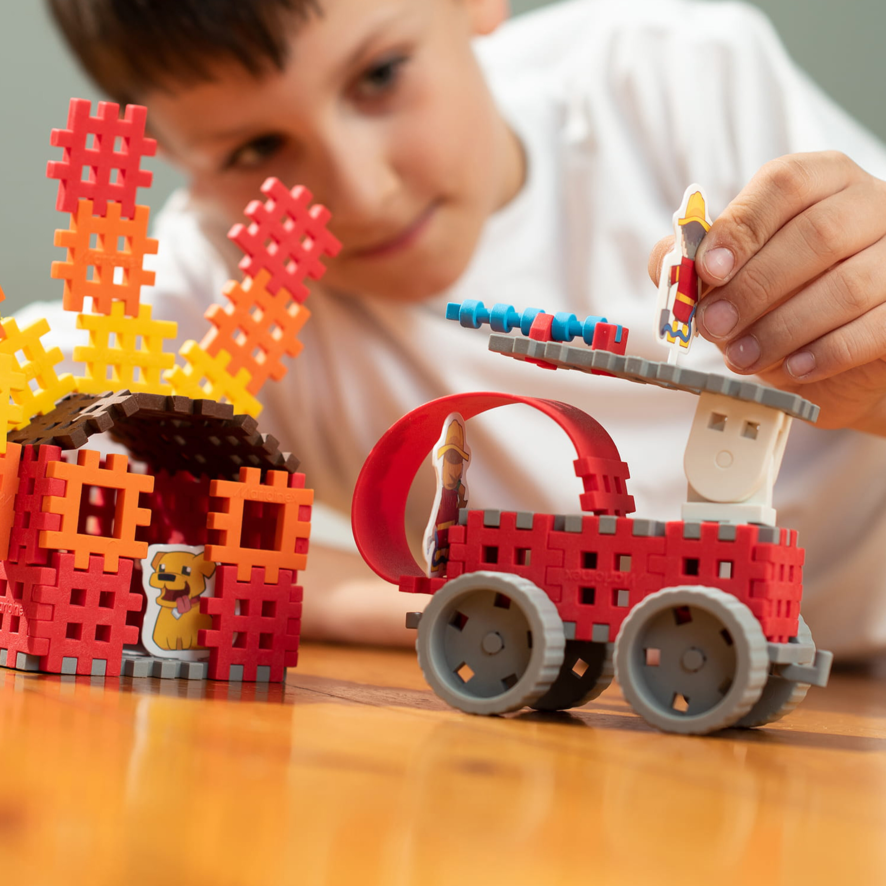 Dok igra, vaše dijete će izgraditi zgradu u plamenu i vatrogasno vozilo.