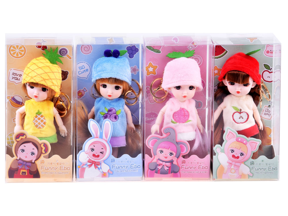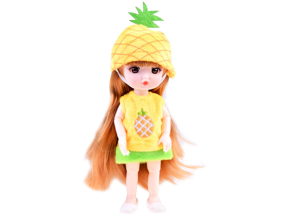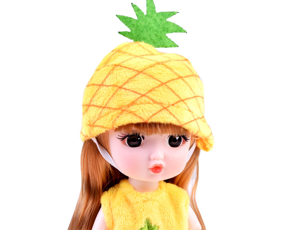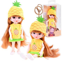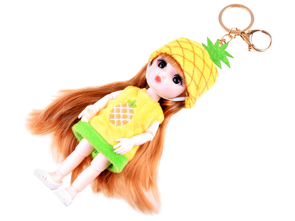 Privjesak za ključeve kao lutka Ananas namijenjen je svim djevojkama koje žele proširiti svoju kolekciju preslatkih lutkica. Igračka u sočno žutoj boji ima dugu, sjajnu plavu kosu, savitljive udove, velike smeđe oči i slatko lice. Lutka ananas odjevena u plišanu, meku kapicu i haljinu s izvezenim voćem na dekolteu. Ananasova lutka na nogama ima razigrane, prolamirane cipele. Dodatni bonus lutke je mogućnost privjeska za ključeve. Zahvaljujući zlatnoj kopči, lutka uvijek može putovati sa svojim vlasnikom. Jednostavno je pričvrstite na ruksak s kojim djevojčica ide u vrtić, na pernicu, kozmetičku torbicu ili bilo gdje se odluči.